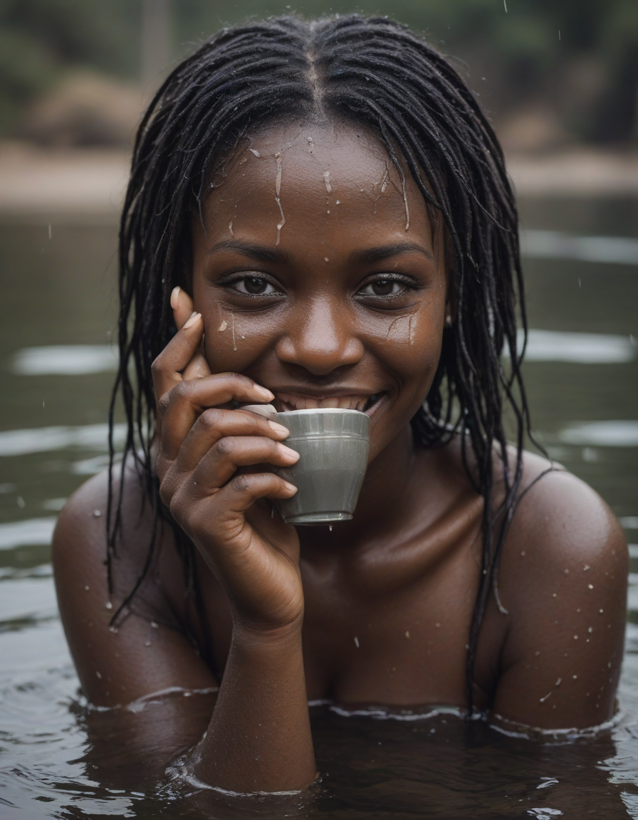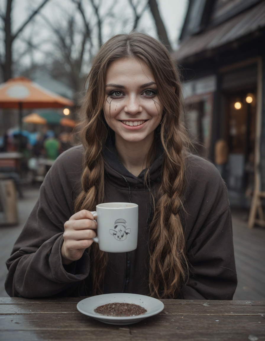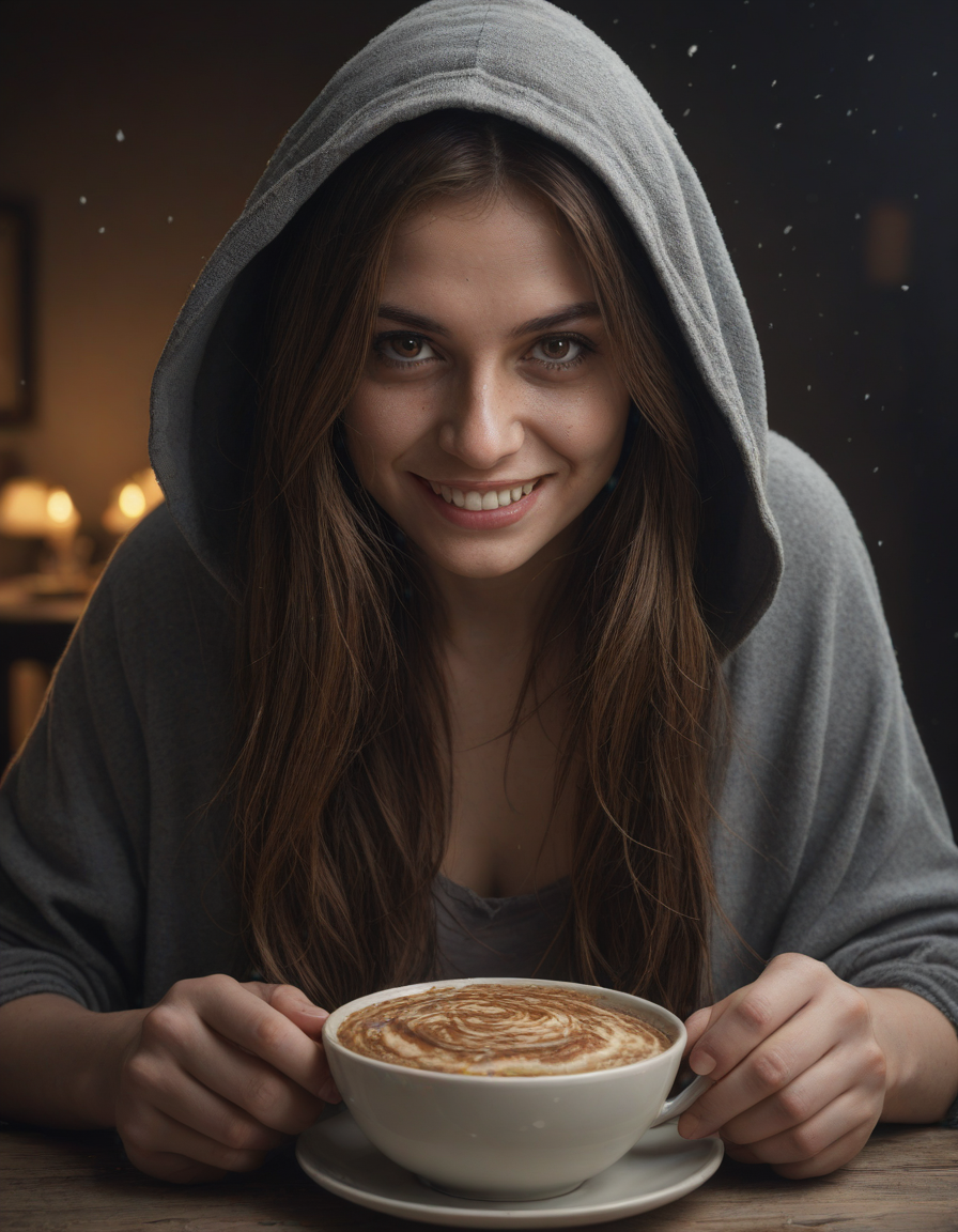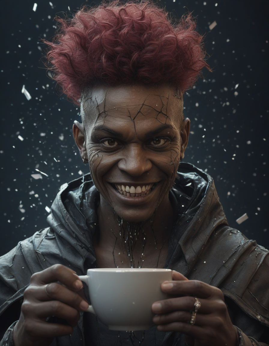 creepy smile, ogre, shattered glass, Eyes that sparkle like diamonds, Cloaked in darkness, sipping coffee
