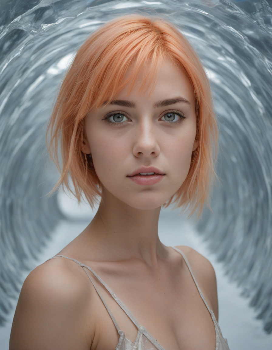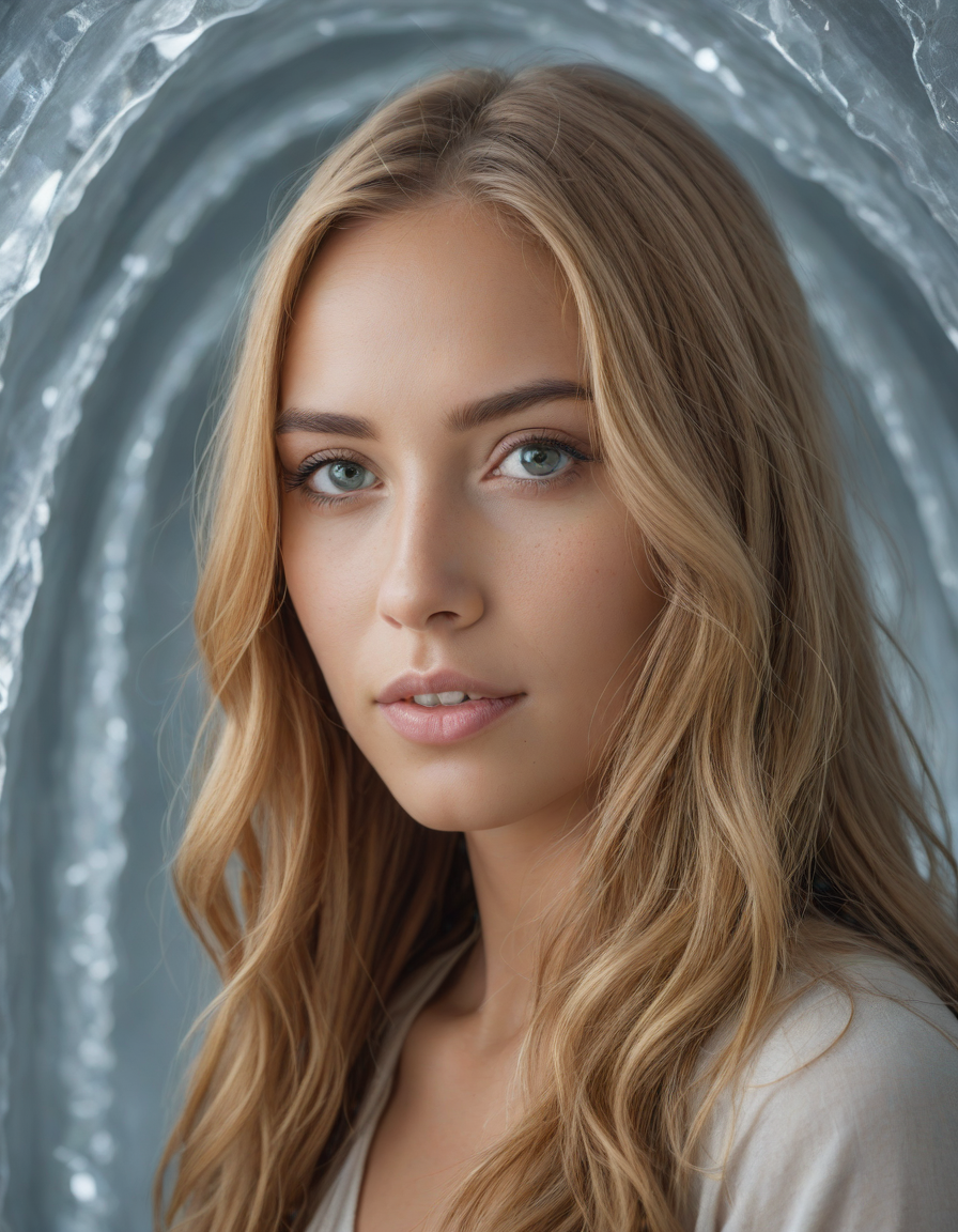 piercing gaze, agitated brows, beauty embodied, cladorned in rugged plate mail, cheerful, glowing ice tunnel