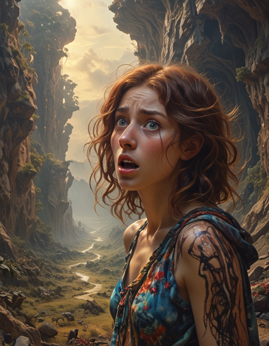 closeup view, limited background, shallow depth of field→bird's eye view, tiny detailed landscape, vast expansive vista
