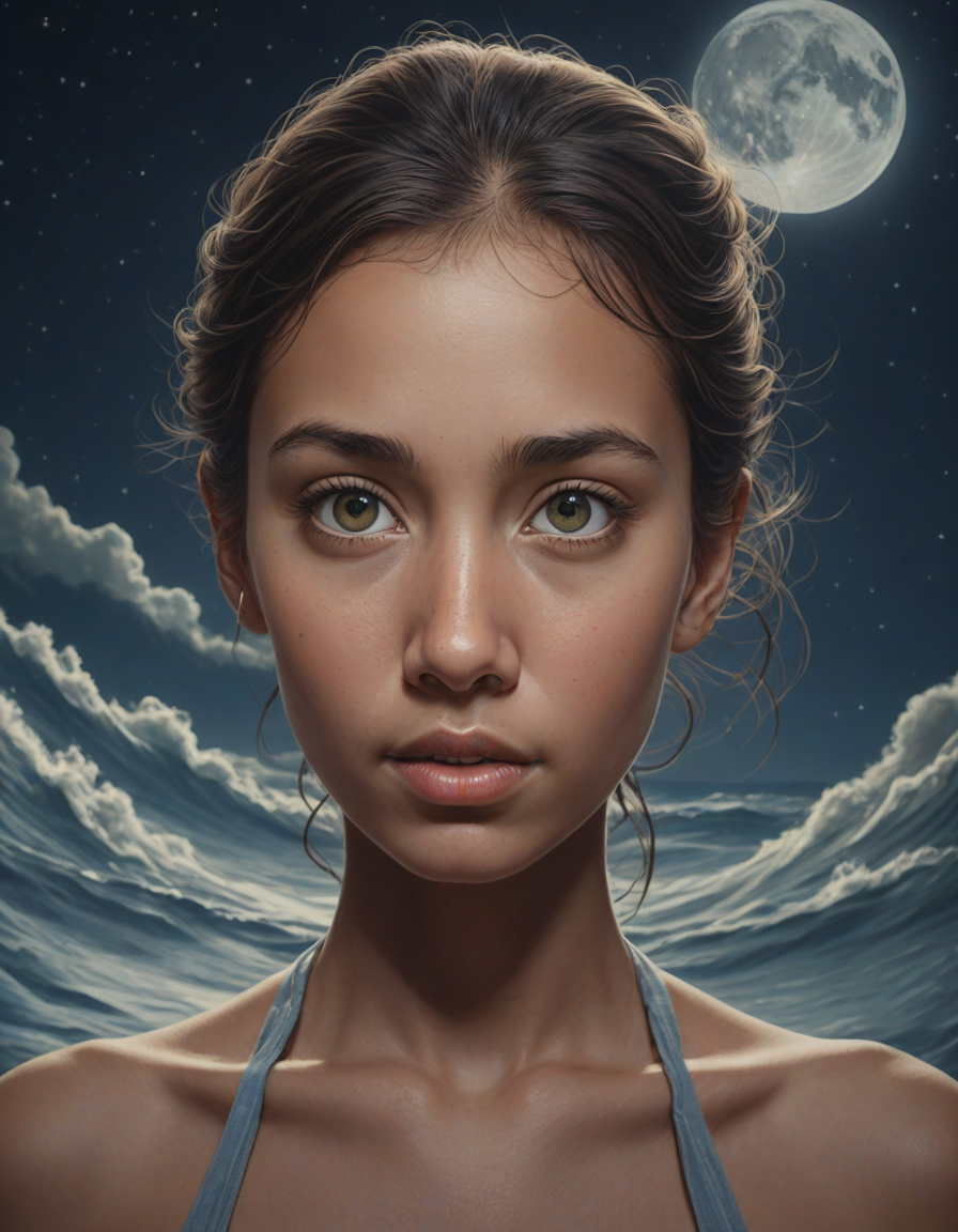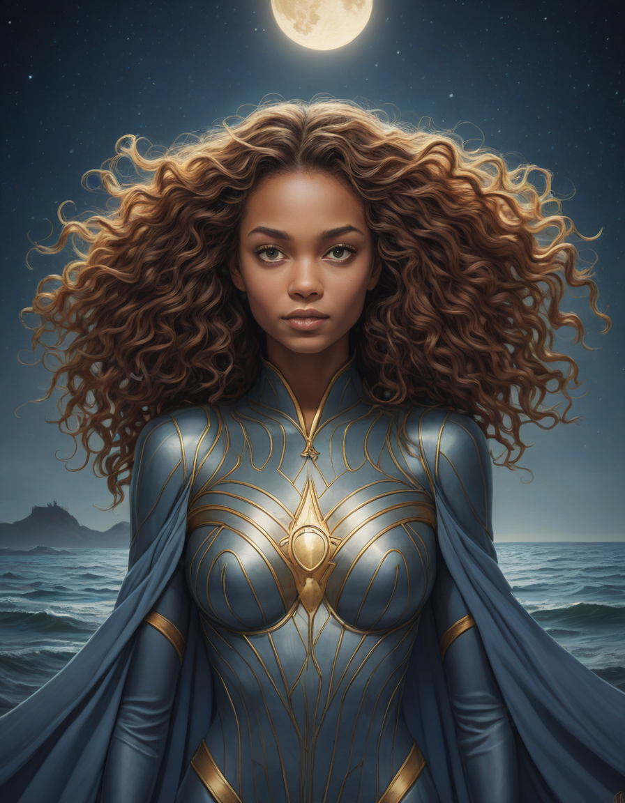 cel-shaded, eyes wide with wonder, superhero, Moonlight on restless waves, glowing with wonder and hope