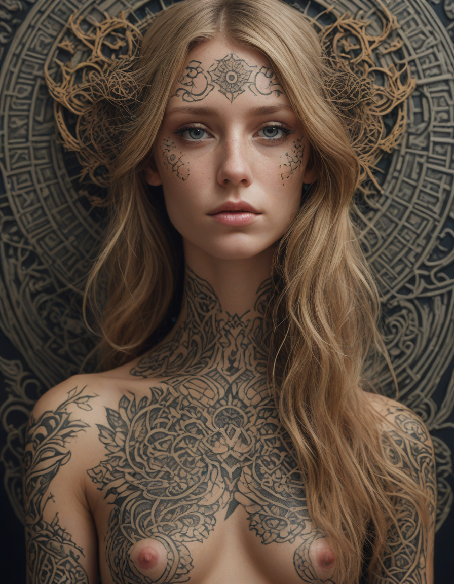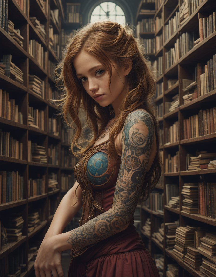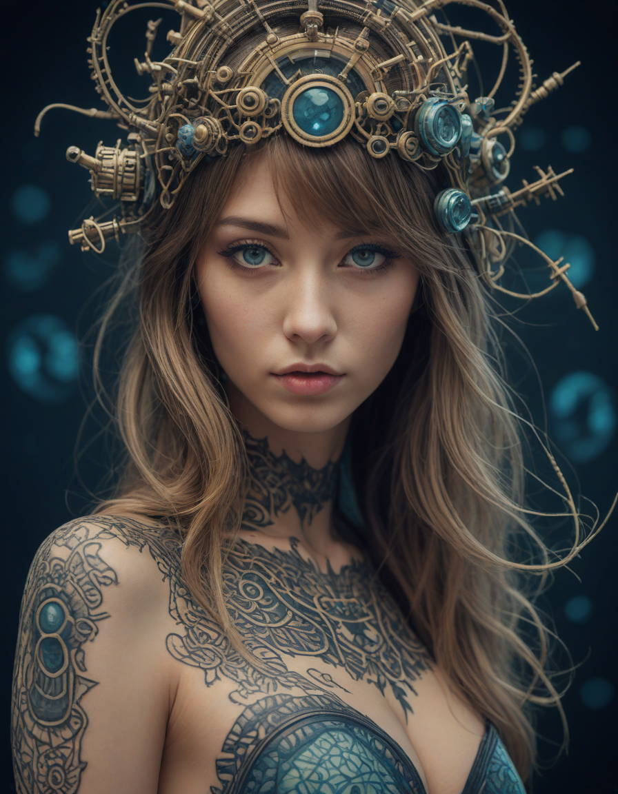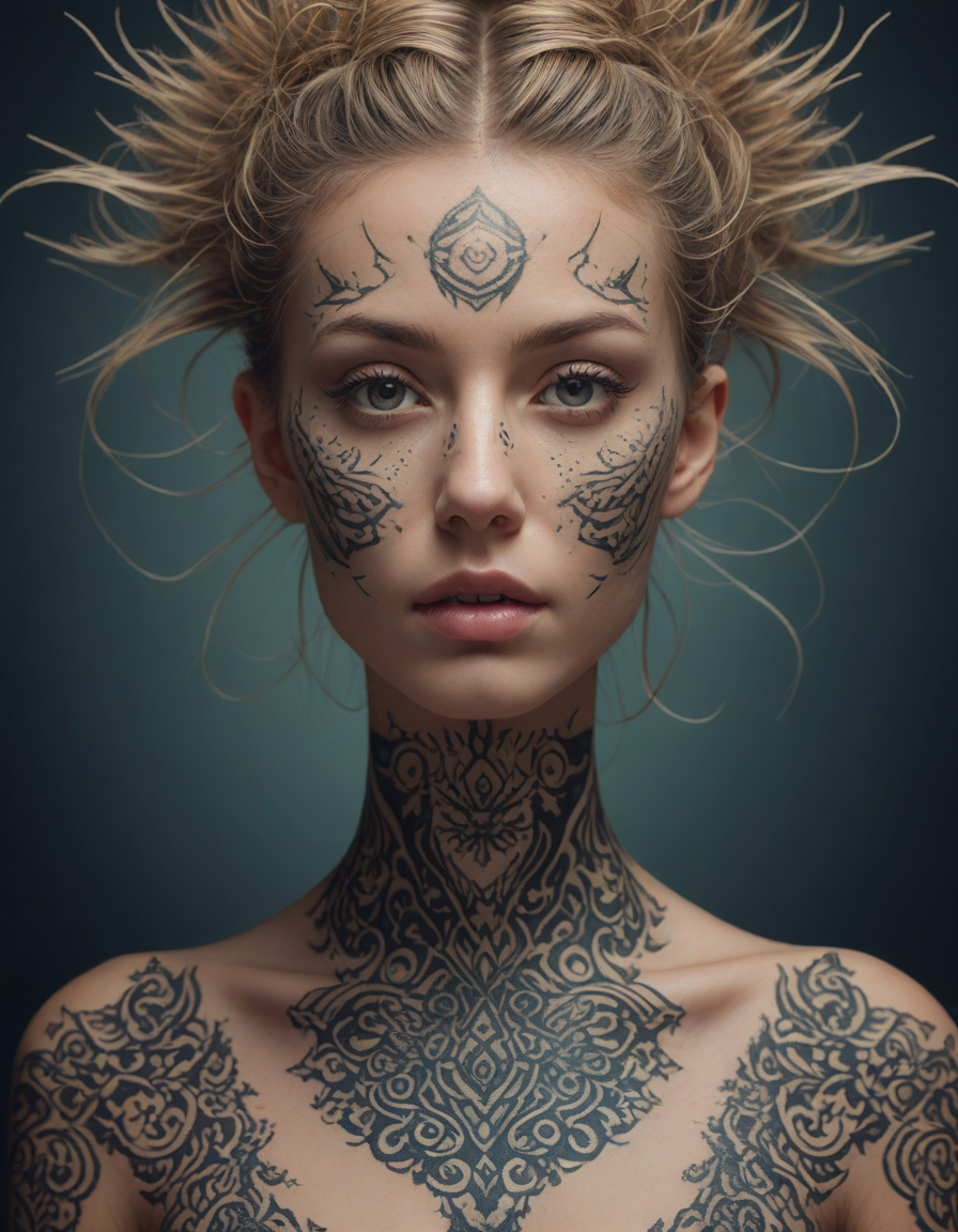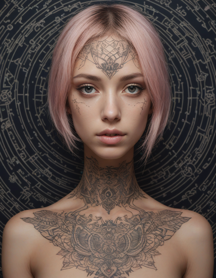 pixelated, intricate, surreal digital illustration, whimsical tattoos, super telephoto lens