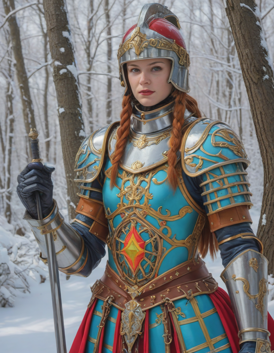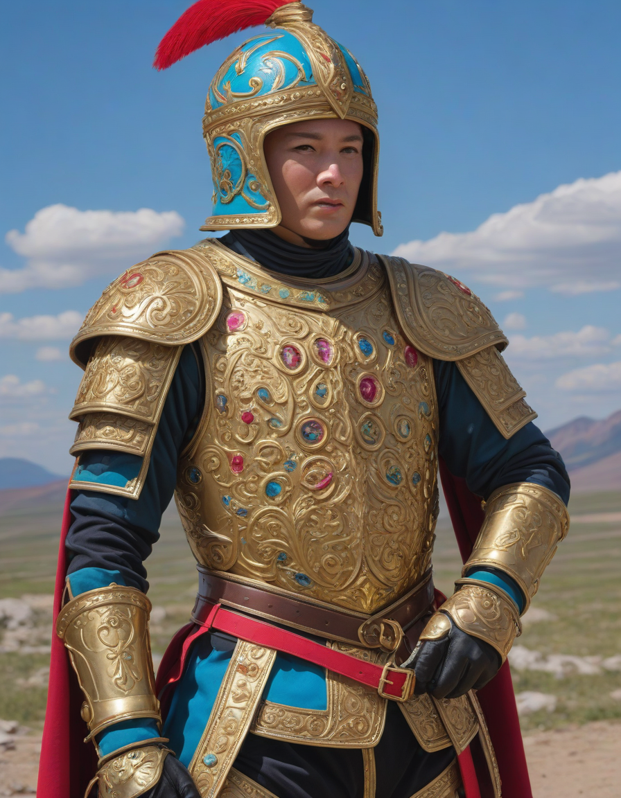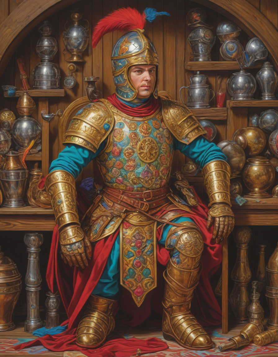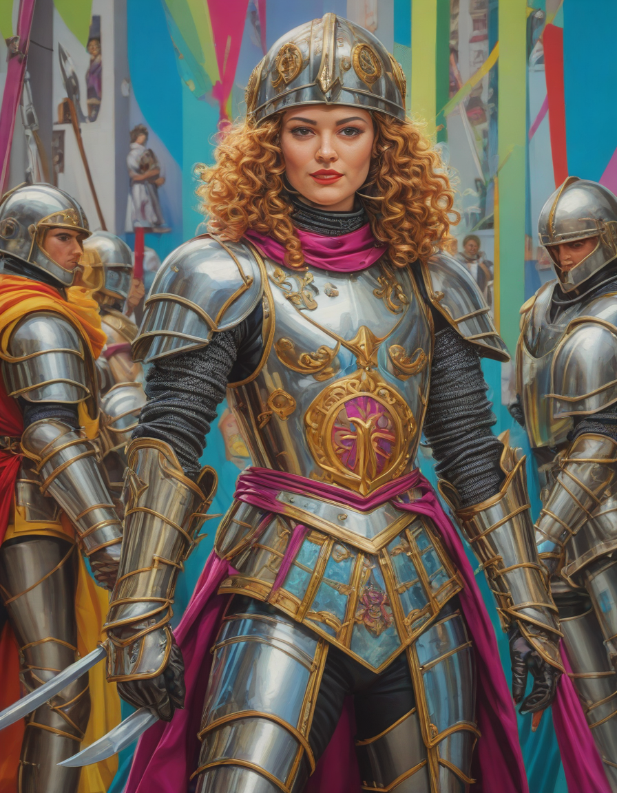 Wearing helmet, Wearing breastplate, Wearing gauntlets, Wearing greaves, Wearing pauldrons, Wearing vambraces, Wearing cuisses, Wearing sabatons, Wearing gorget, Wearing tassets, Wearing bracers, Wearing cuirass, Wearing faulds, Wearing plackart, Wearing spaulders, Wearing besagews, vibrant, colorful pop art piece