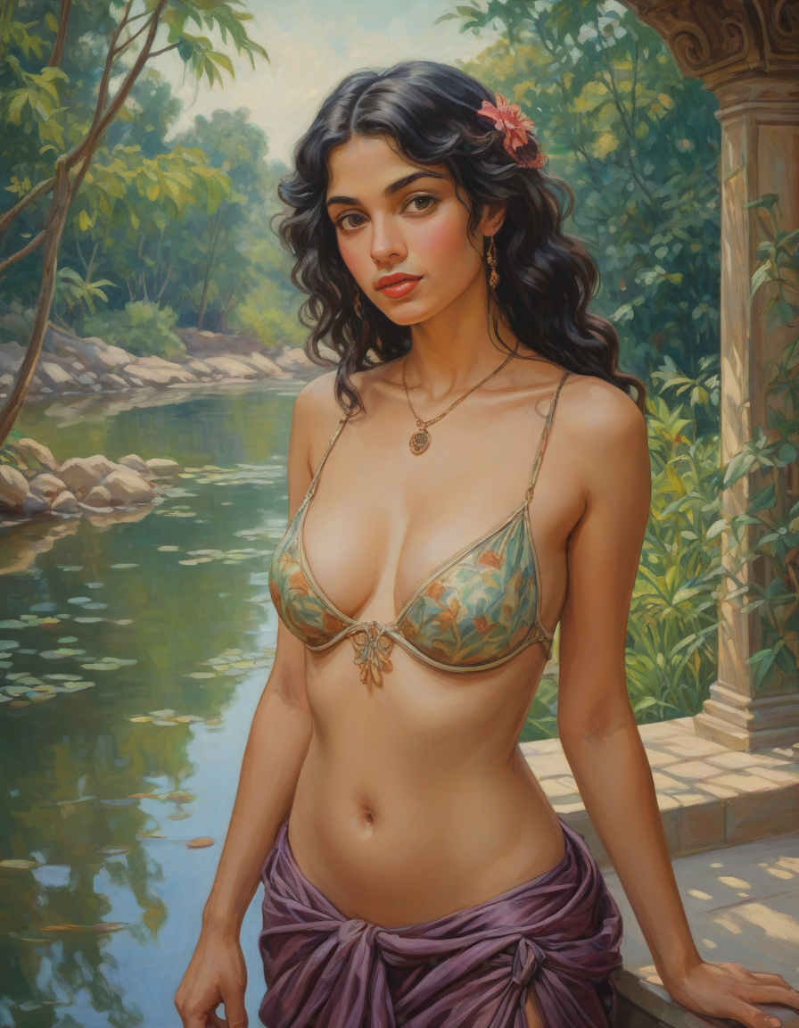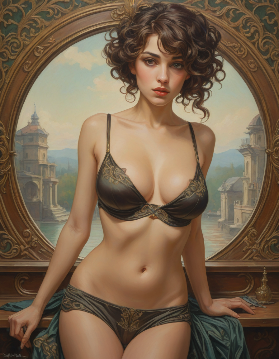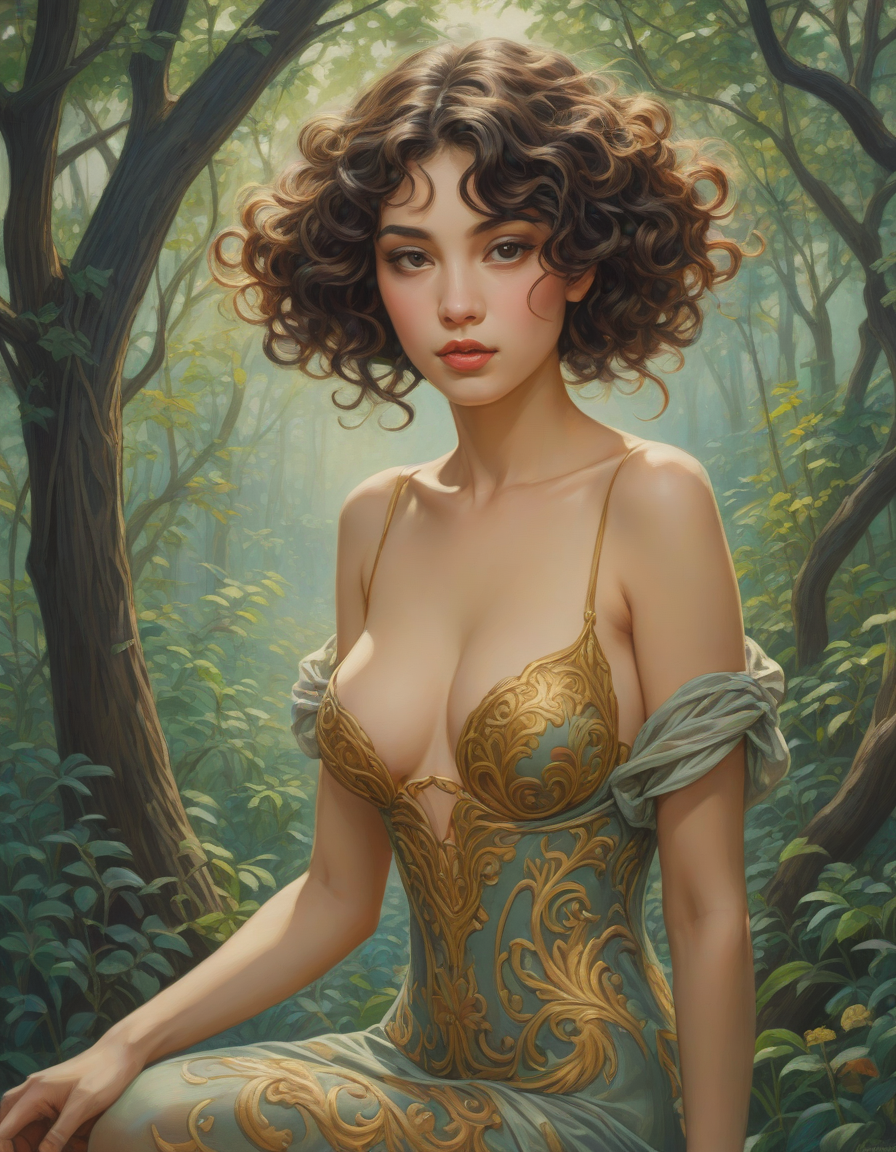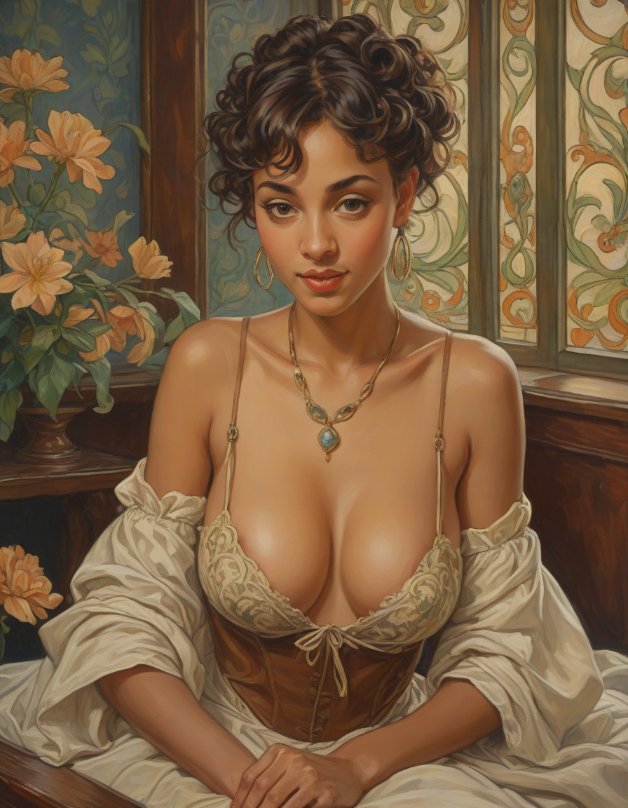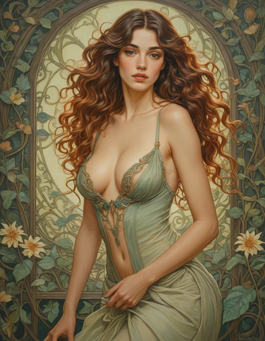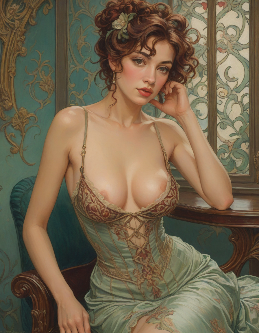 art nouveau style, impressionistic, dynamic composition, excessive cleavage, low neckline, revealing chest, revealing cleavage, cleavage-baring, revealing, excessively revealing, very revealing, lowcut, lowrise,