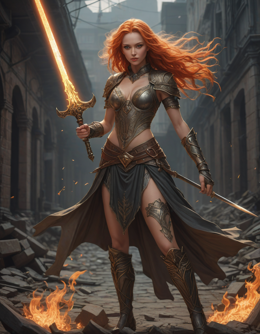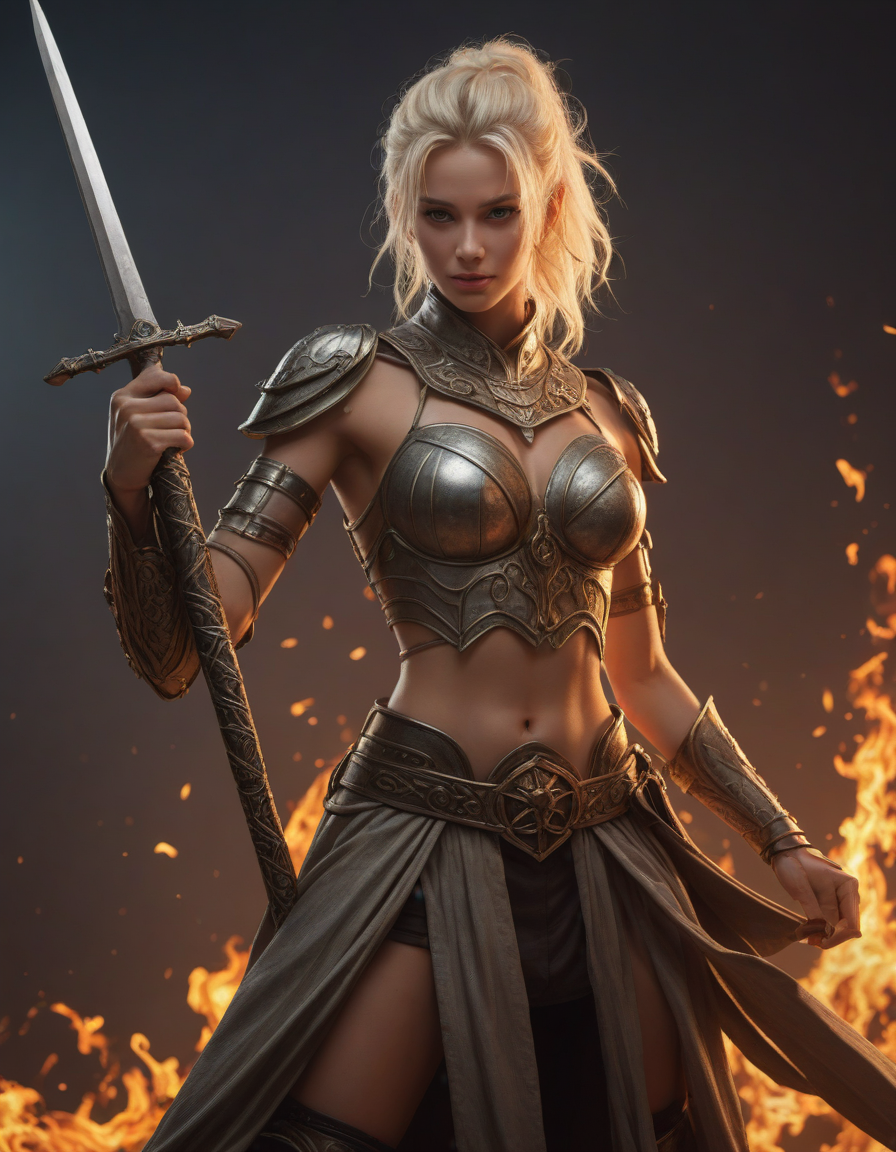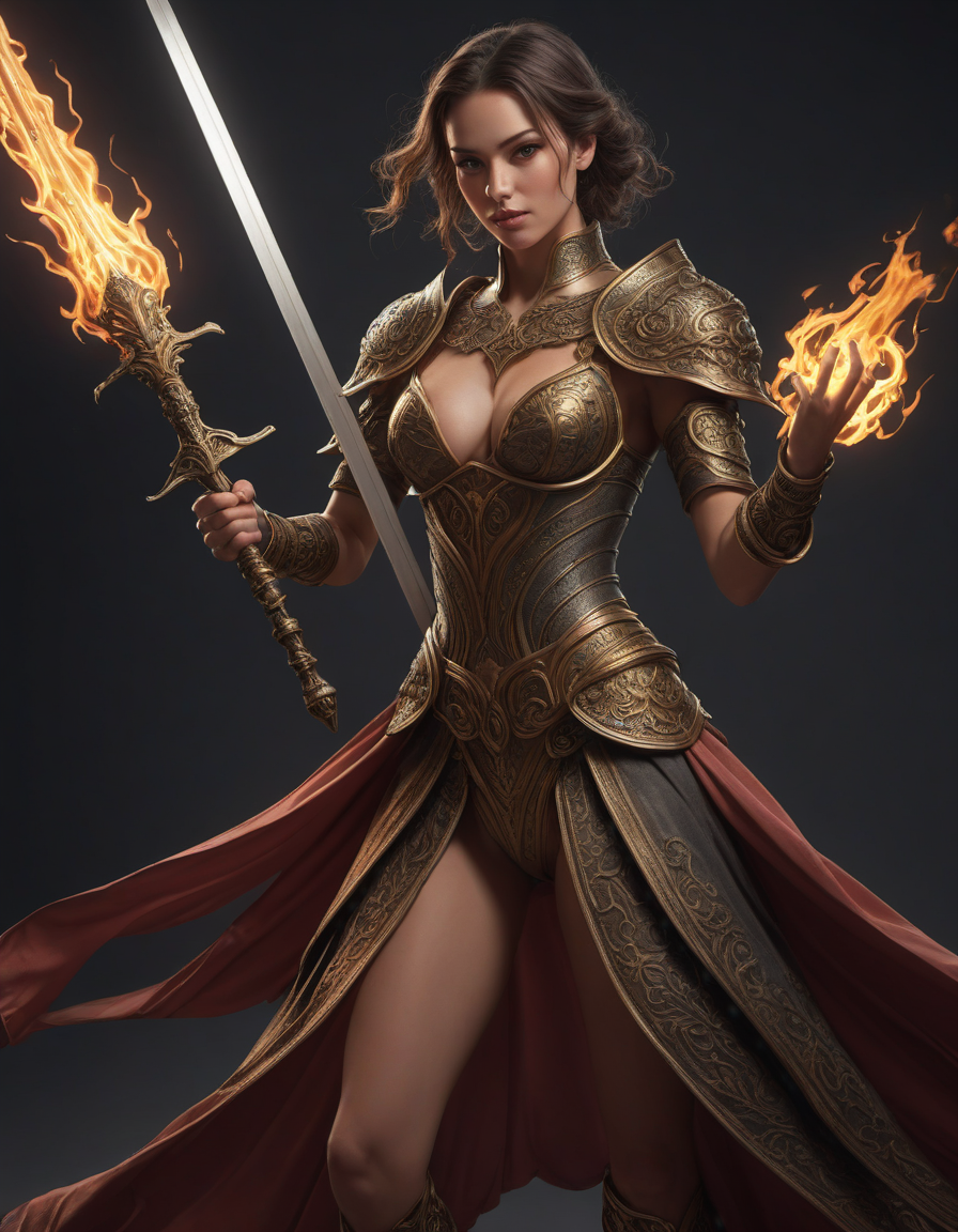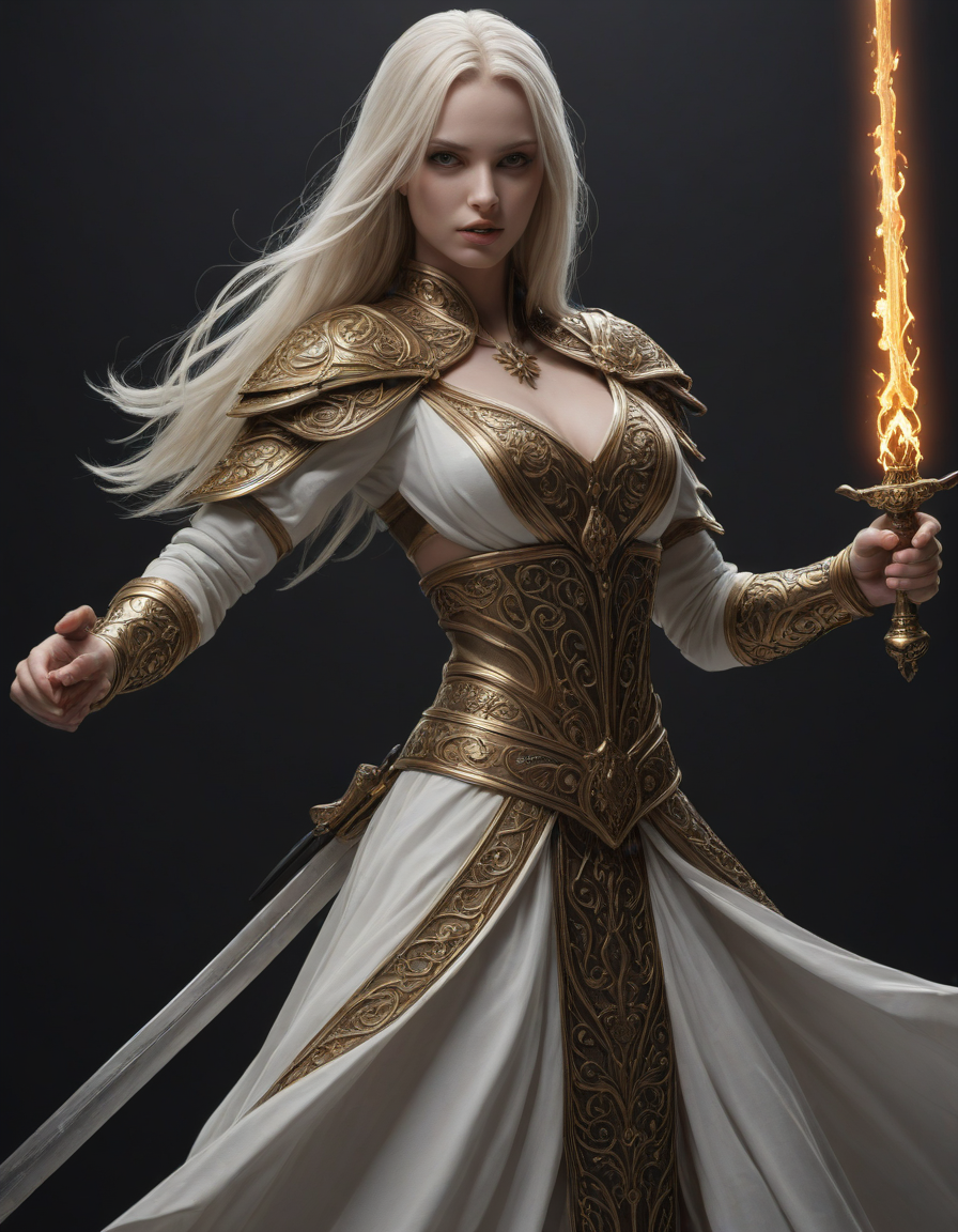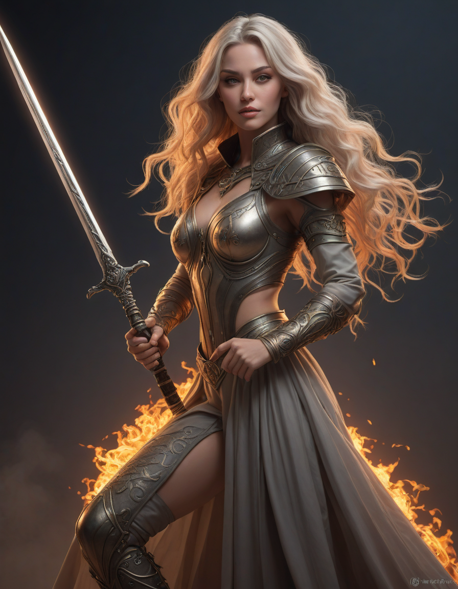 dancing flames, Blinding light highlighting mysterious figure, Holding a sword in both hands in a confident pose, detailed grip, detailed fuller, detailed pommel, detailed blade, detailed edge, , Gratitude