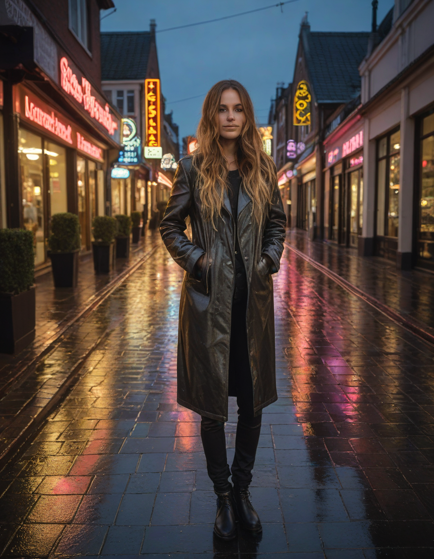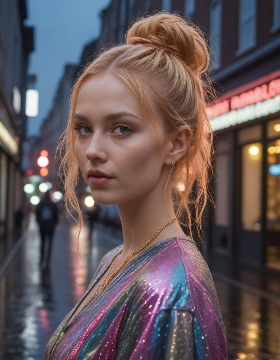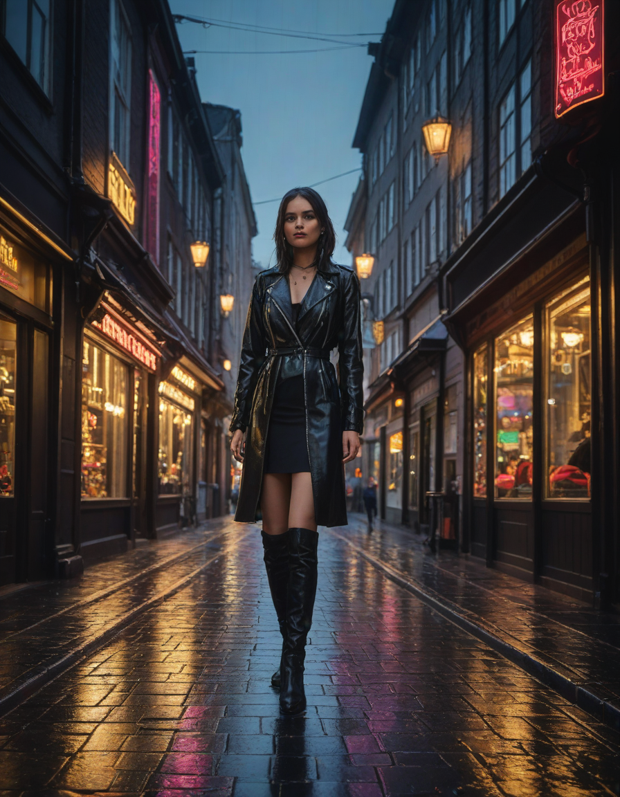 In Midgaard, bling grill, Rain-streaked pavement, neon lights reflecting