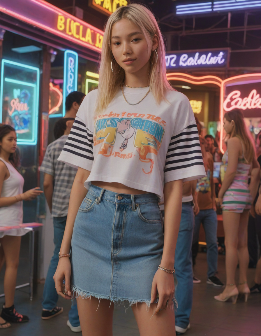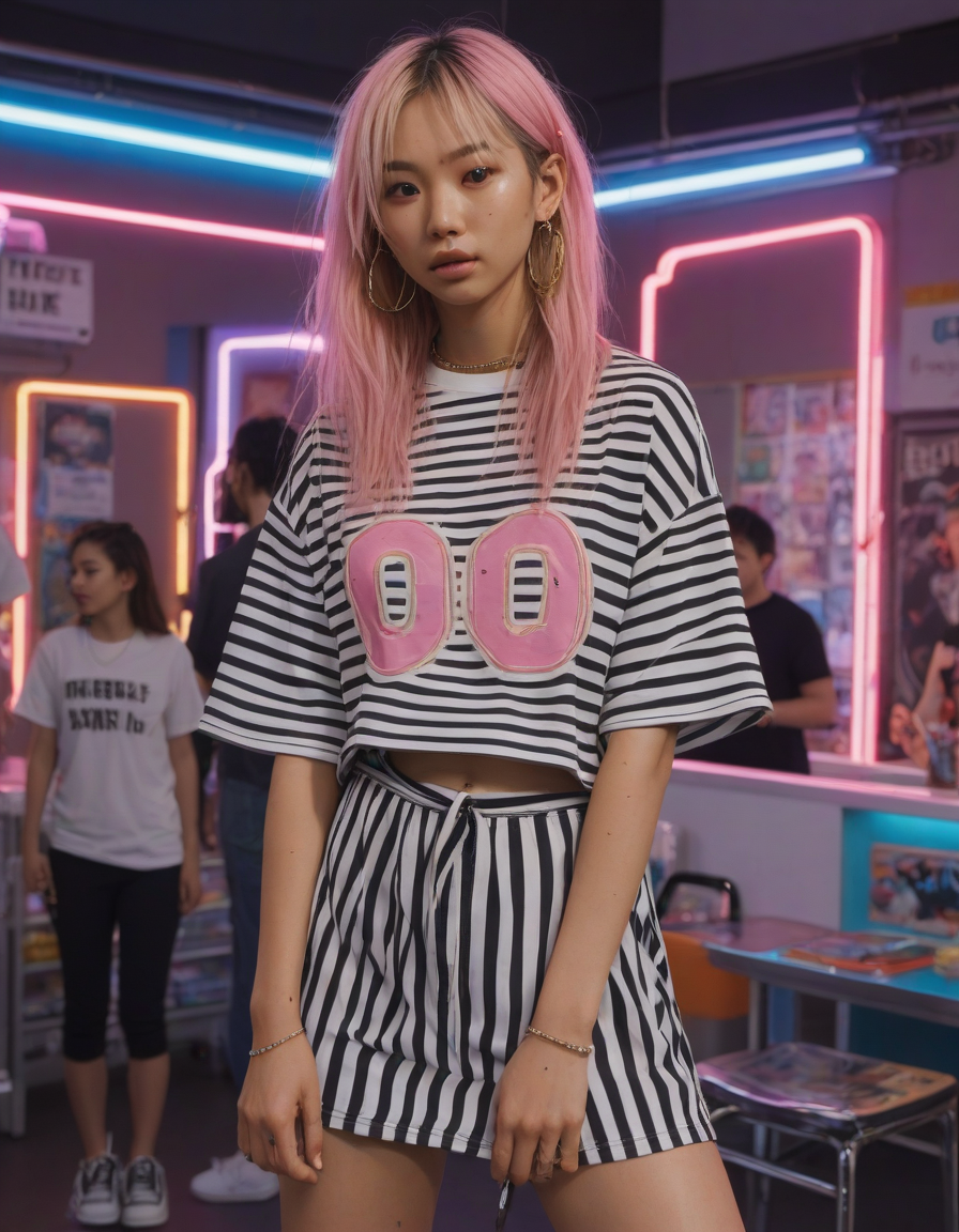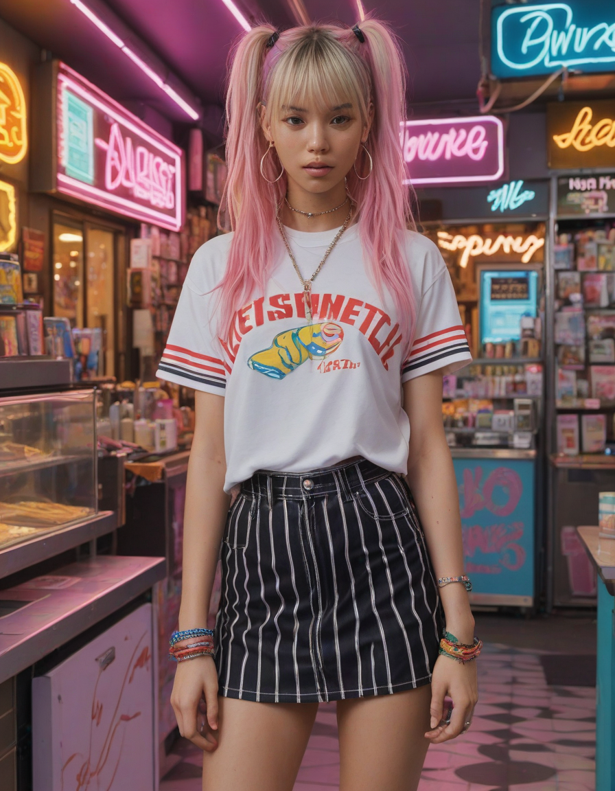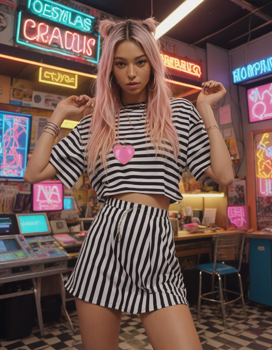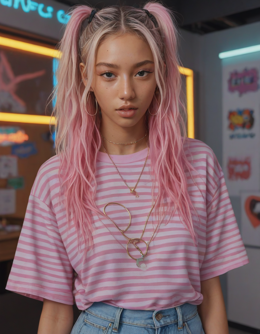 life of the party, Visualize a photorealistic portrayal of an 18-year-old high school senior girl, epitomizing the e-girl aesthetic with a blend of internet culture's vibrancy and personal audacity. Clad in an oversized striped shirt under a black graphic t-shirt dress, her style is a testament to e-girl fashion's layered intricacy, complemented by fishnet tights and chunky boots. Her makeup features dramatic winged eyeliner, neon eyeshadow, and dark lipstick, with blush bringing her face to life. Accessories like silver chains and a heart pendant choker, along with pastel or neon hair streaks, enhance her playful rebellion. Standing hands-on-hips, she exudes confidence and individuality against a backdrop suggestive of e-girl life, with neon signs and string lights. This scene captures her bold identity and expressive spirit at this pivotal moment.