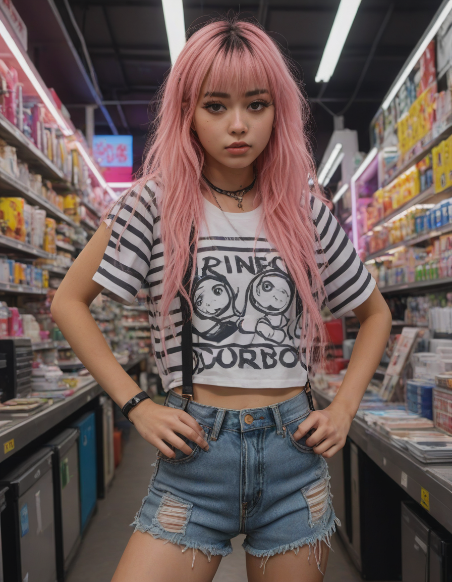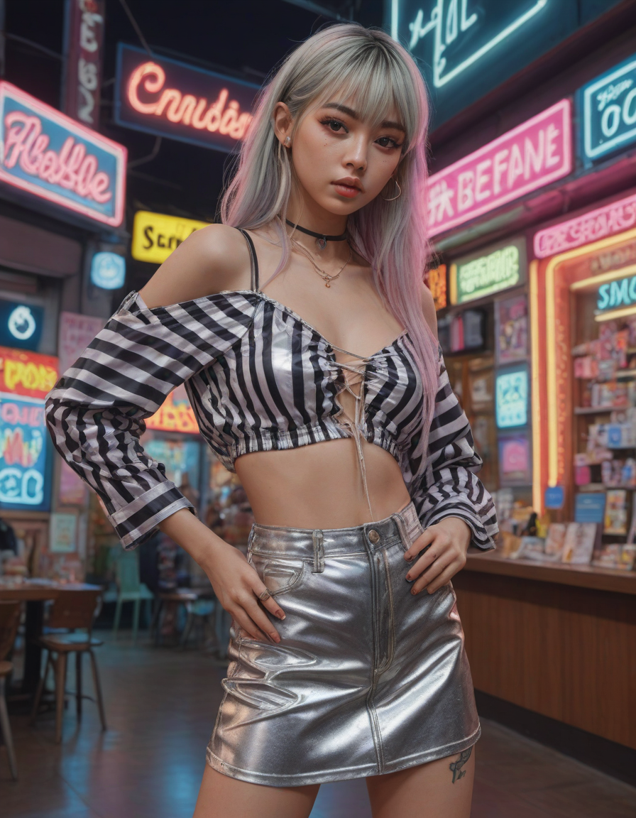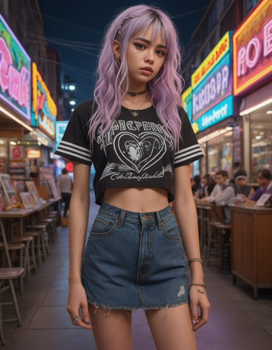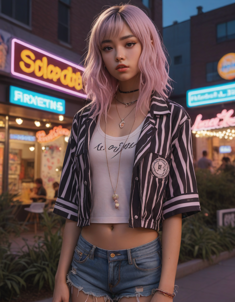 rich, detailed open-world environment, Visualize a photorealistic portrayal of an 18-year-old high school senior girl, epitomizing the e-girl aesthetic with a blend of internet culture's vibrancy and personal audacity. Clad in an oversized striped shirt under a black graphic t-shirt dress, her style is a testament to e-girl fashion's layered intricacy, complemented by fishnet tights and chunky boots. Her makeup features dramatic winged eyeliner, neon eyeshadow, and dark lipstick, with blush bringing her face to life. Accessories like silver chains and a heart pendant choker, along with pastel or neon hair streaks, enhance her playful rebellion. Standing hands-on-hips, she exudes confidence and individuality against a backdrop suggestive of e-girl life, with neon signs and string lights. This scene captures her bold identity and expressive spirit at this pivotal moment., looking at viewer, psychedelic trip, pouting, Flustered blush, A tearful goodbye, glow in the dark, clear