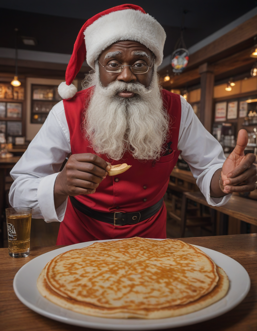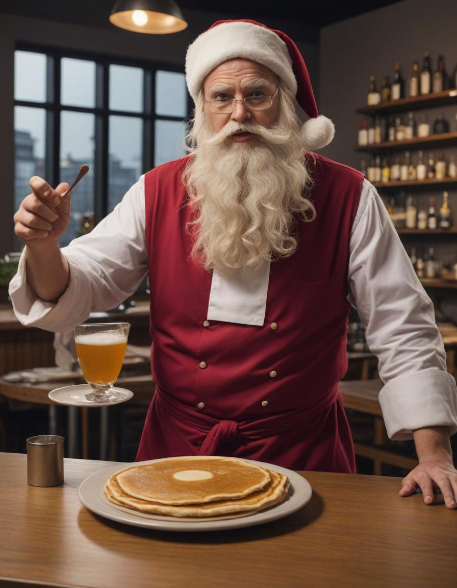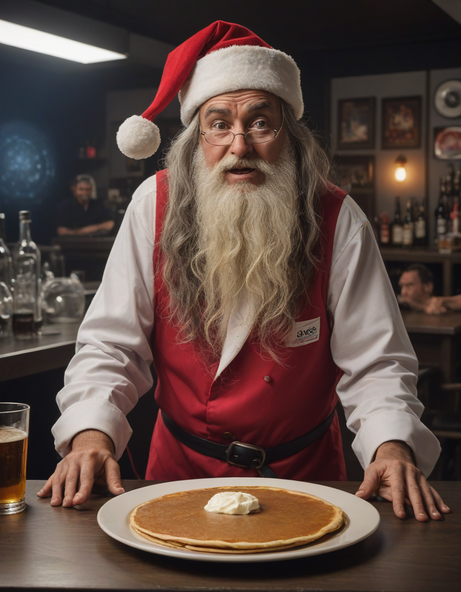 photo of the santa drunk at a bar, offended, gourmet chef flipping a pancake