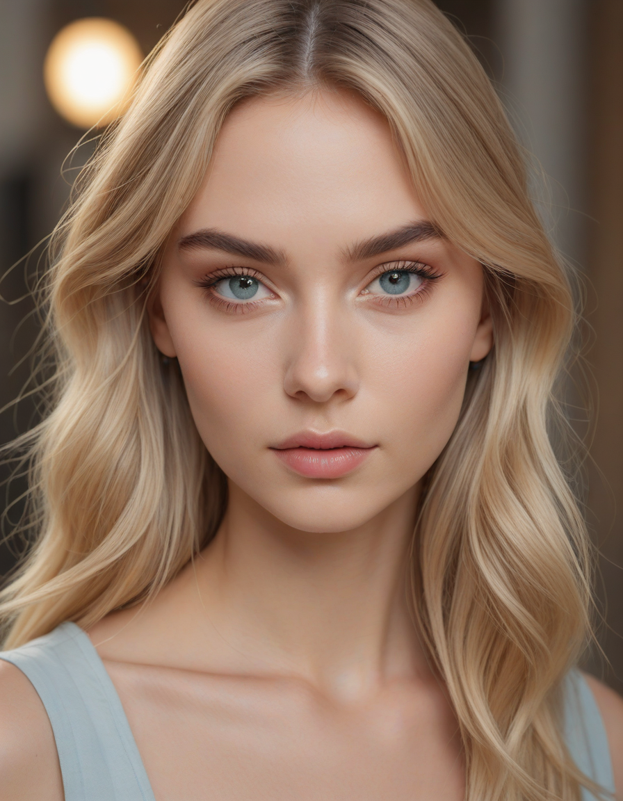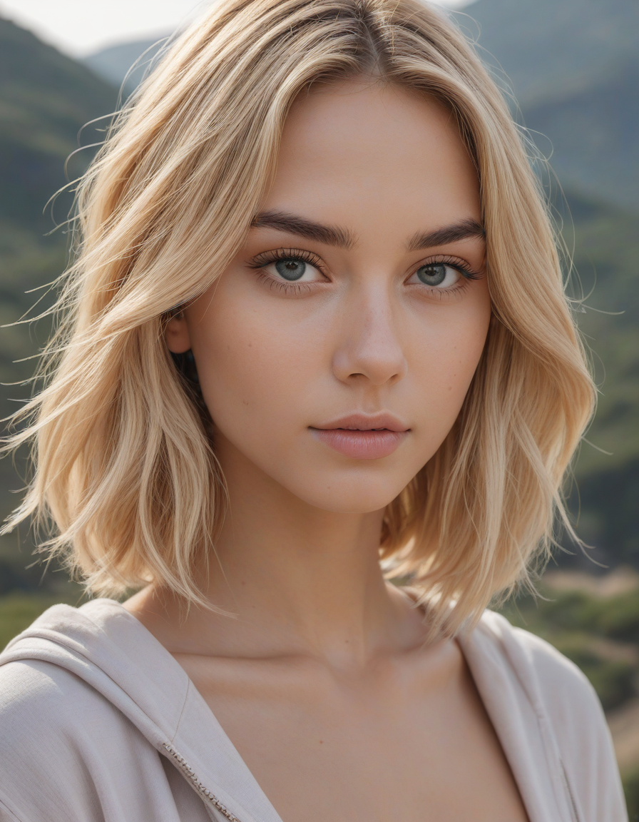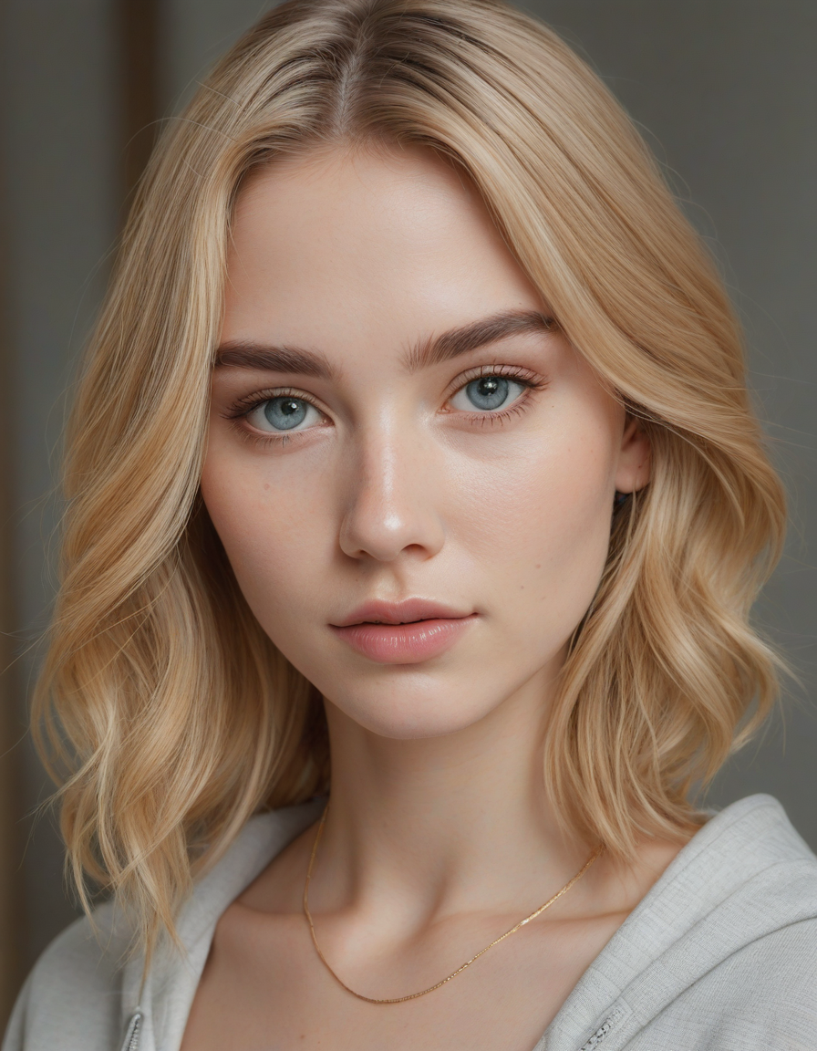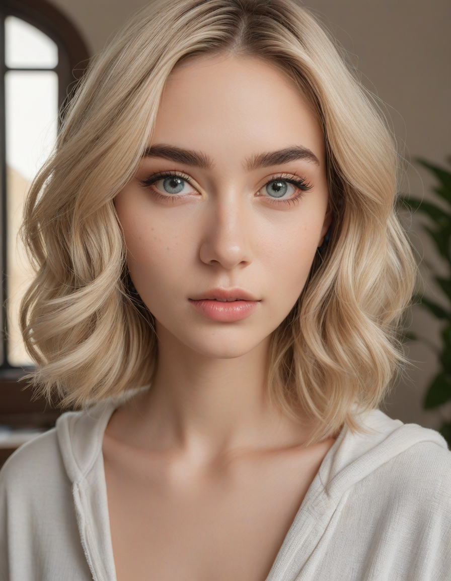 Wielding a one-handed weapon in both hands, one-handed weapon, weapon, , oval face shape, almond-shaped eyes, voluminous lashes, slightly arched eyebrows, narrow nasal bridge, rounded nose tip, symmetrical nostrils, full lips, pronounced cupid's bow, slightly fuller lower lip, defined cheekbones, rounded chin, smooth complexion, softly contoured jawline, balanced facial proportions, symmetrical features, gently curved eyelids, soft brow ridge, harmonious cheek to jawline transition, subtle philtrum, delicate ear lobes, straight blonde hair, clear skin, hooded eyelids, light pink lip color, slightly pouty expression, casual pose with hand on face, slight head tilt, indoor lighting, Light blue irises, Medium-thickness eyebrows, Softly angled eyebrows, A hint of freckles across the nose and cheeks, Natural makeup, Gentle frown lines between the eyebrows, Soft nasolabial folds, Smooth forehead, Subtle dimple on the chin, Clear facial contour without distinct shadows, Even skin tone with a hint of natural pink undertones, Slightly rosy cheeks, Tapered jawline, Fine hair texture with gentle waves, Youthful appearance with soft facial features, brick wall -> great window view