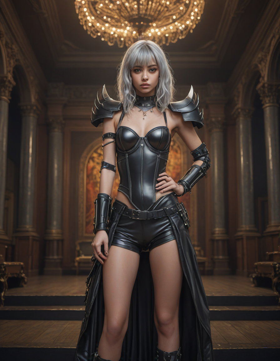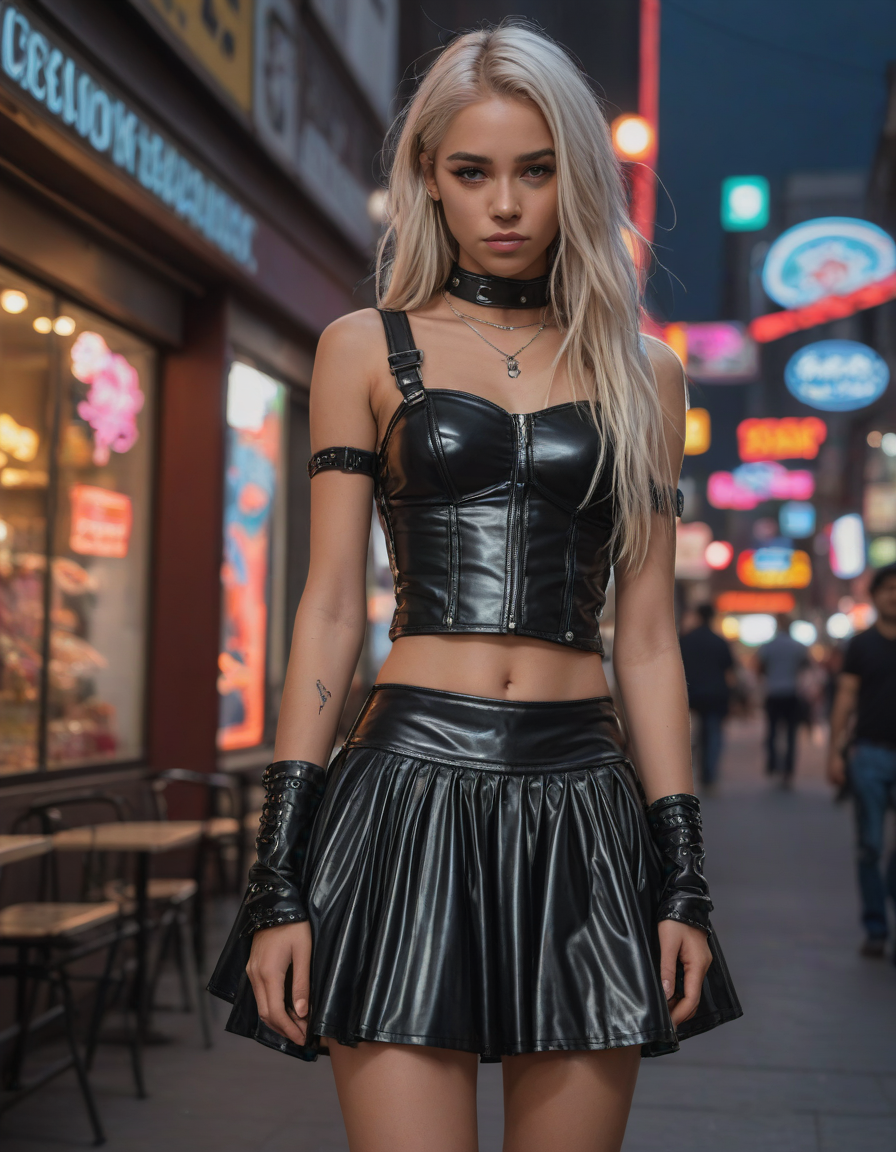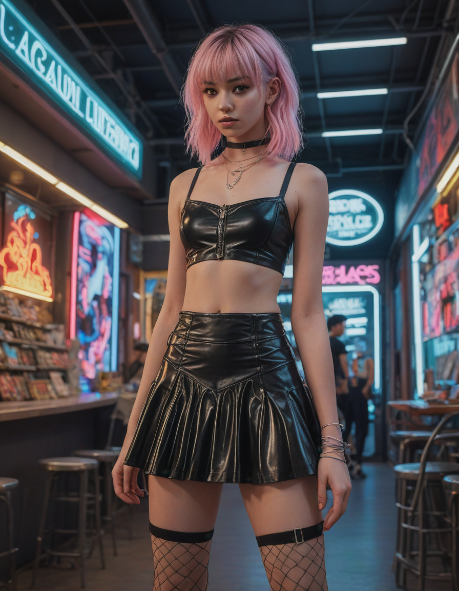 Wide Skirt, wide ballgown hem, a line skirt, petticoat skirt, , Visualize a photorealistic portrayal of an 18-year-old high school senior girl, epitomizing the e-girl aesthetic with a blend of internet culture's vibrancy and personal audacity. Clad in an oversized striped shirt under a black graphic t-shirt dress, her style is a testament to e-girl fashion's layered intricacy, complemented by fishnet tights and chunky boots. Her makeup features dramatic winged eyeliner, neon eyeshadow, and dark lipstick, with blush bringing her face to life. Accessories like silver chains and a heart pendant choker, along with pastel or neon hair streaks, enhance her playful rebellion. Standing hands-on-hips, she exudes confidence and individuality against a backdrop suggestive of e-girl life, with neon signs and string lights. This scene captures her bold identity and expressive spirit at this pivotal moment., wearing complete set of armor, wearing full armor, Wearing chest armor, wearing leg armor, wearing feet armor, wearing bracer, wearing pauldrons,, provocative clothing, slutty clothing, skimpy clothing, revealing clothing, seductive clothing, coquettish clothing, coquettish, seductive, taboo, sheer clothing,