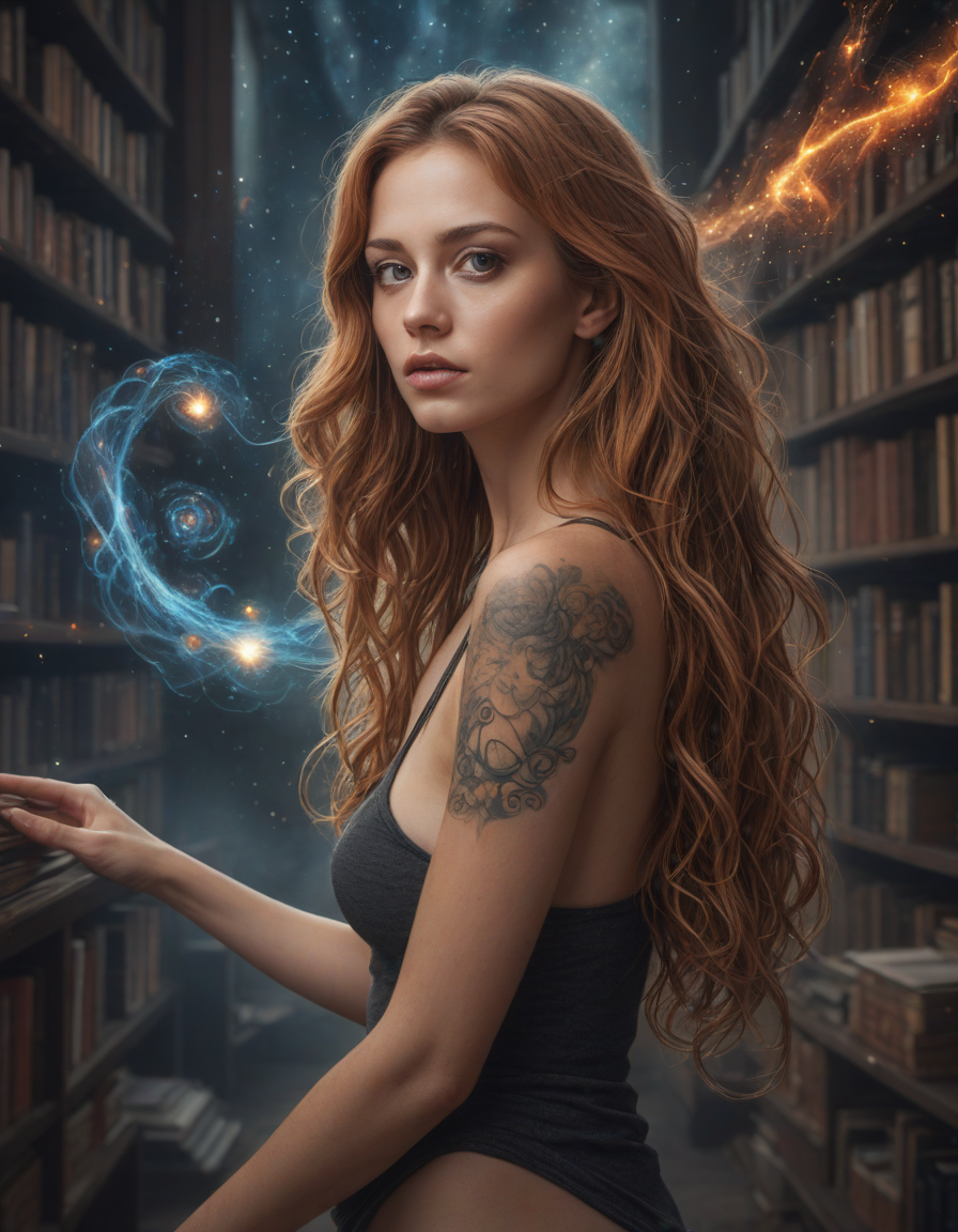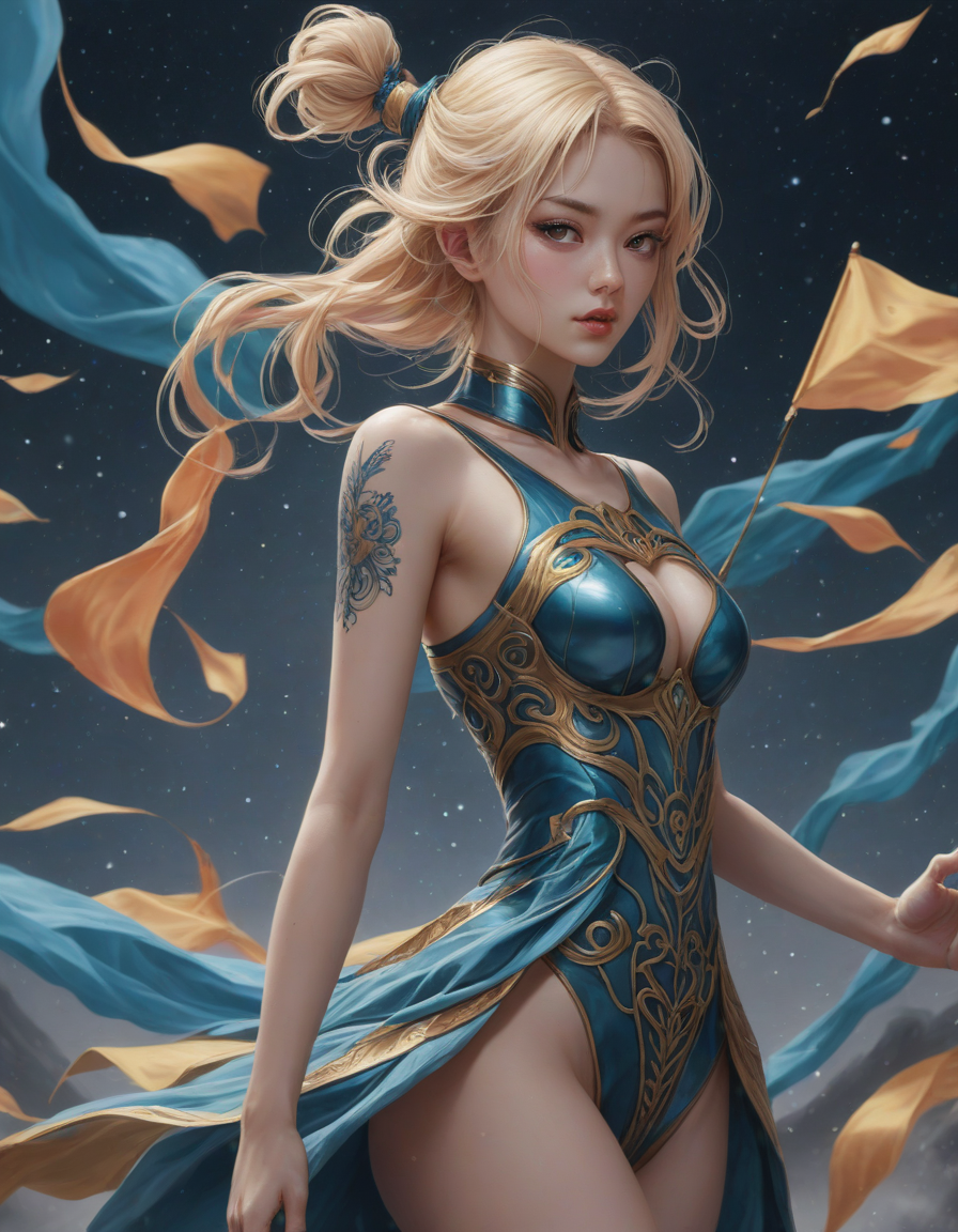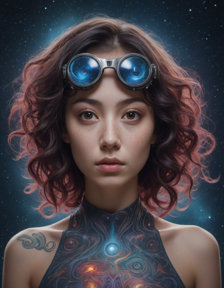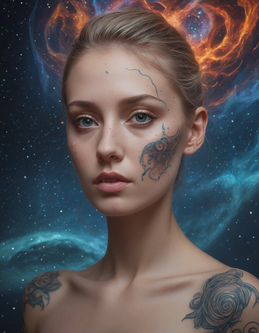 Galactic nebulas swirling, lost in a trance, eyes glued to the horizon, whimsical tattoos, Blinding speed