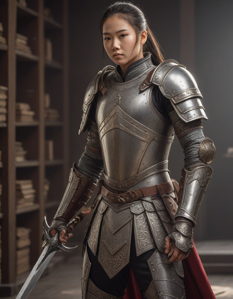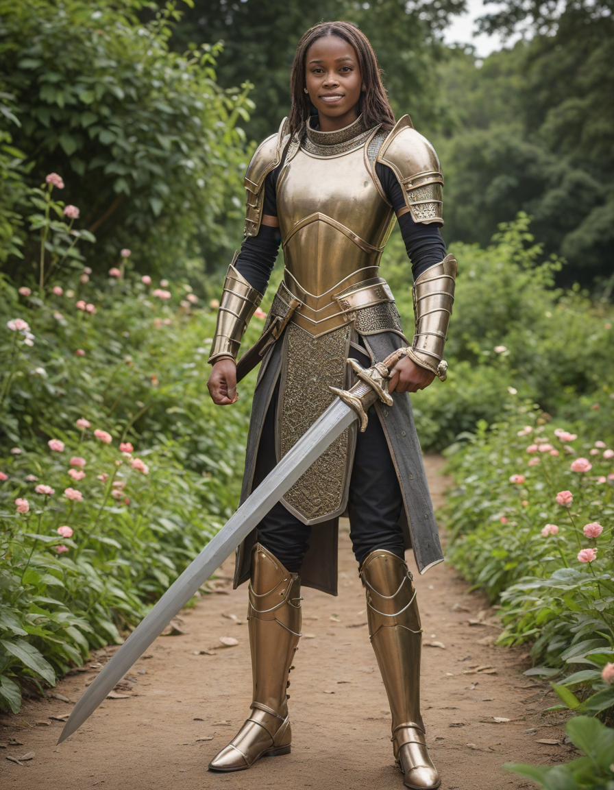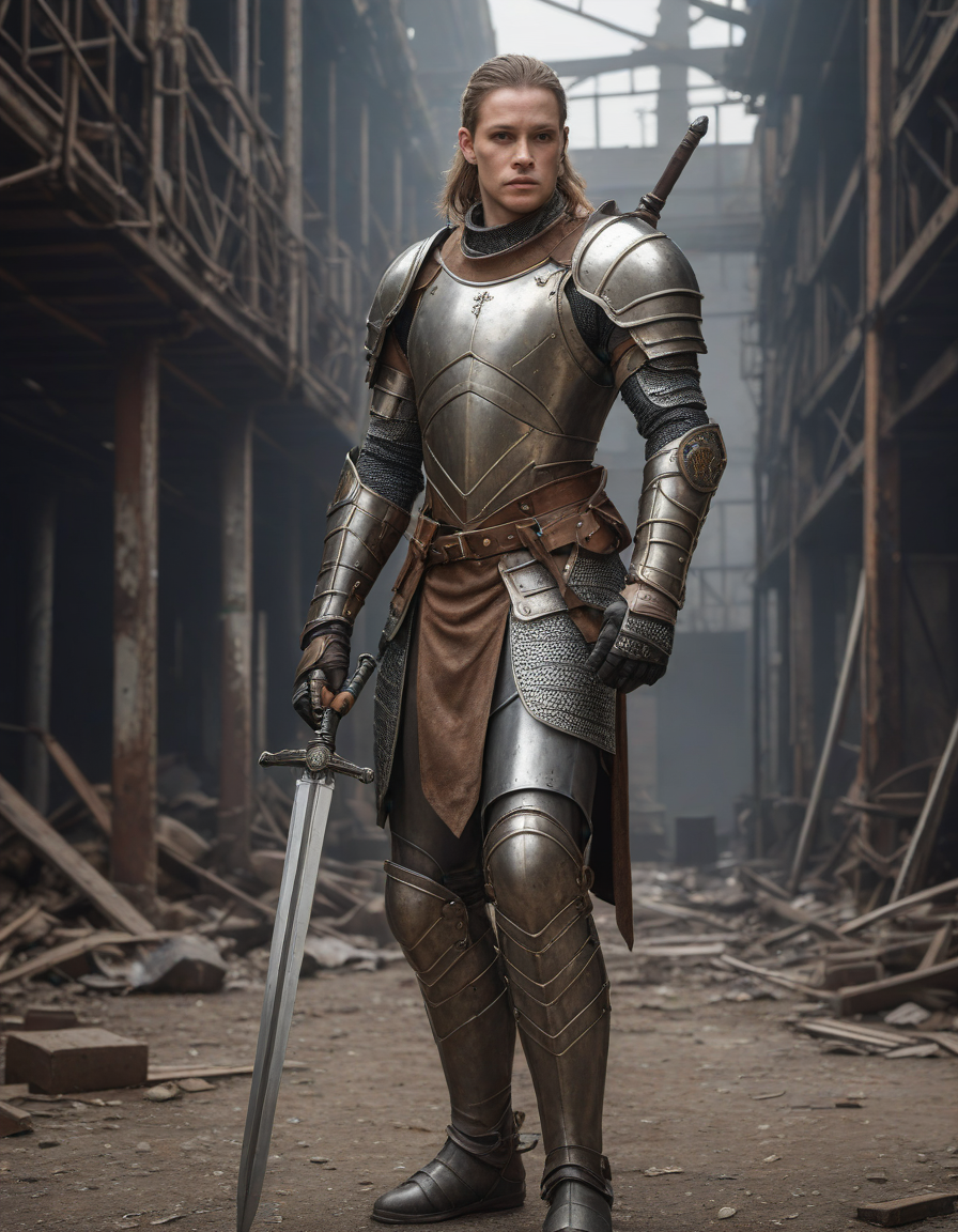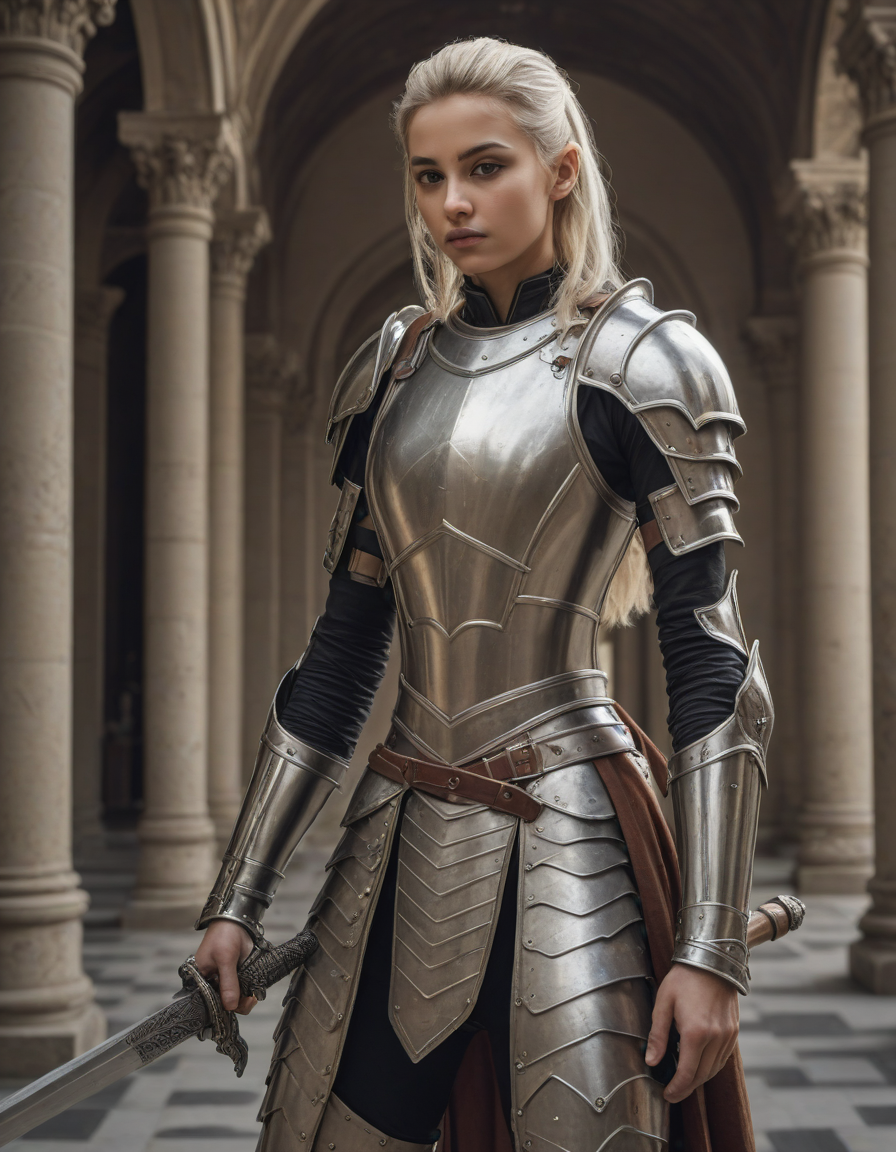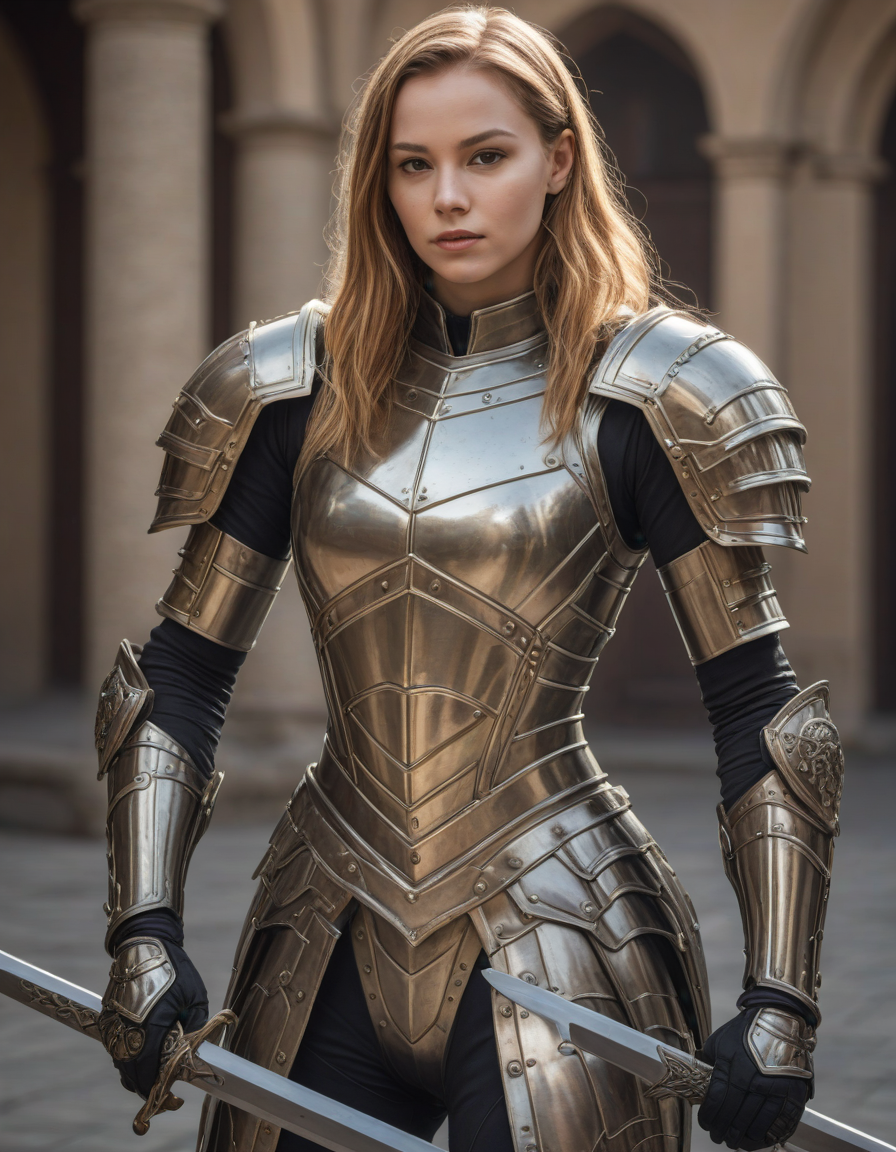 wearing sleeveless leotard, wearing one peice clothing, leotard, sleeveless, , Holding a sword in both hands in a confident pose, detailed grip, detailed fuller, detailed pommel, detailed blade, detailed edge, , wearing complete set of armor, wearing full armor, Wearing chest armor, wearing leg armor, wearing feet armor, wearing bracer, wearing pauldrons, Wearing helmet, Wearing breastplate, Wearing gauntlets, Wearing greaves, Wearing pauldrons, Wearing vambraces, Wearing cuisses, Wearing sabatons, Wearing gorget, Wearing tassets, Wearing bracers, Wearing cuirass, Wearing faulds, Wearing plackart, Wearing spaulders, Wearing besagews