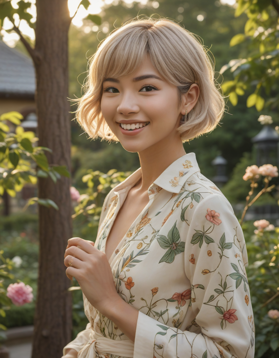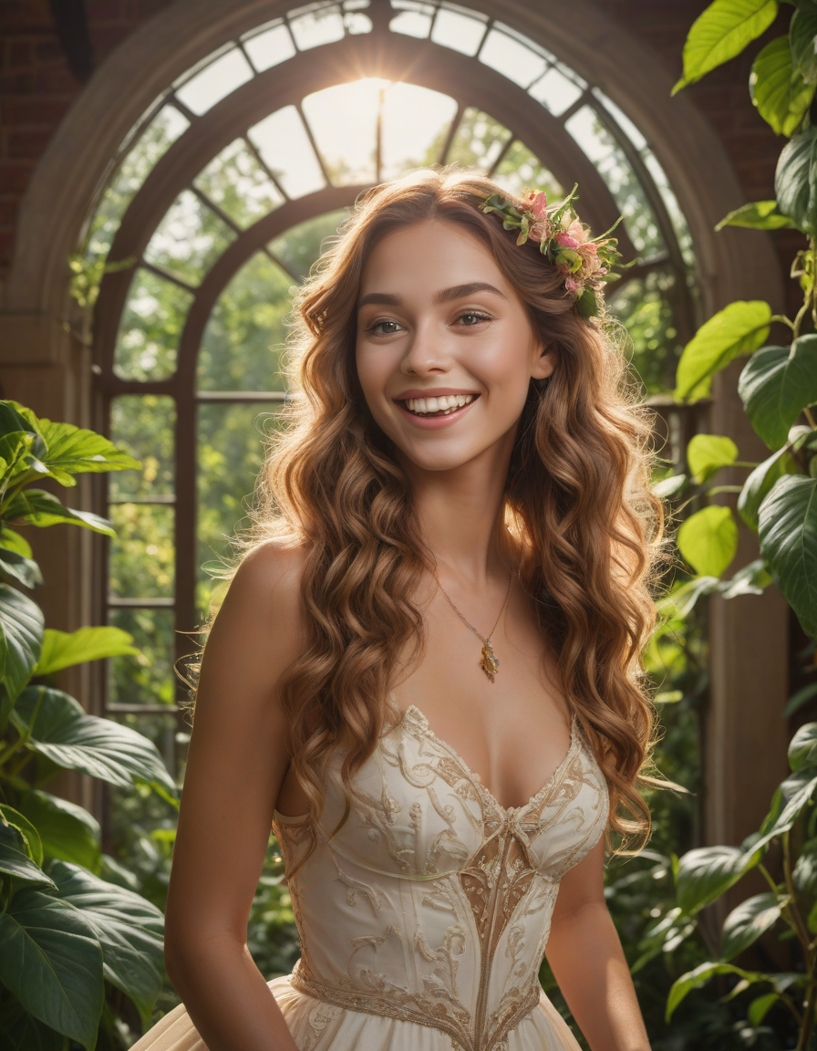 joyful laughing expression, eyes crinkled with mirth, lush garden setting with flowers and vines, dynamic action pose, sense of energetic movement, life of the party, golden hour lighting, fantasy setting, magical, art nouveau, elegant curved lines, nature-inspired motifs, brick wall -> great window view