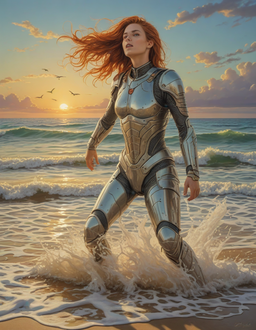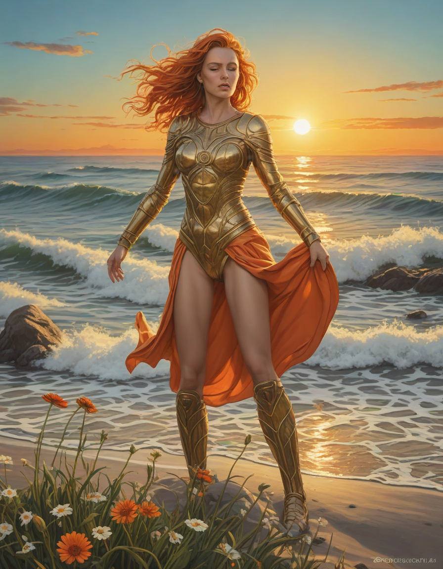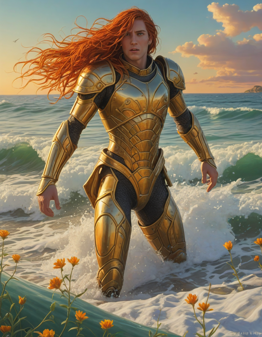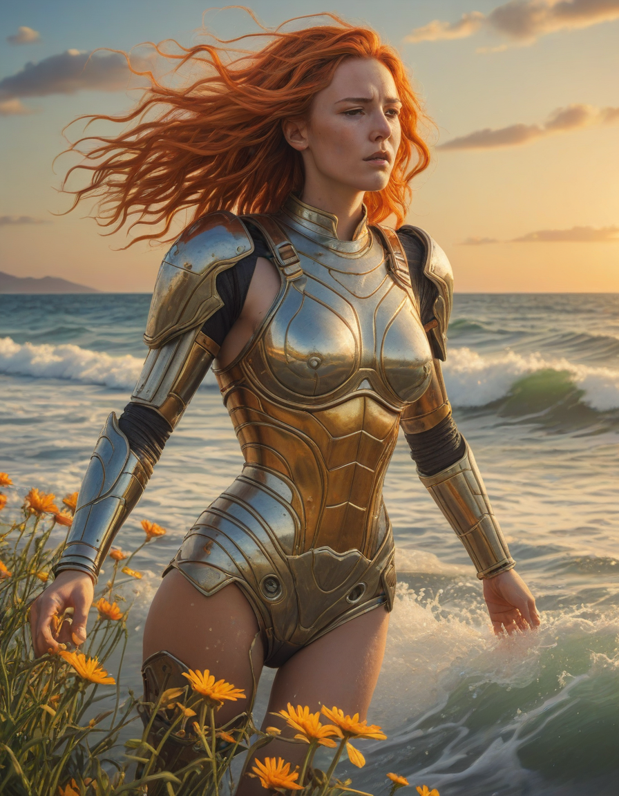 heroic, shining-armored knight, abounding with wildflowers, afraid, Gaia from Italy, medium chin-length wild auburn orange hair