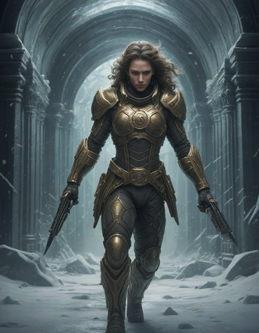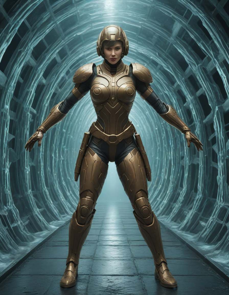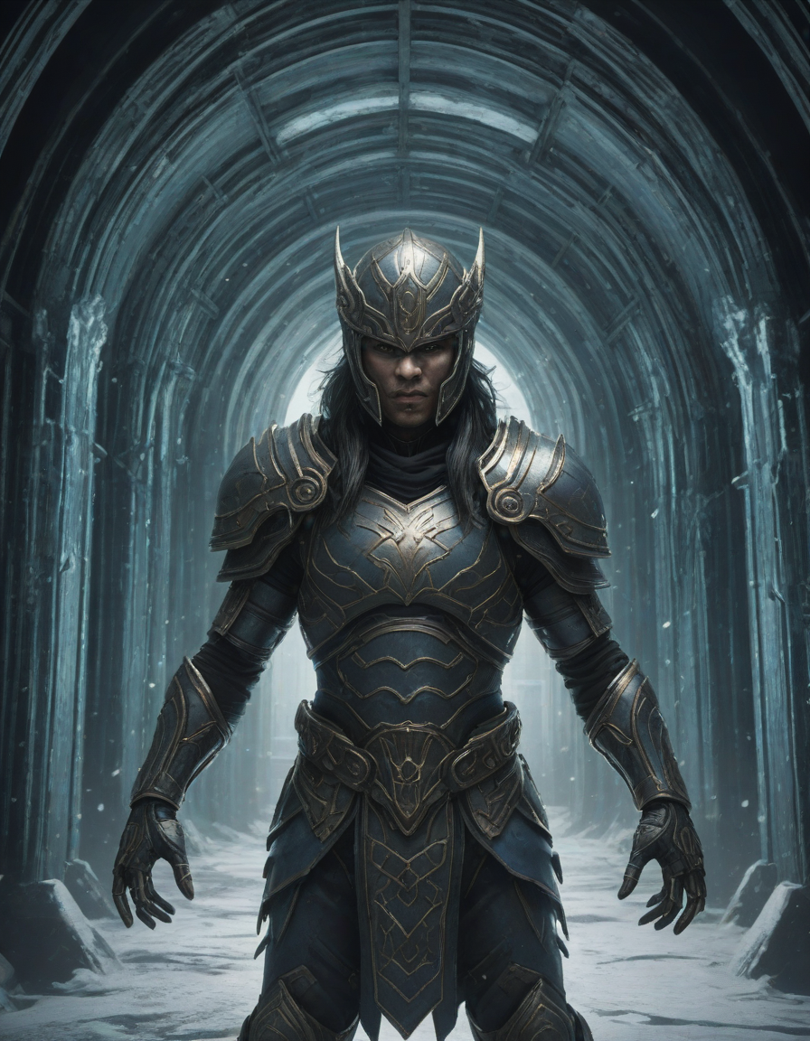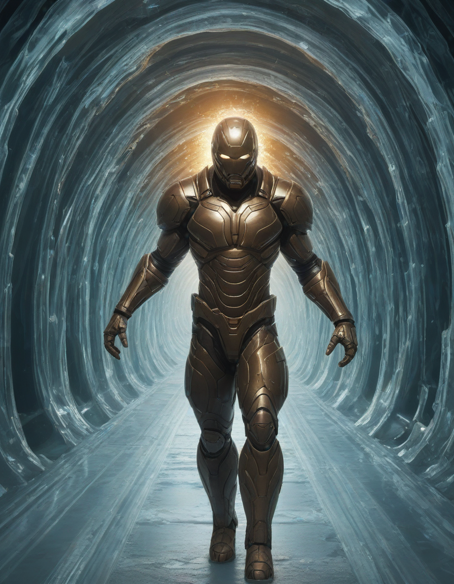 glimmering, doom 3d, pop idol, Unusually vivid, soldier, Tragic hero standing tall, jumping for joy, glowing ice tunnel, symmetrical