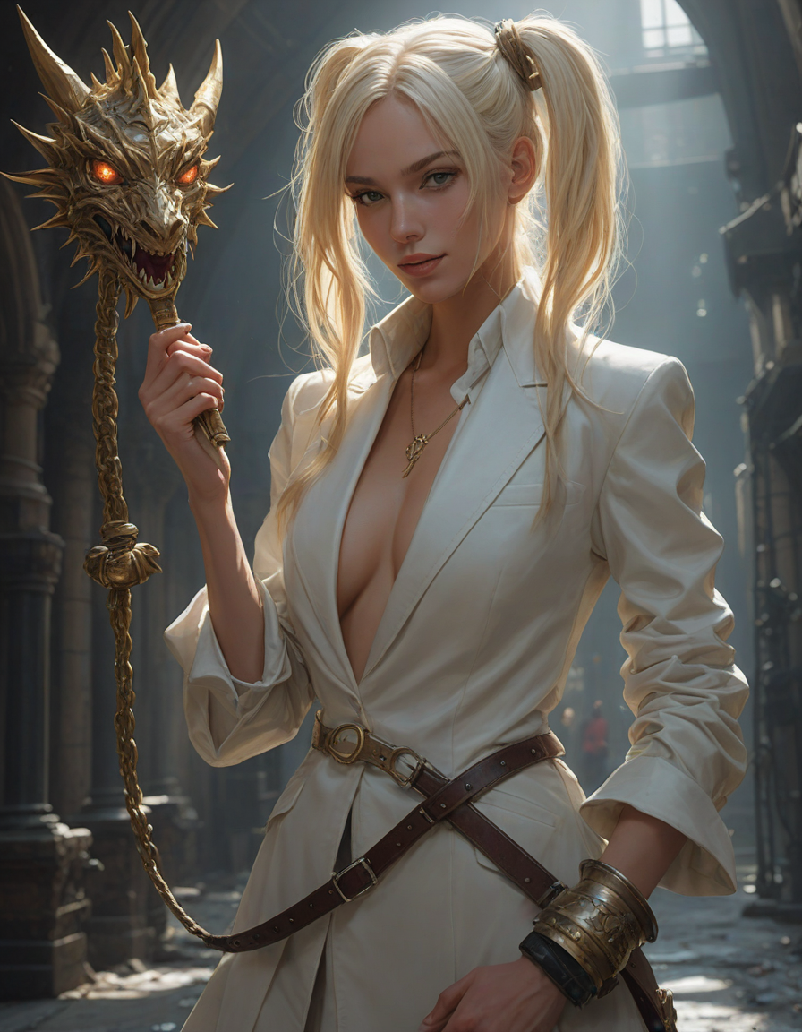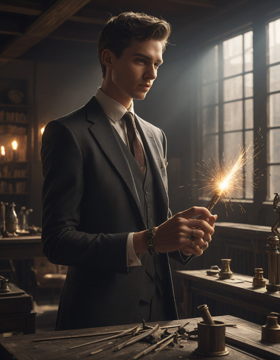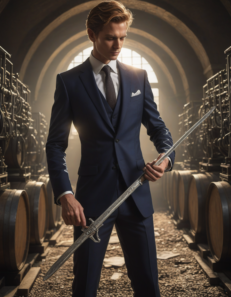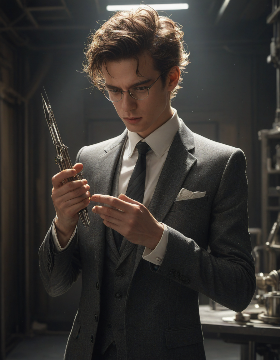 entrancing, Trembling hands clutching a cold metal weapon, drenched in sunlight, sparkling, wearing a sharp, tailored suit, savoring the view, in an underground lab