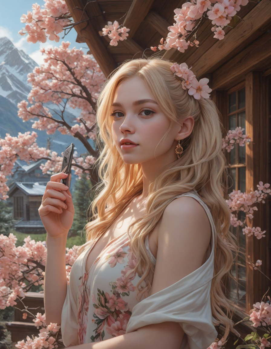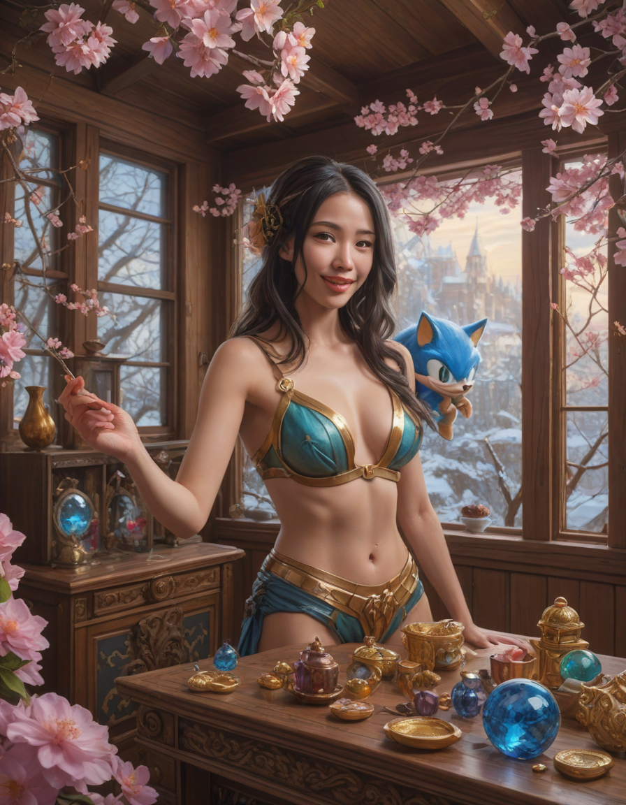 sonic the hedgehog, hot, crystal sculpture, woman taking a selfie, fisheye lens, grinning satisfaction, Giant cherry blossom, Dazzling splash, art by artgerm and greg rutkowski and alphonse mucha, An exquisite arrangement of colors that will make you feel, savoring the view, cowering in humiliation, cozy in a cabin with a roaring fireplace while it snows outside
