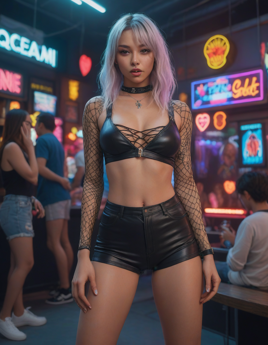 The background remains intentionally blurred, a mere suggestion of her personal space adorned with elements synonymous with the e-girl life—neon signs, band posters, and string lights—creating an ambiance that's both intimate and expressive. The lighting emphasizes the vivid colors of her makeup and the unique textures of her outfit, casting her in an ambiance that's dynamic and full of life.