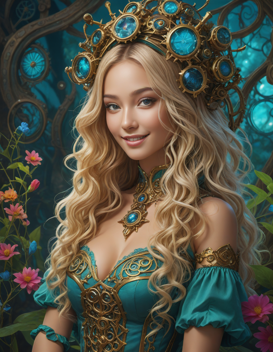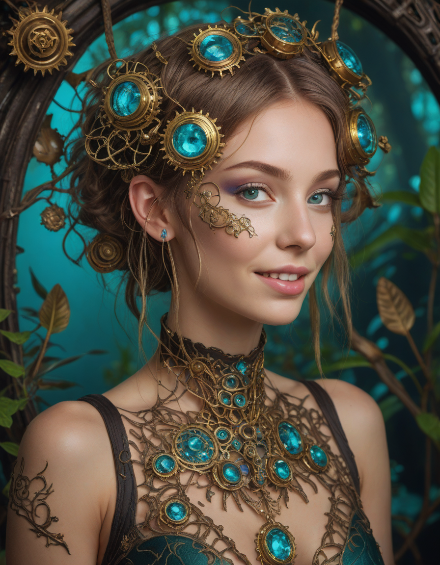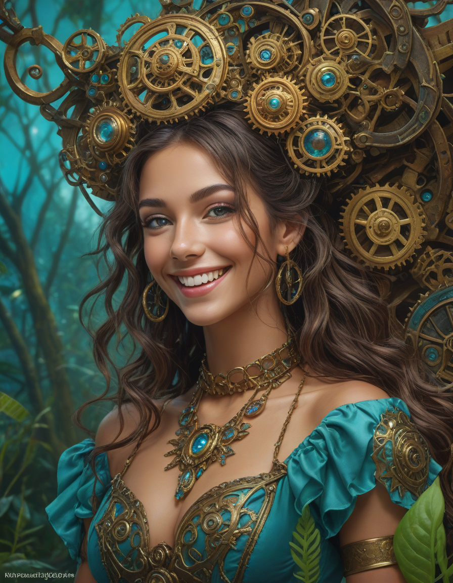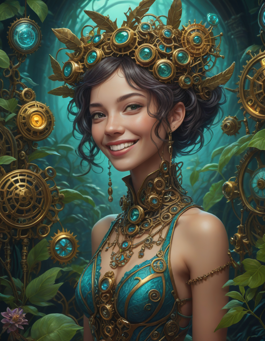 joyful laughing expression, eyes crinkled with mirth, intricate steampunk accessories, gears and brass, whimsical, magical fantasy forest, bioluminescent plants, ethereal atmosphere, vibrant saturated colors, bold contrasting palette