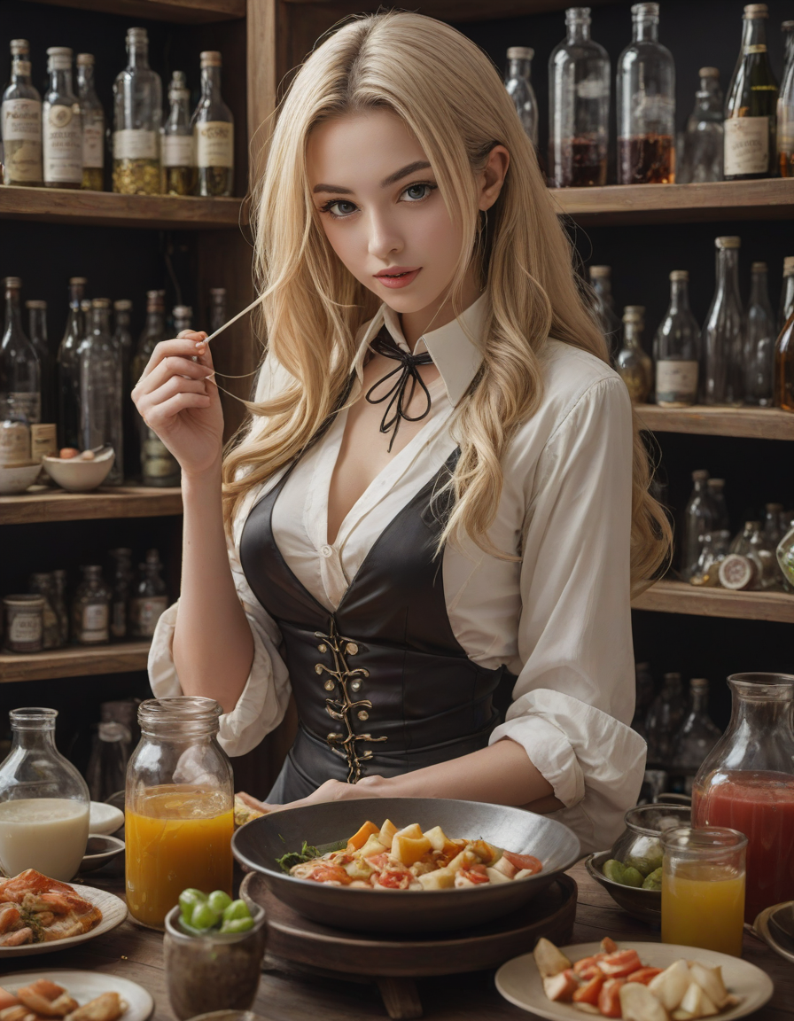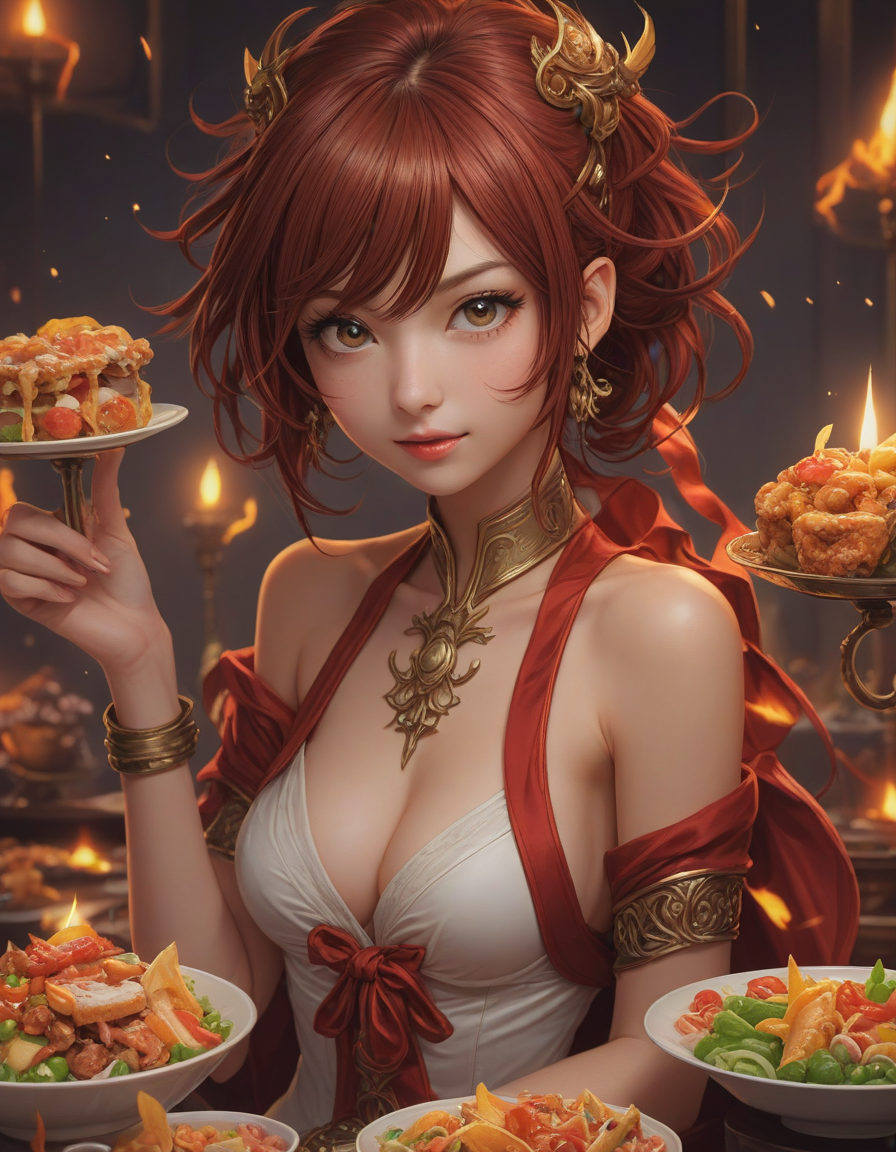Projected, eyes wide with wonder, feeling pure ecstasy, happy, anime, decadent feast, passionate