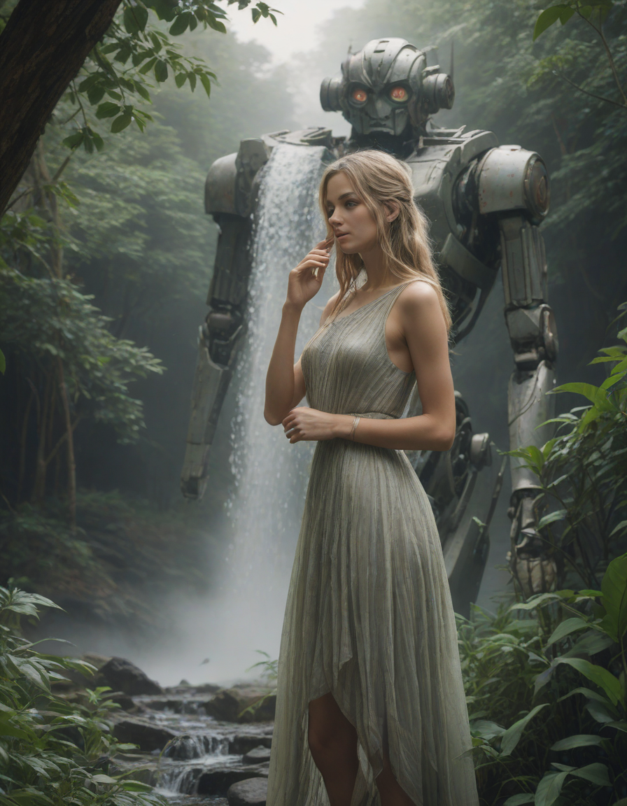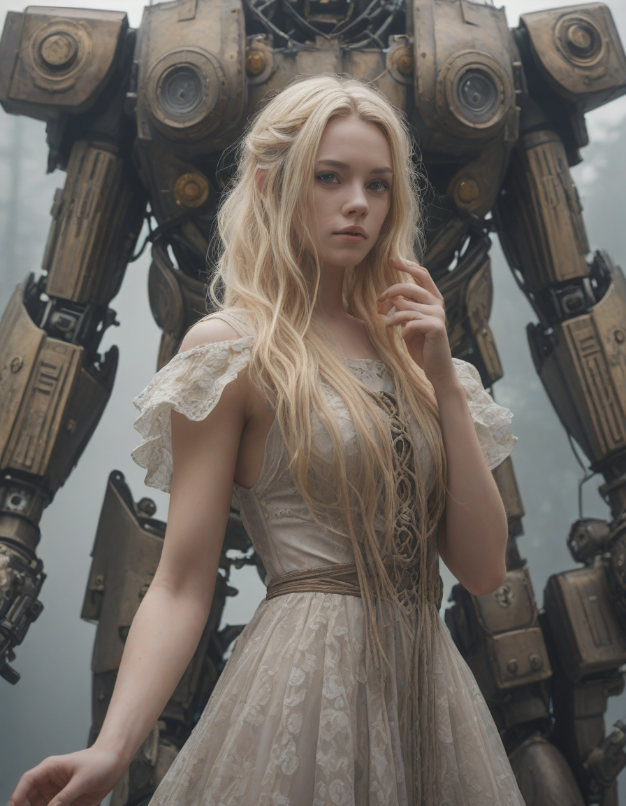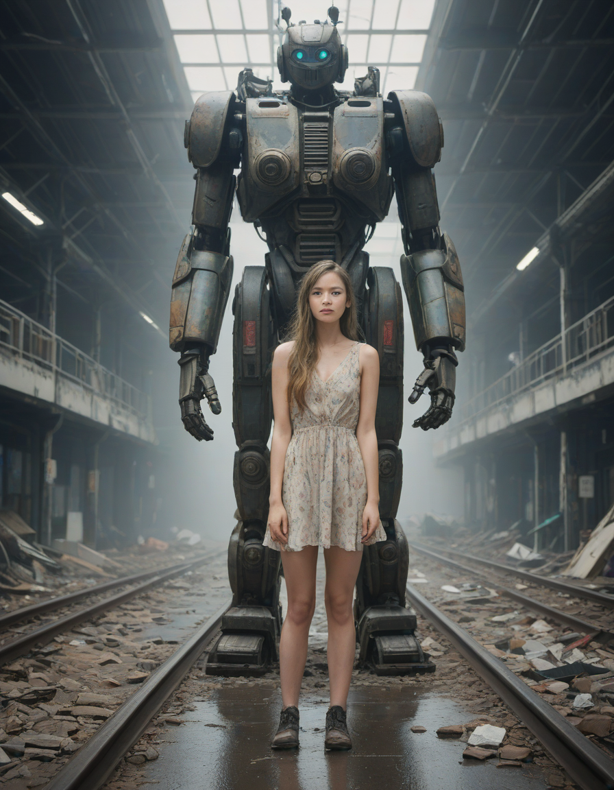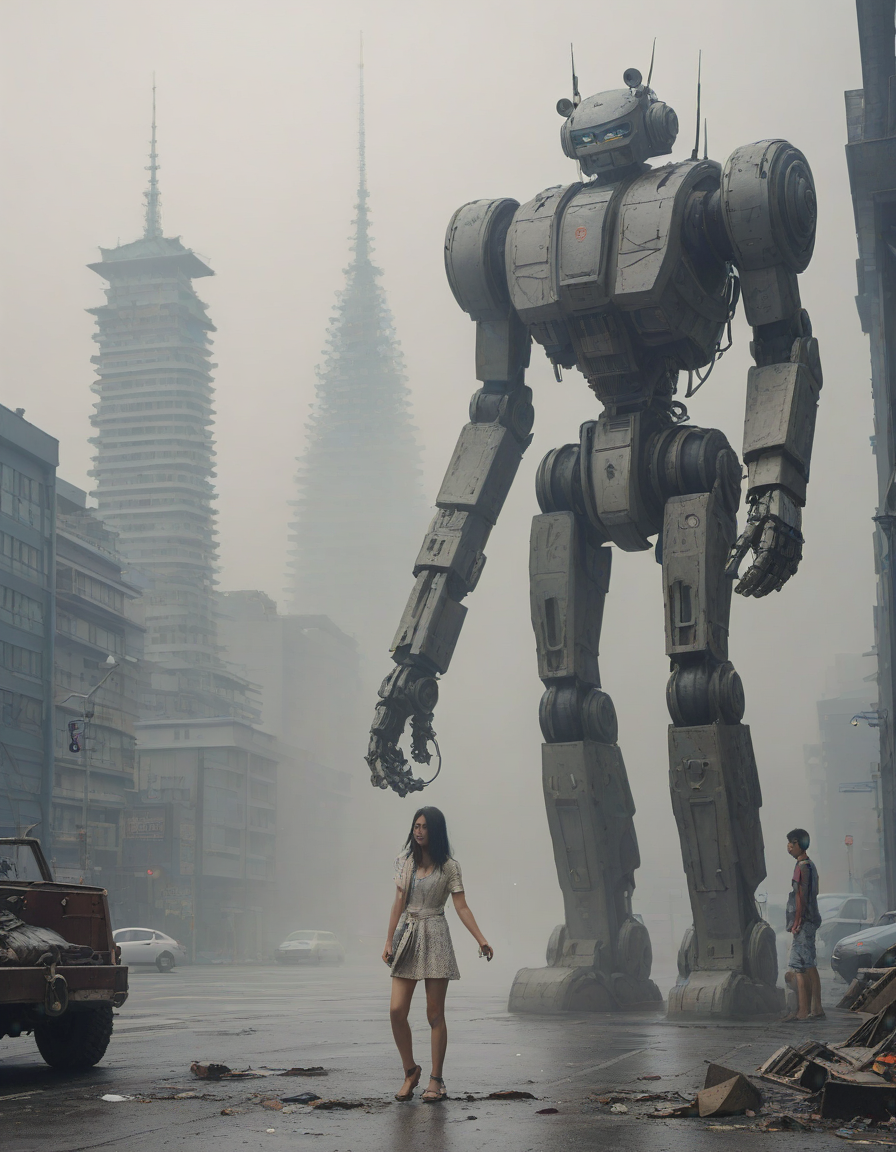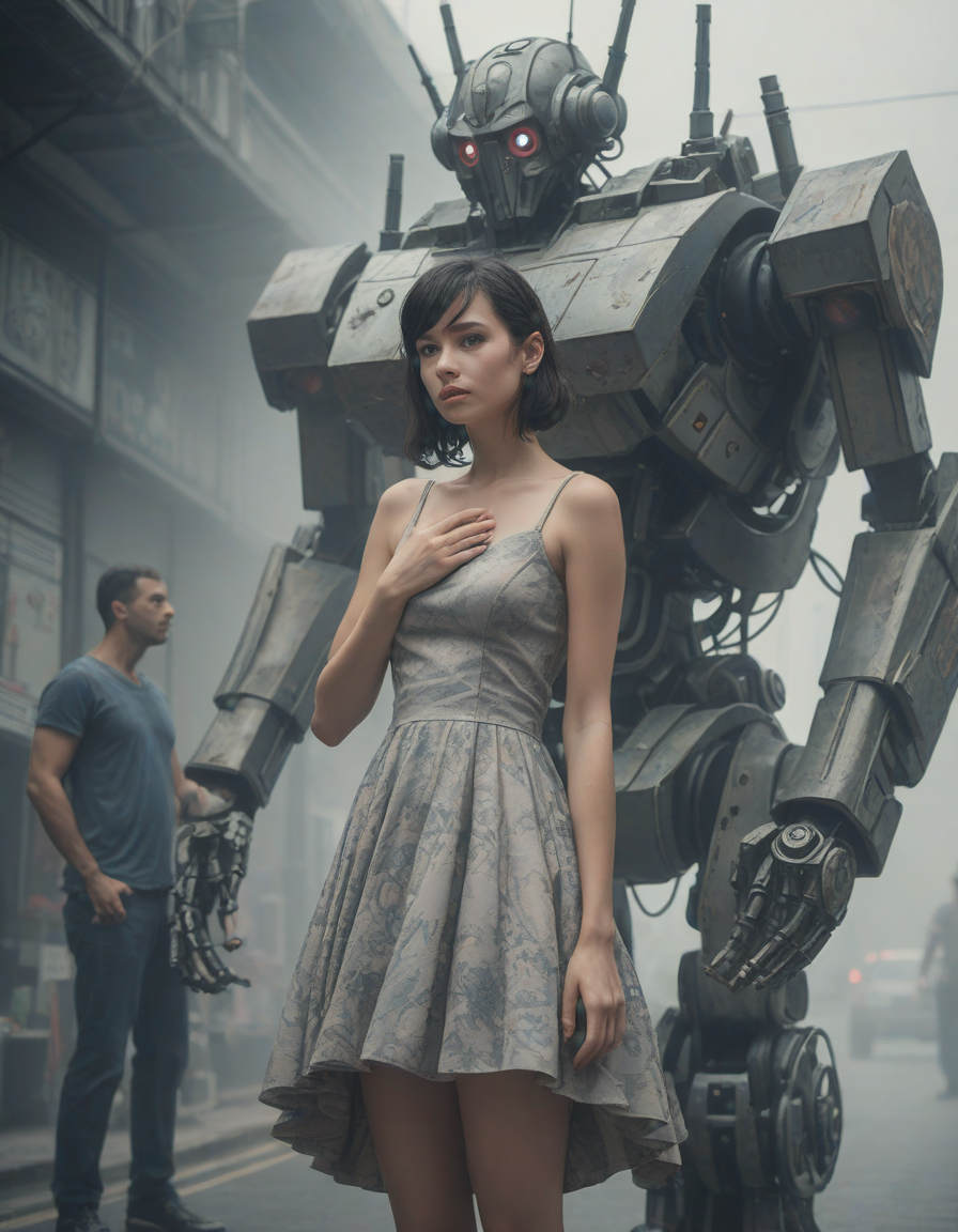 Giant robot looming, Girl in dress waving her hand in front of her face to fan herself, flushing, waiting in the mist, micro details, fine details, detailed