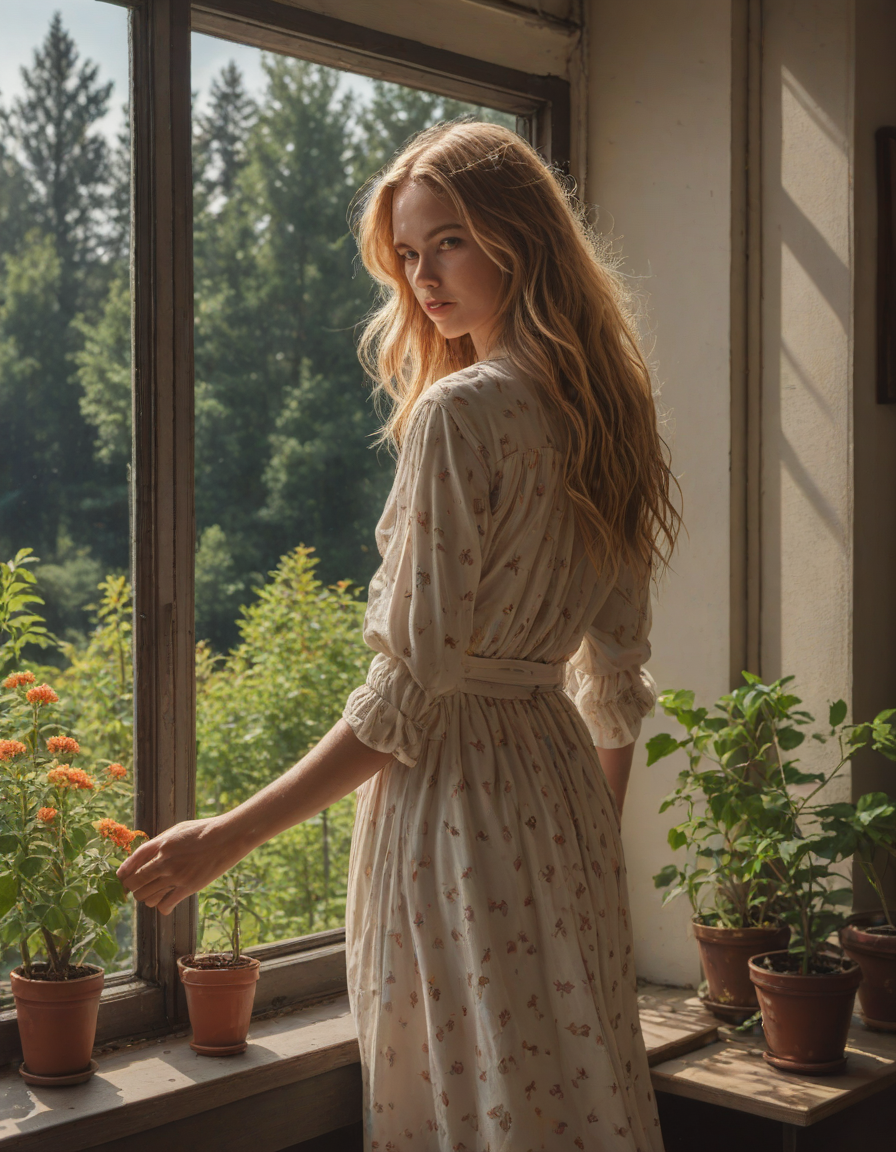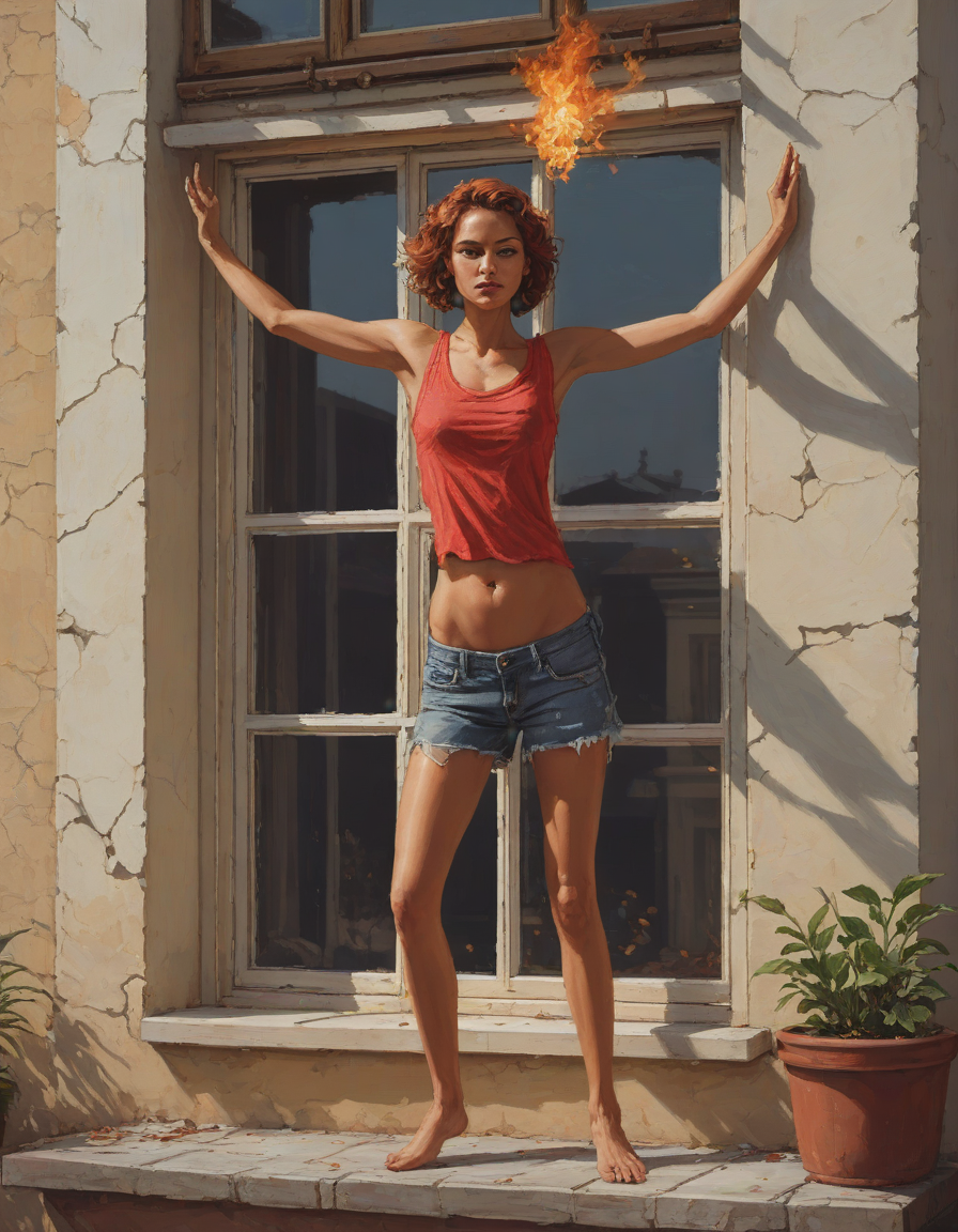 charismatic, pixel art, dancing flames, Leaning on window sill