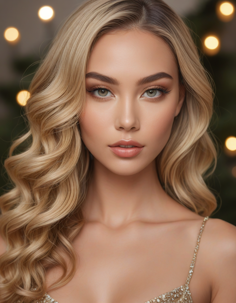 christmas tree, High-arched eyebrows, almond-shaped eyes, long and curled eyelashes, symmetrical eye spacing, radiant under-eye area, smooth eyelids, clear and luminous skin, high and pronounced cheekbones, soft and rounded cheeks, delicate jawline, defined chin contour, small and straight nose, narrow nose bridge, symmetrical nostrils, petite nostril size, full and curved upper lip, plump and rounded lower lip, well-defined cupid's bow, even lip spacing, soft and glowing complexion, subtle and natural face contour, harmonious facial symmetry, balanced facial proportions, slender neck, graceful collarbones, captivating smile, mesmerizing gaze, soft and silky hair, voluminous hair texture, elegant hair waves, striking hair length, glossy hair sheen, sculpted hairline, bewitching hair color, radiant hair highlights, timeless beauty appeal, magnetic personality shine, flawless makeup application, perfect skin texture, impeccable style and grace, pronounced facial angles, signature beauty marks, vibrant skin tone, expressive and lively eyes, enchanting eyelid crease, classic beauty profile, iconic bombshell figure, aesthetically pleasing facial features, refined elegance in appearance, alluring facial expression, distinguished by beauty and charm
