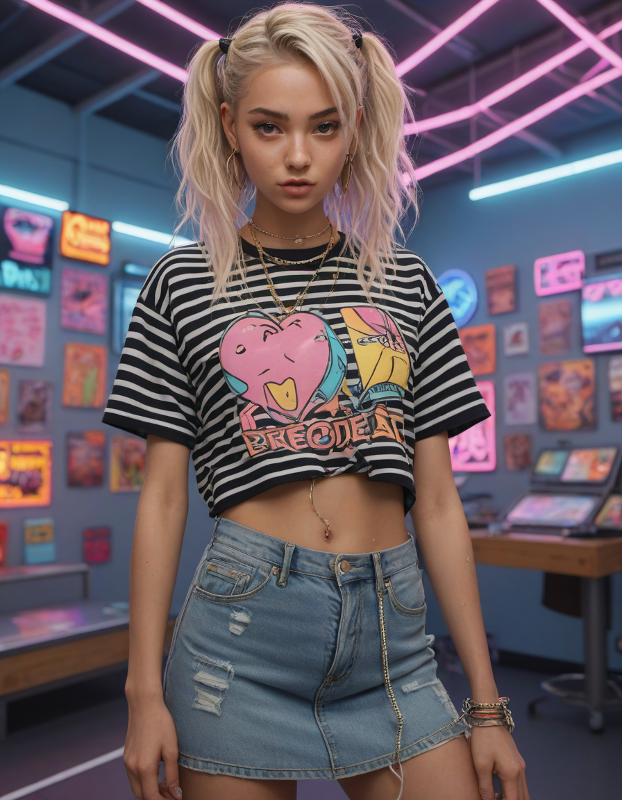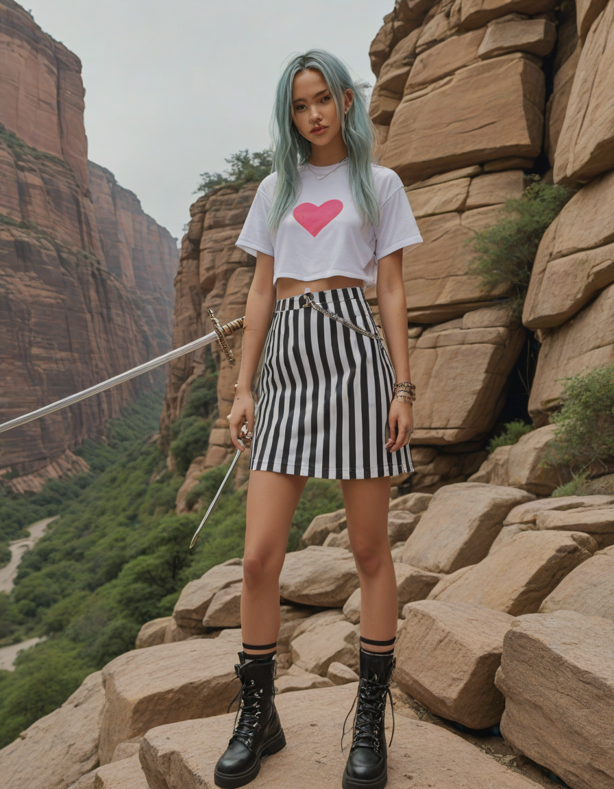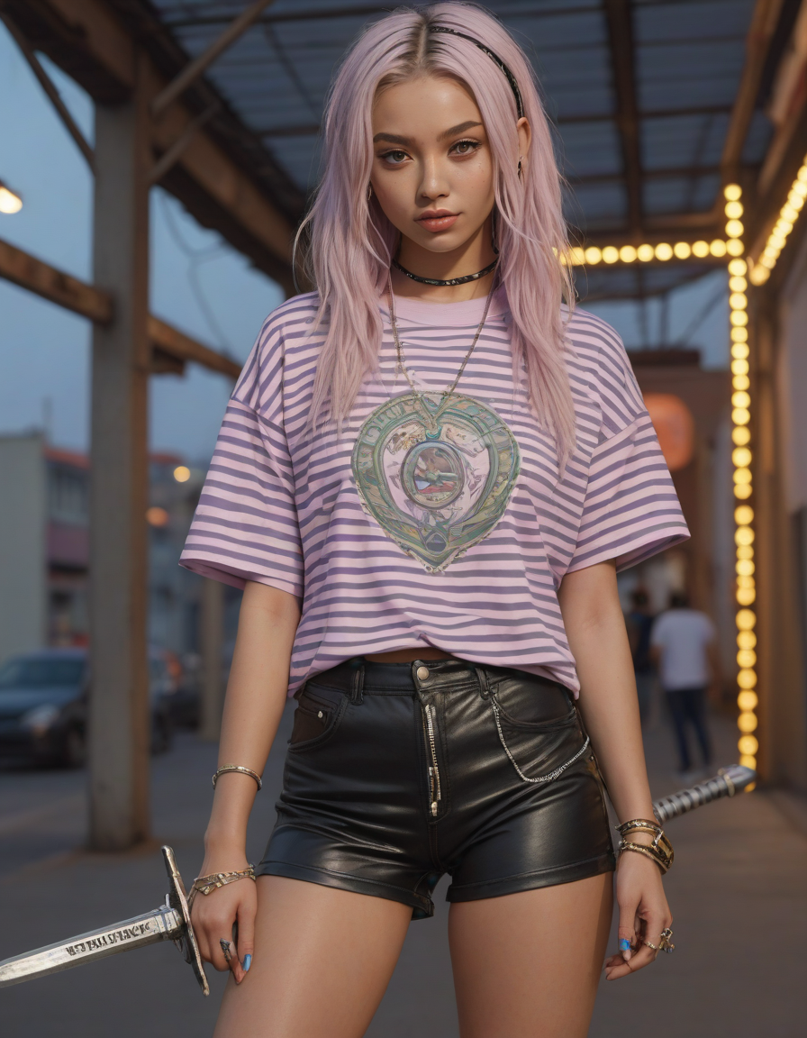 looking at viewer, Visualize a photorealistic portrayal of an 18-year-old high school senior girl, epitomizing the e-girl aesthetic with a blend of internet culture's vibrancy and personal audacity. Clad in an oversized striped shirt under a black graphic t-shirt dress, her style is a testament to e-girl fashion's layered intricacy, complemented by fishnet tights and chunky boots. Her makeup features dramatic winged eyeliner, neon eyeshadow, and dark lipstick, with blush bringing her face to life. Accessories like silver chains and a heart pendant choker, along with pastel or neon hair streaks, enhance her playful rebellion. Standing hands-on-hips, she exudes confidence and individuality against a backdrop suggestive of e-girl life, with neon signs and string lights. This scene captures her bold identity and expressive spirit at this pivotal moment., Holding a sword in both hands in a confident pose, detailed grip, detailed fuller, detailed pommel, detailed blade, detailed edge,