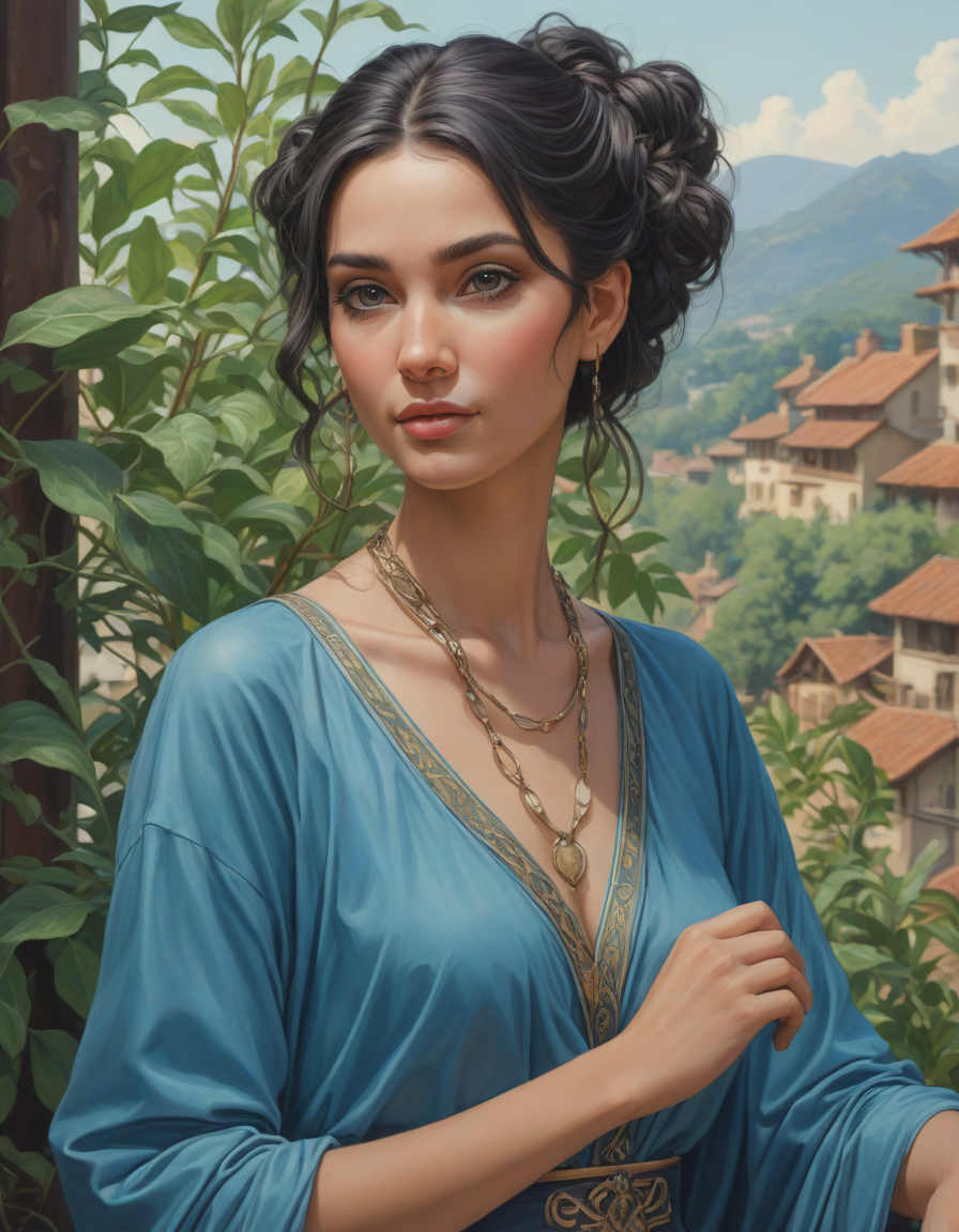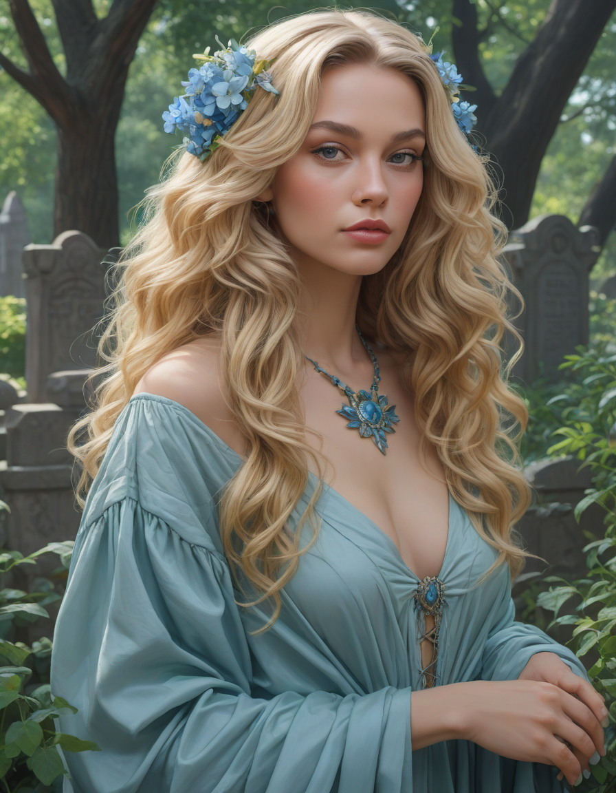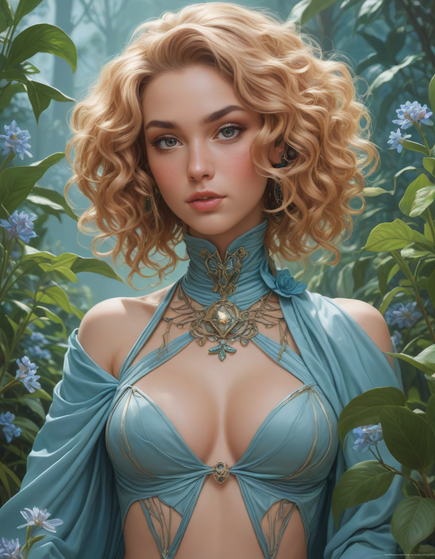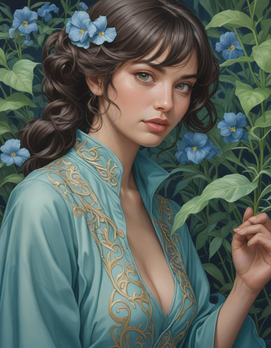 rich, Watching the world whizz by in technicolor, overgown foliage, puffed out cheeks, Smoky beauty seduces, Sarcastic half-smile, light blue colored iris pigment, light blue colored eyes, blue-iris-color, blue-eye-color,, art by artgerm and greg rutkowski and alphonse mucha