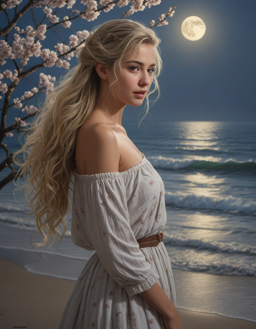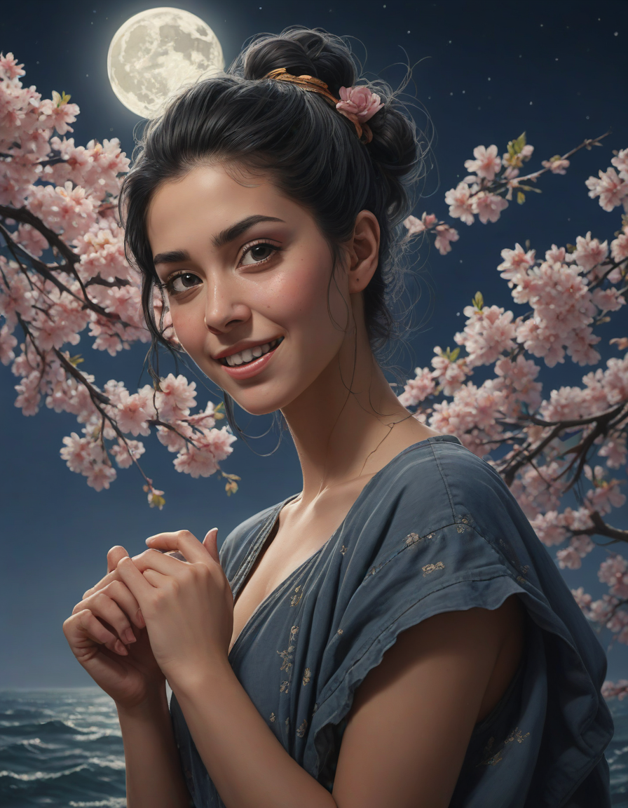 excited, shimmering in the moonlight, Moonlight on restless waves, sinister smile, Giant cherry blossom, nervously wringing damp trembling hands, A hint of desire, quizzical expression