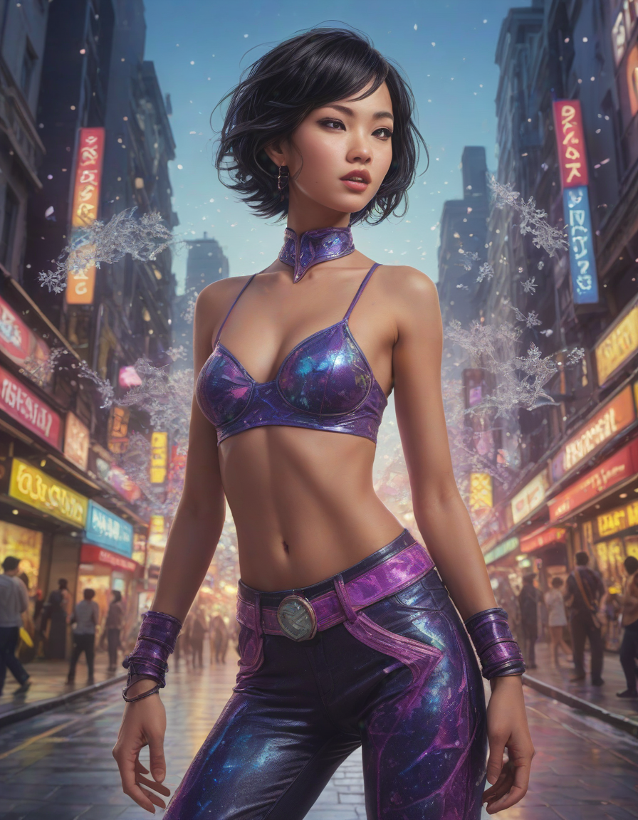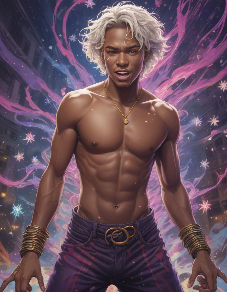 excited, entrancing, sparkling snowflakes, Mystical twilight, successful, as a street fighter character, diverse, Rock-hard abs glistening, psychedelic trip, mesmerizing swirls, very upset, flirtatious