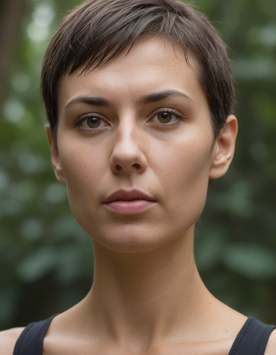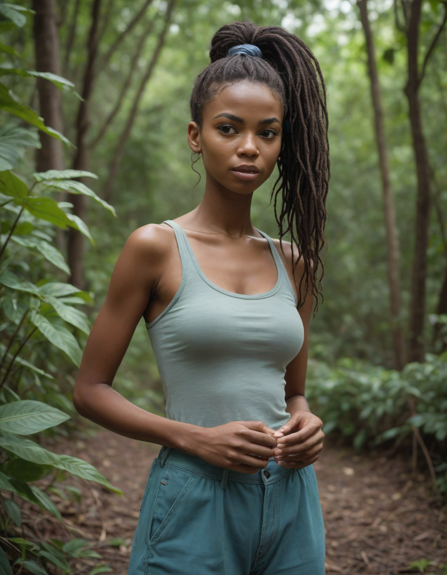 Steamy jungle, thick with humid air, standing rigidly present, juggling, a head tilting, a question asked without words, Chiseled jawline