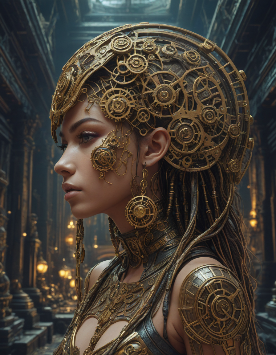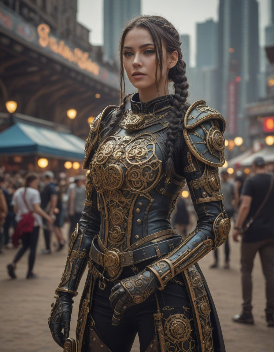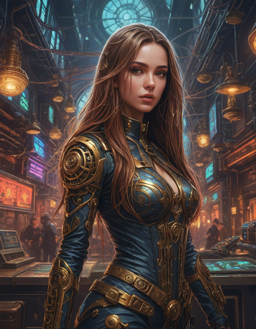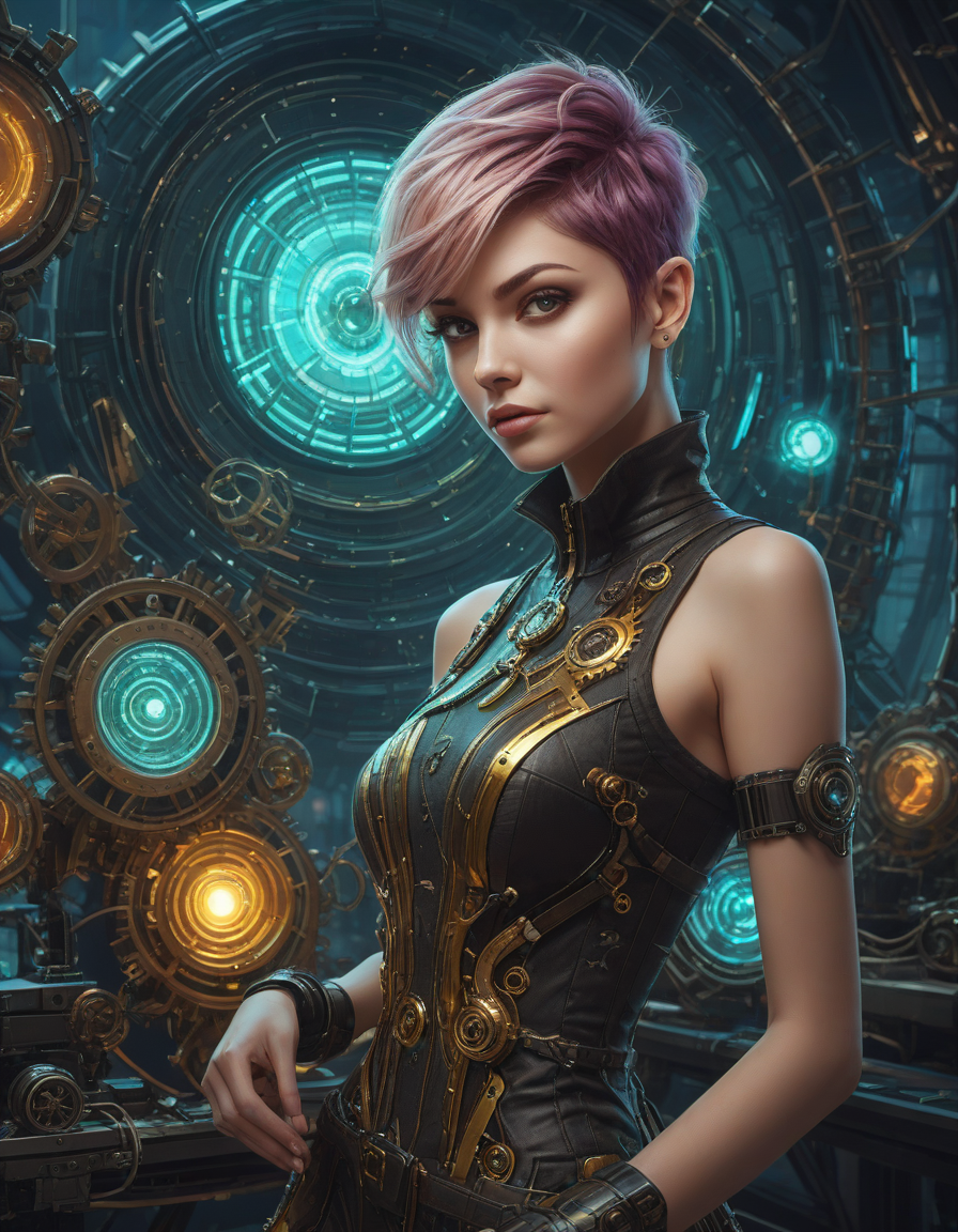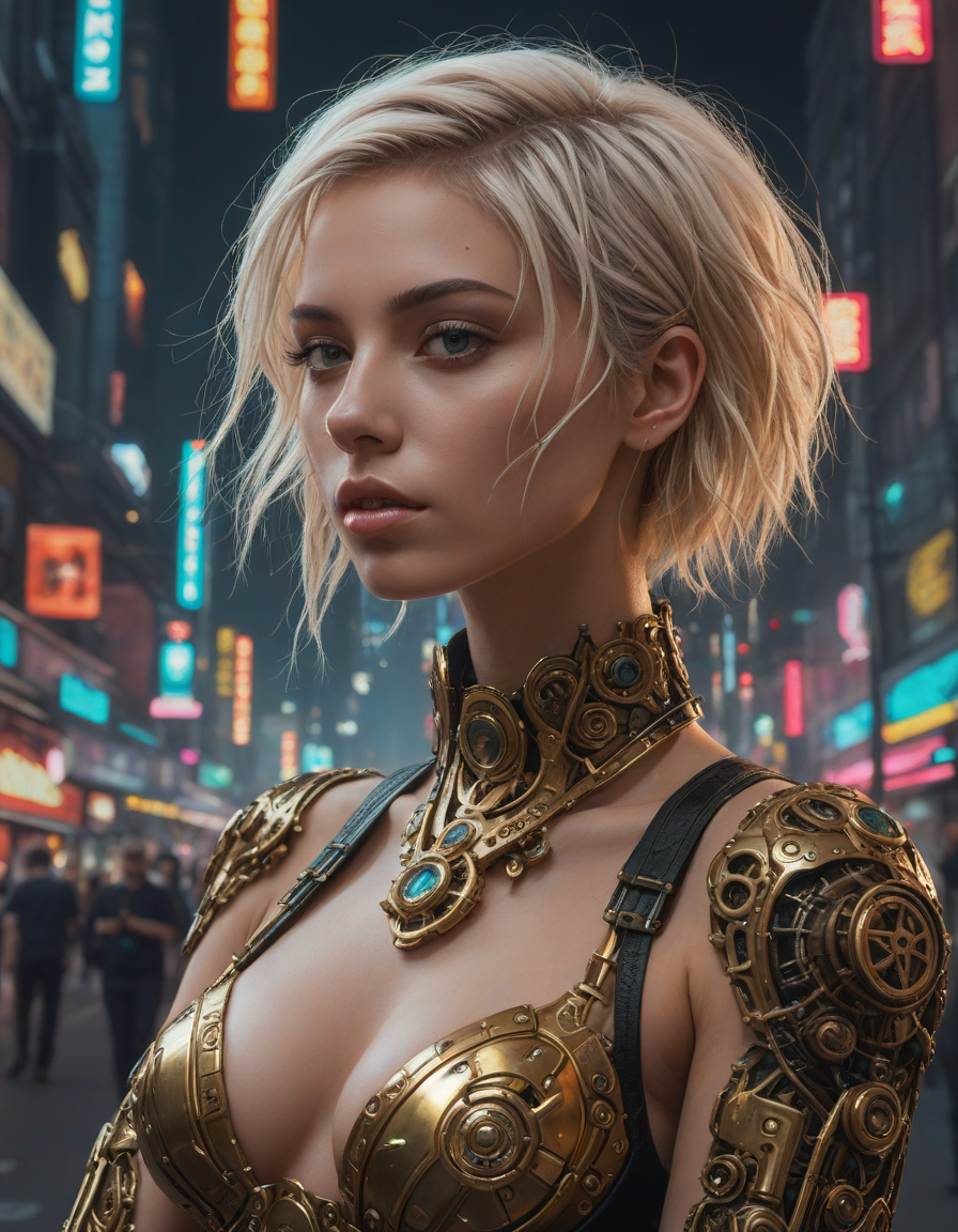 intricate steampunk accessories, gears and brass, highly stylized, artistic, cyberpunk, neon lights, futuristic cityscape, impressionistic, smooth brushstrokes