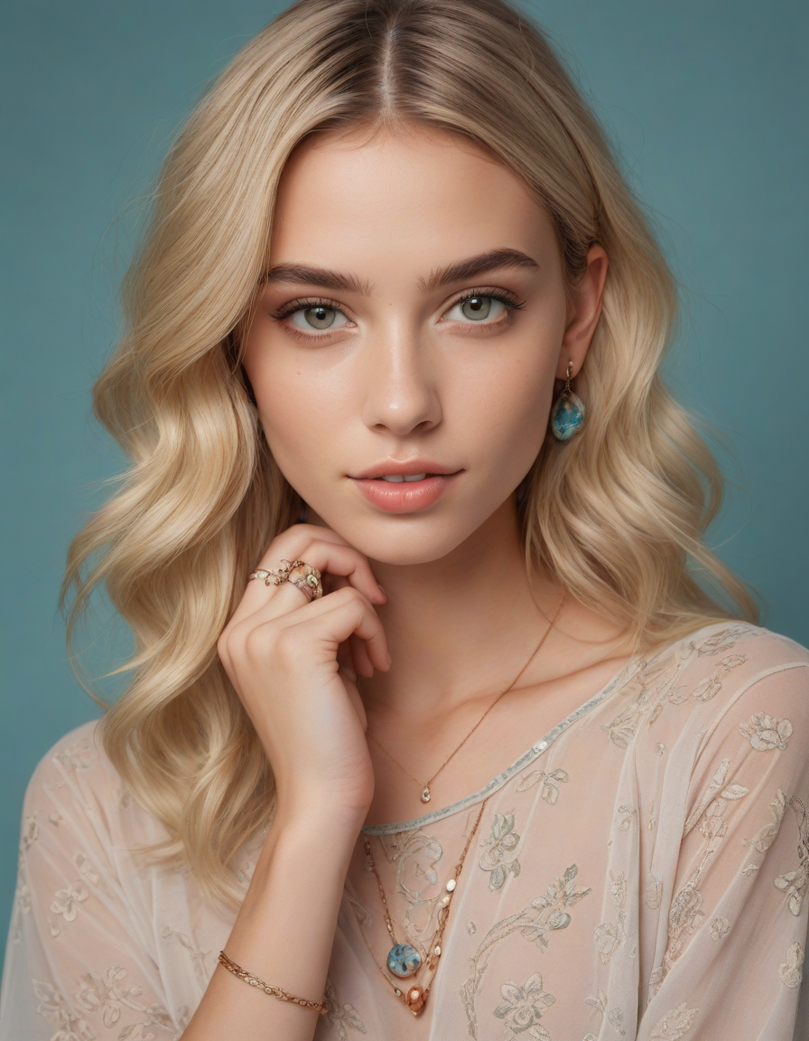 life of the party, bohemian, "free spirit", jewelry, tattoo, spring dress, looking at viewer, Wielding a one-handed weapon in both hands, one-handed weapon, weapon, , oval face shape, almond-shaped eyes, voluminous lashes, slightly arched eyebrows, narrow nasal bridge, rounded nose tip, symmetrical nostrils, full lips, pronounced cupid's bow, slightly fuller lower lip, defined cheekbones, rounded chin, smooth complexion, softly contoured jawline, balanced facial proportions, symmetrical features, gently curved eyelids, soft brow ridge, harmonious cheek to jawline transition, subtle philtrum, delicate ear lobes, straight blonde hair, clear skin, hooded eyelids, light pink lip color, slightly pouty expression, casual pose with hand on face, slight head tilt, indoor lighting, Light blue irises, Medium-thickness eyebrows, Softly angled eyebrows, A hint of freckles across the nose and cheeks, Natural makeup, Gentle frown lines between the eyebrows, Soft nasolabial folds, Smooth forehead, Subtle dimple on the chin, Clear facial contour without distinct shadows, Even skin tone with a hint of natural pink undertones, Slightly rosy cheeks, Tapered jawline, Fine hair texture with gentle waves, Youthful appearance with soft facial features