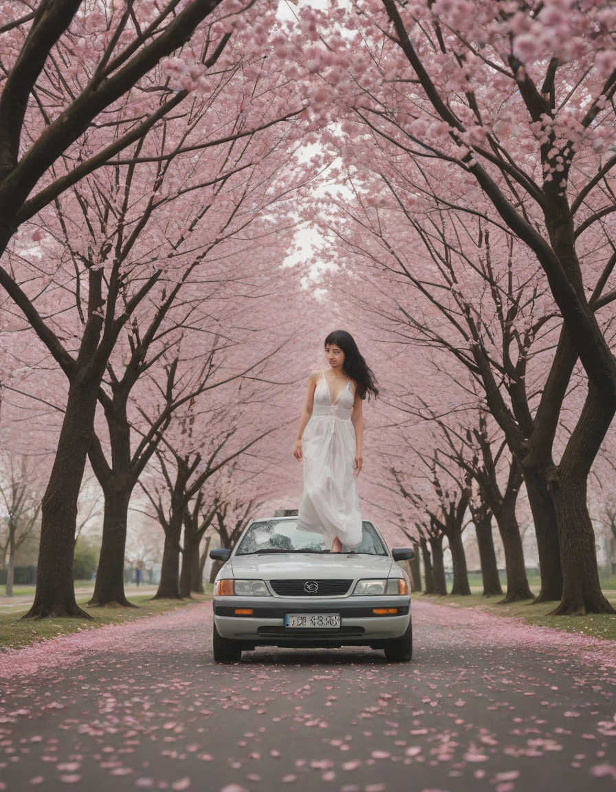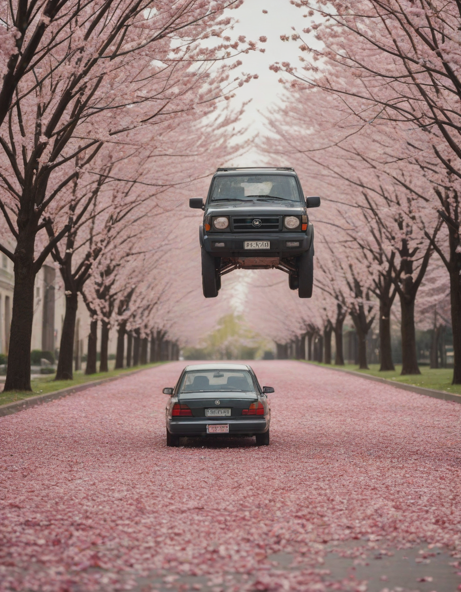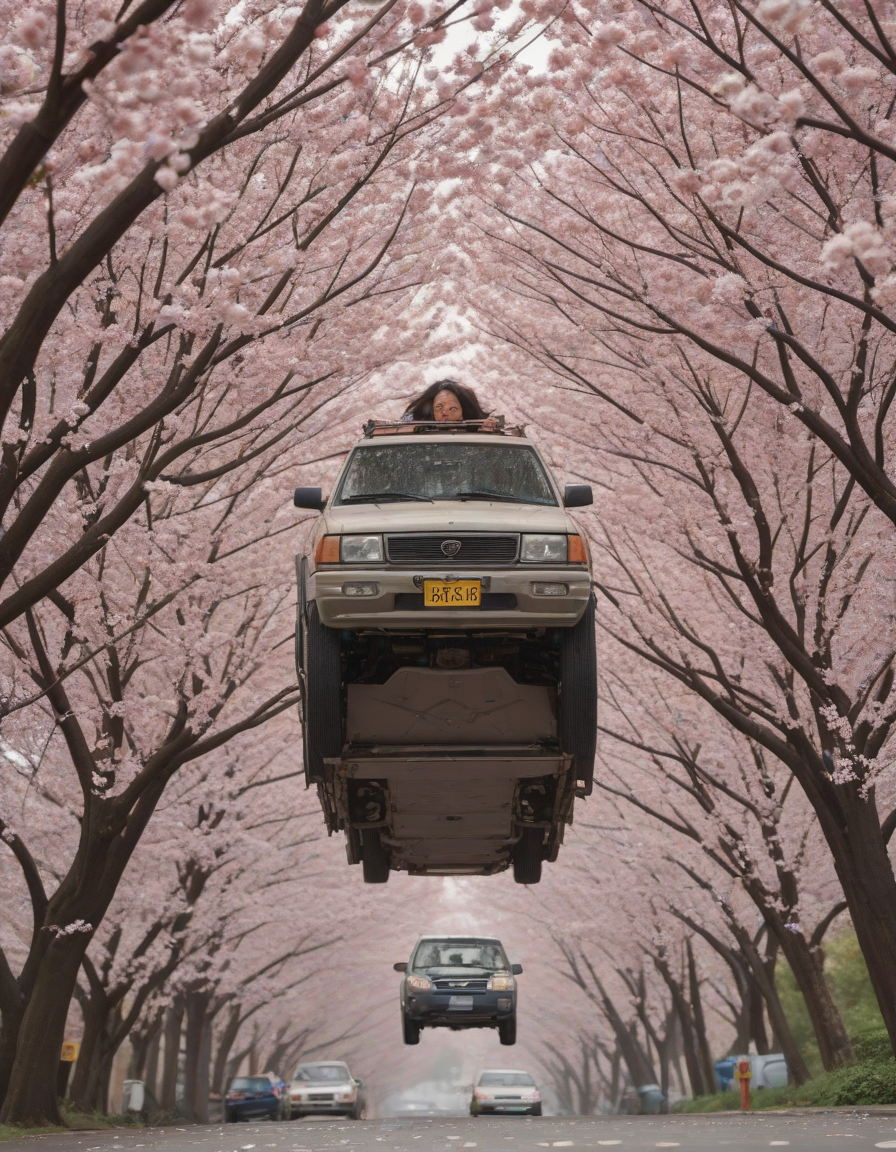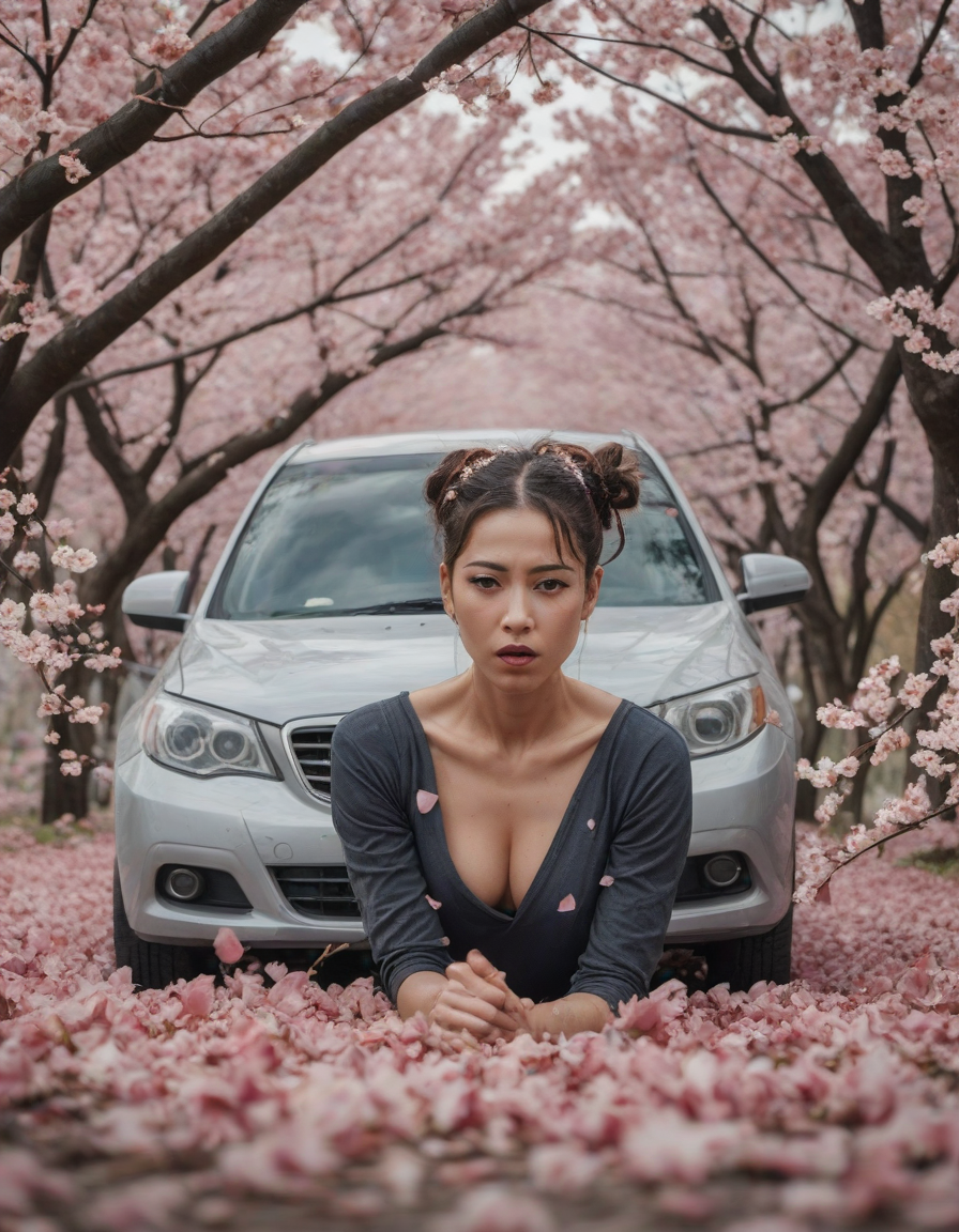 sudden regret, upside down person, Blossoming cherry trees, petals falling like snow, trauma, a car chase scene from a movie, super zoom lens