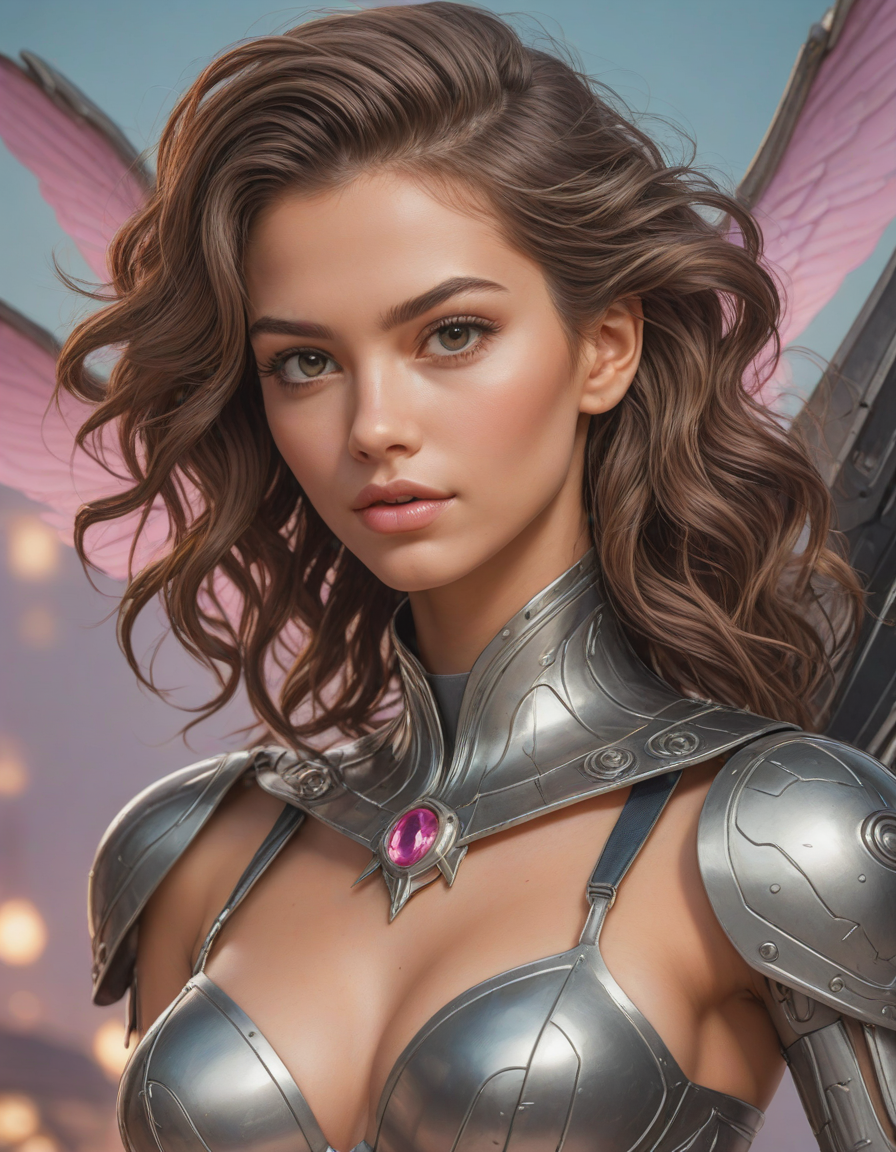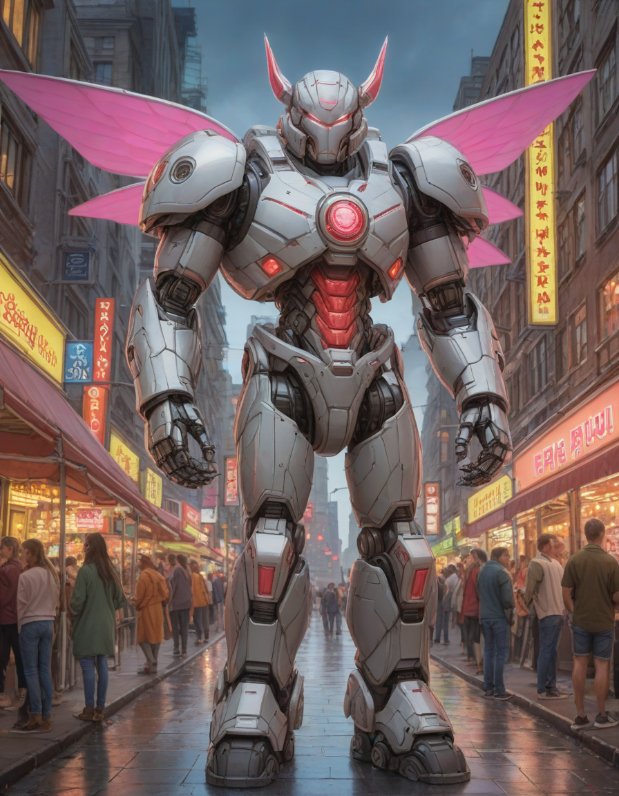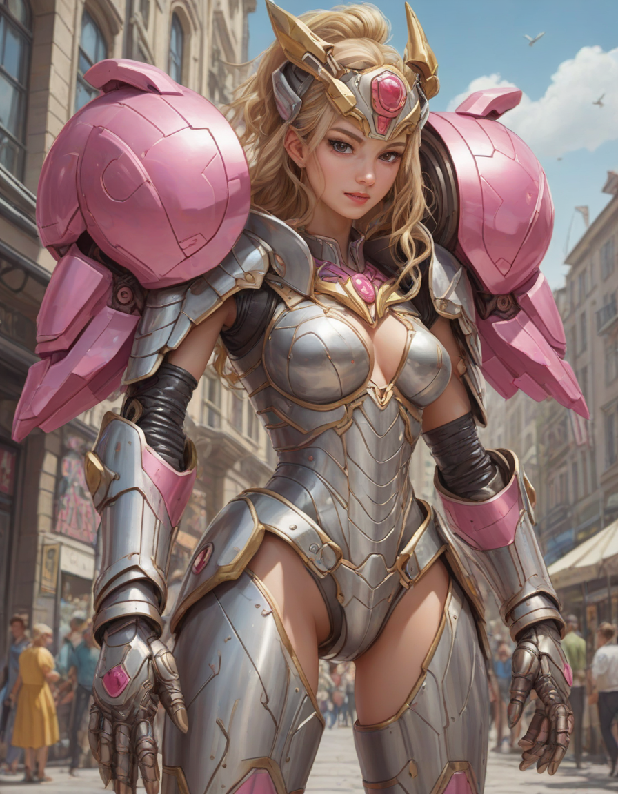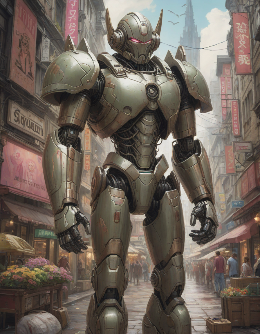 Giant robot looming, lively, wearing complete set of armor, wearing full armor, Wearing chest armor, wearing leg armor, wearing feet armor, wearing bracer, wearing pauldrons,, all the way up to an 11, cotton candy soft touches, Surrounded by gleaming lights, flood, warrior, comic book illustration, wacky caricature, High-arched eyebrows, almond-shaped eyes, long and curled eyelashes, symmetrical eye spacing, radiant under-eye area, smooth eyelids, clear and luminous skin, high and pronounced cheekbones, soft and rounded cheeks, delicate jawline, defined chin contour, small and straight nose, narrow nose bridge, symmetrical nostrils, petite nostril size, full and curved upper lip, plump and rounded lower lip, well-defined cupid's bow, even lip spacing, soft and glowing complexion, subtle and natural face contour, harmonious facial symmetry, balanced facial proportions, slender neck, graceful collarbones, captivating smile, mesmerizing gaze, soft and silky hair, voluminous hair texture, elegant hair waves, striking hair length, glossy hair sheen, sculpted hairline, bewitching hair color, radiant hair highlights, timeless beauty appeal, magnetic personality shine, flawless makeup application, perfect skin texture, impeccable style and grace, pronounced facial angles, signature beauty marks, vibrant skin tone, expressive and lively eyes, enchanting eyelid crease, classic beauty profile, iconic bombshell figure, aesthetically pleasing facial features, refined elegance in appearance, alluring facial expression, distinguished by beauty and charm, eye-popping, rich 3D photorealistic rendering, anime