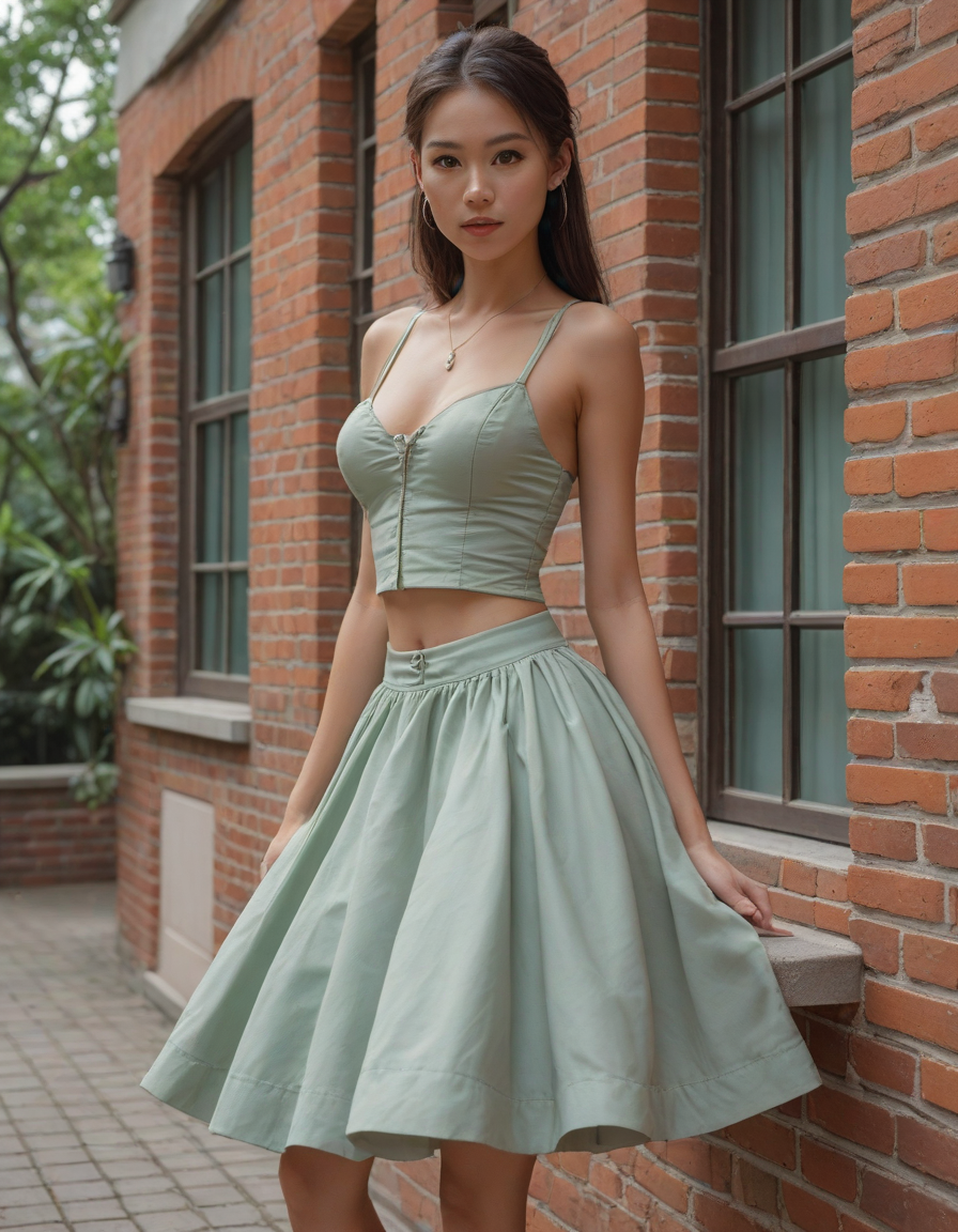 Wide Skirt, wide ballgown hem, a line skirt, petticoat skirt, , looking at viewer, Wielding a one-handed weapon in both hands, one-handed weapon, weapon, , brick wall -> great window view, excessive cleavage, low neckline, revealing chest, revealing cleavage, cleavage-baring, revealing, excessively revealing, very revealing, lowcut, lowrise,