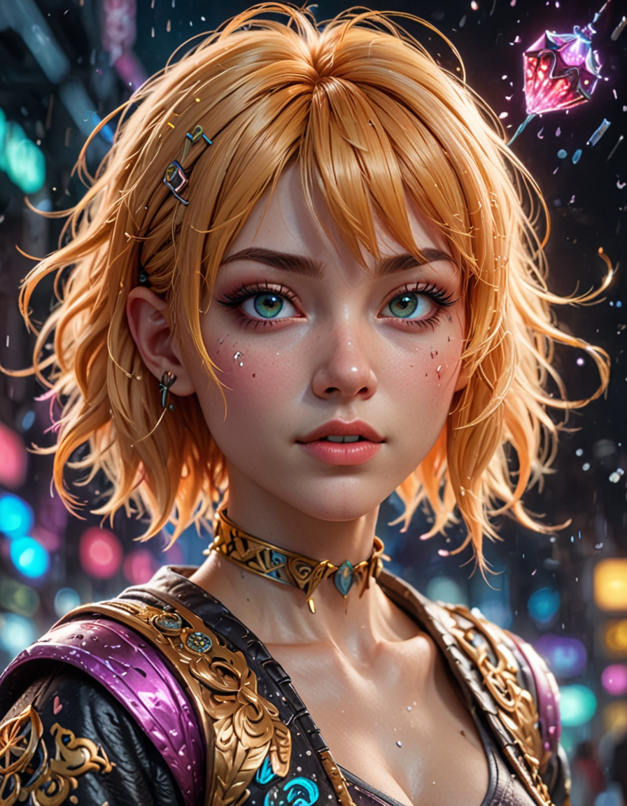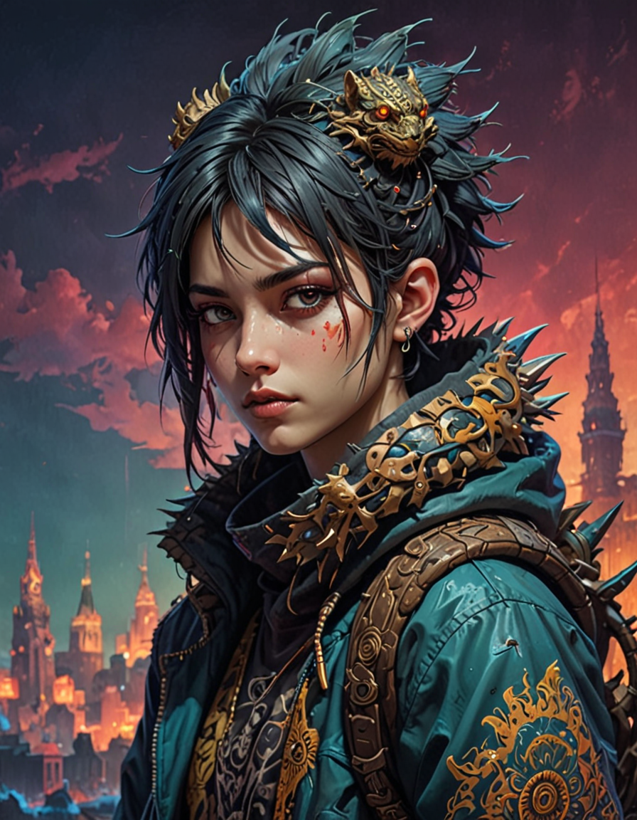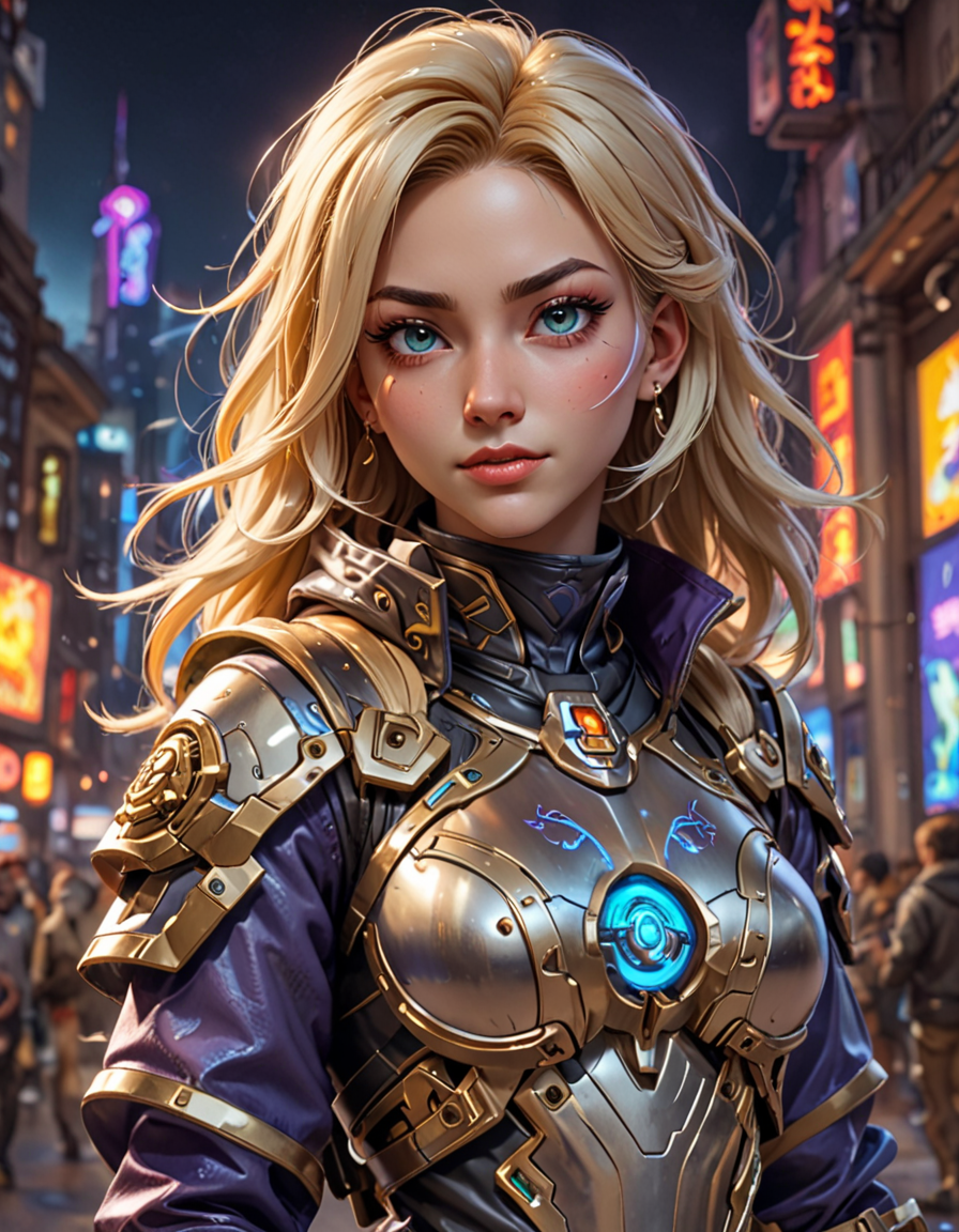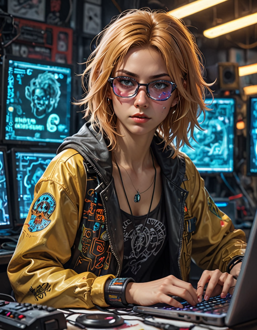 cyberpunk hacker, surrounded by neon lights and holographic screens
