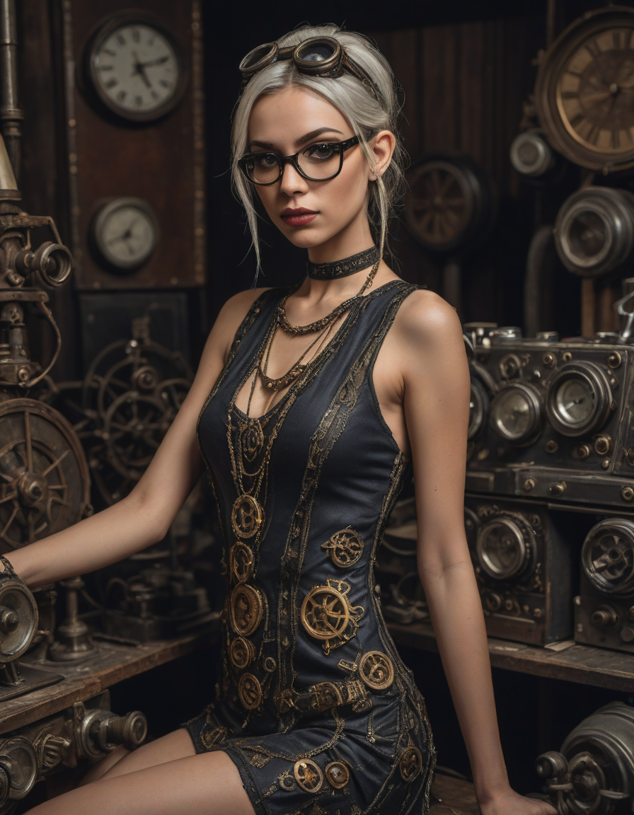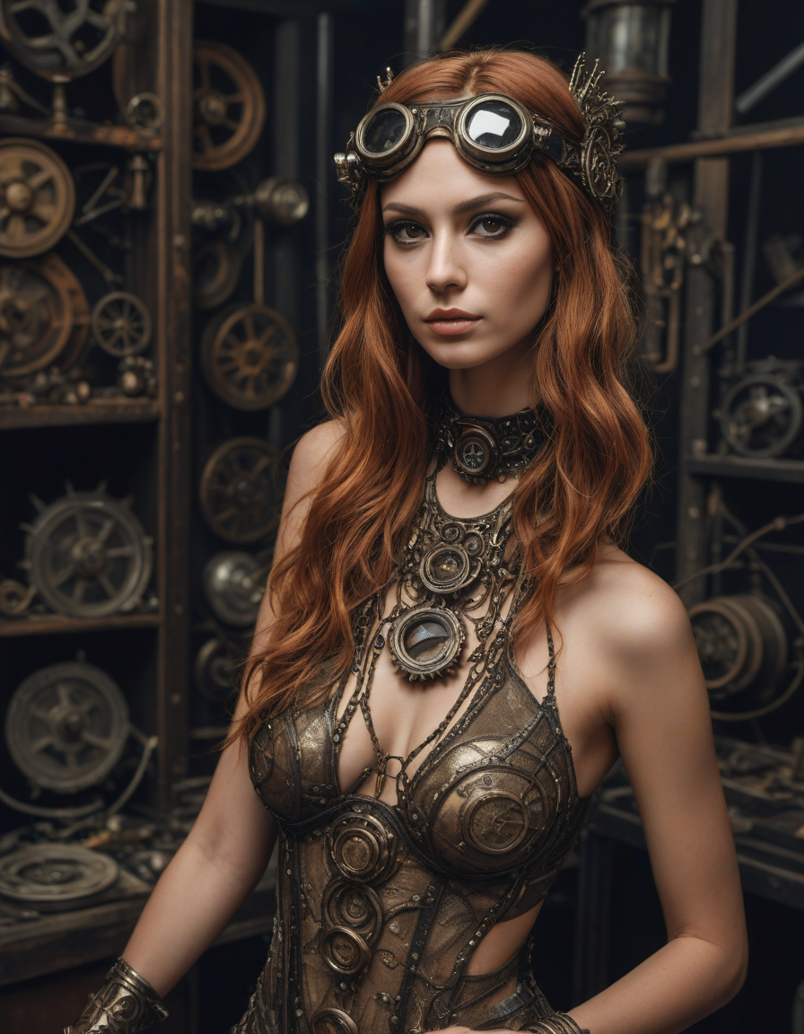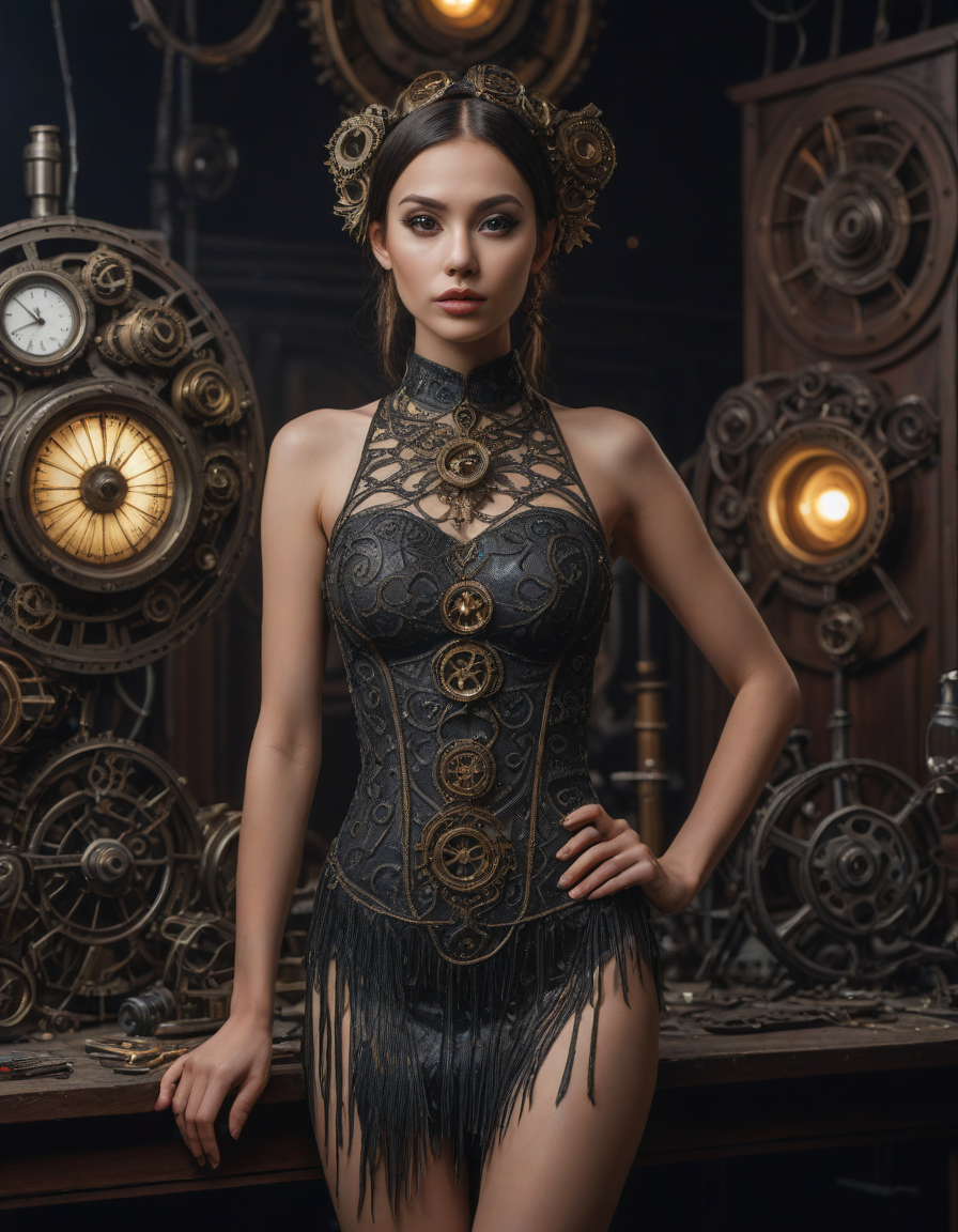 extravagant flapper dress with sequins, psychedelic dmt experience, charismatic, steampunk engineer, with gears and goggles in a dimly lit workshop, mermaid, gothic individual with pale makeup, santa, ponytail