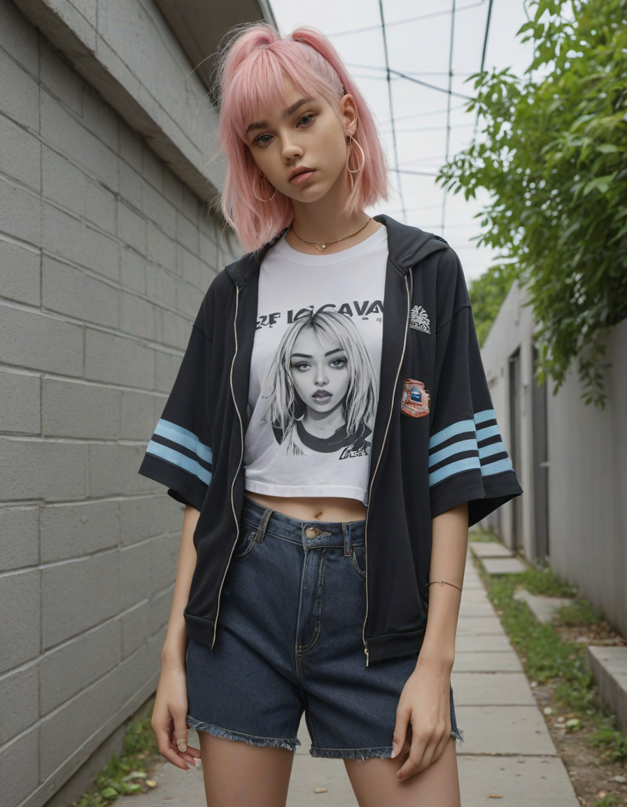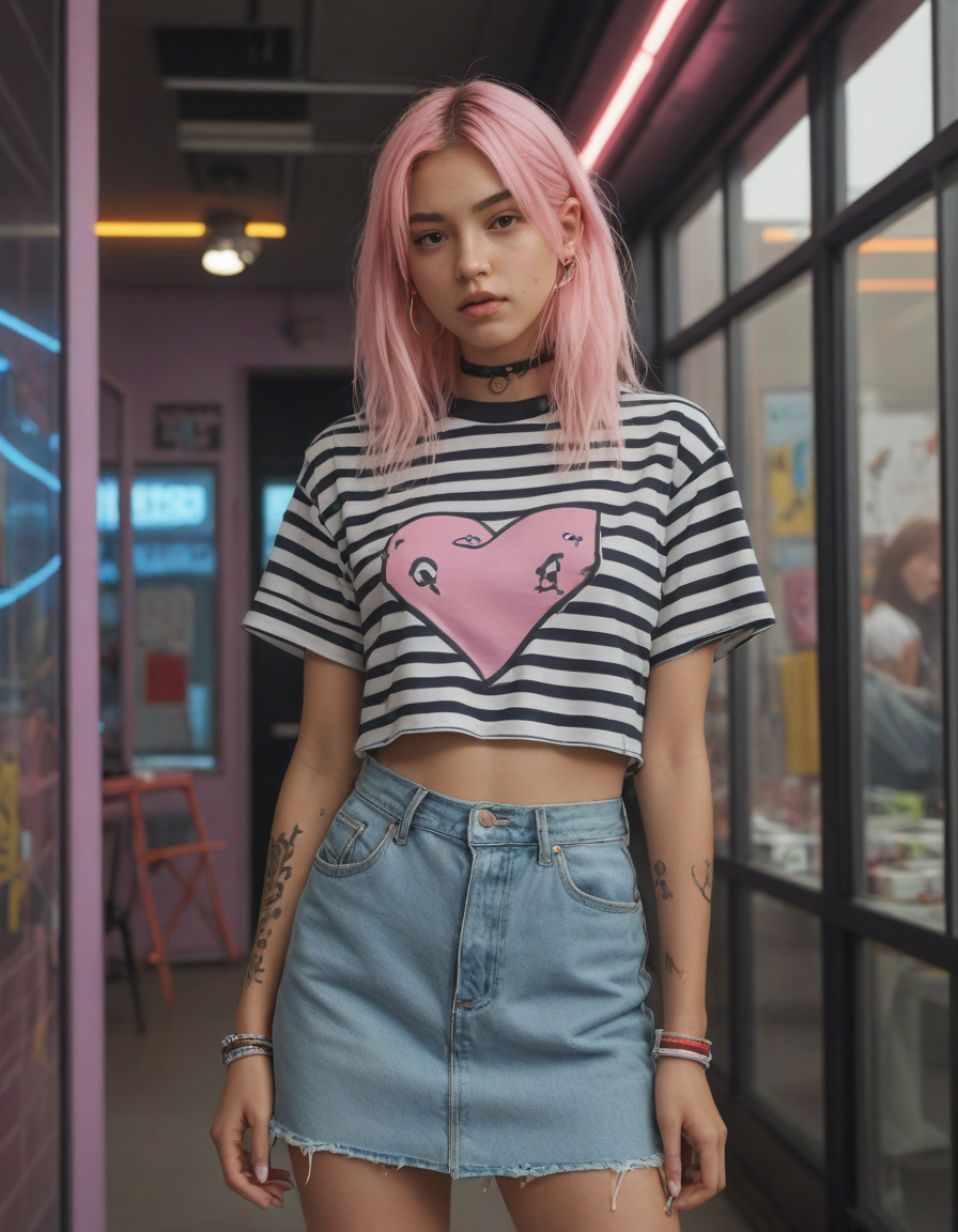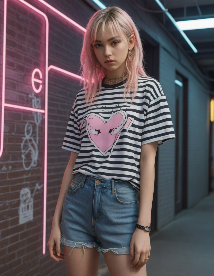 Wielding a one-handed weapon in both hands, one-handed weapon, weapon, , Visualize a photorealistic portrayal of an 18-year-old high school senior girl, epitomizing the e-girl aesthetic with a blend of internet culture's vibrancy and personal audacity. Clad in an oversized striped shirt under a black graphic t-shirt dress, her style is a testament to e-girl fashion's layered intricacy, complemented by fishnet tights and chunky boots. Her makeup features dramatic winged eyeliner, neon eyeshadow, and dark lipstick, with blush bringing her face to life. Accessories like silver chains and a heart pendant choker, along with pastel or neon hair streaks, enhance her playful rebellion. Standing hands-on-hips, she exudes confidence and individuality against a backdrop suggestive of e-girl life, with neon signs and string lights. This scene captures her bold identity and expressive spirit at this pivotal moment., brick wall -> great window view