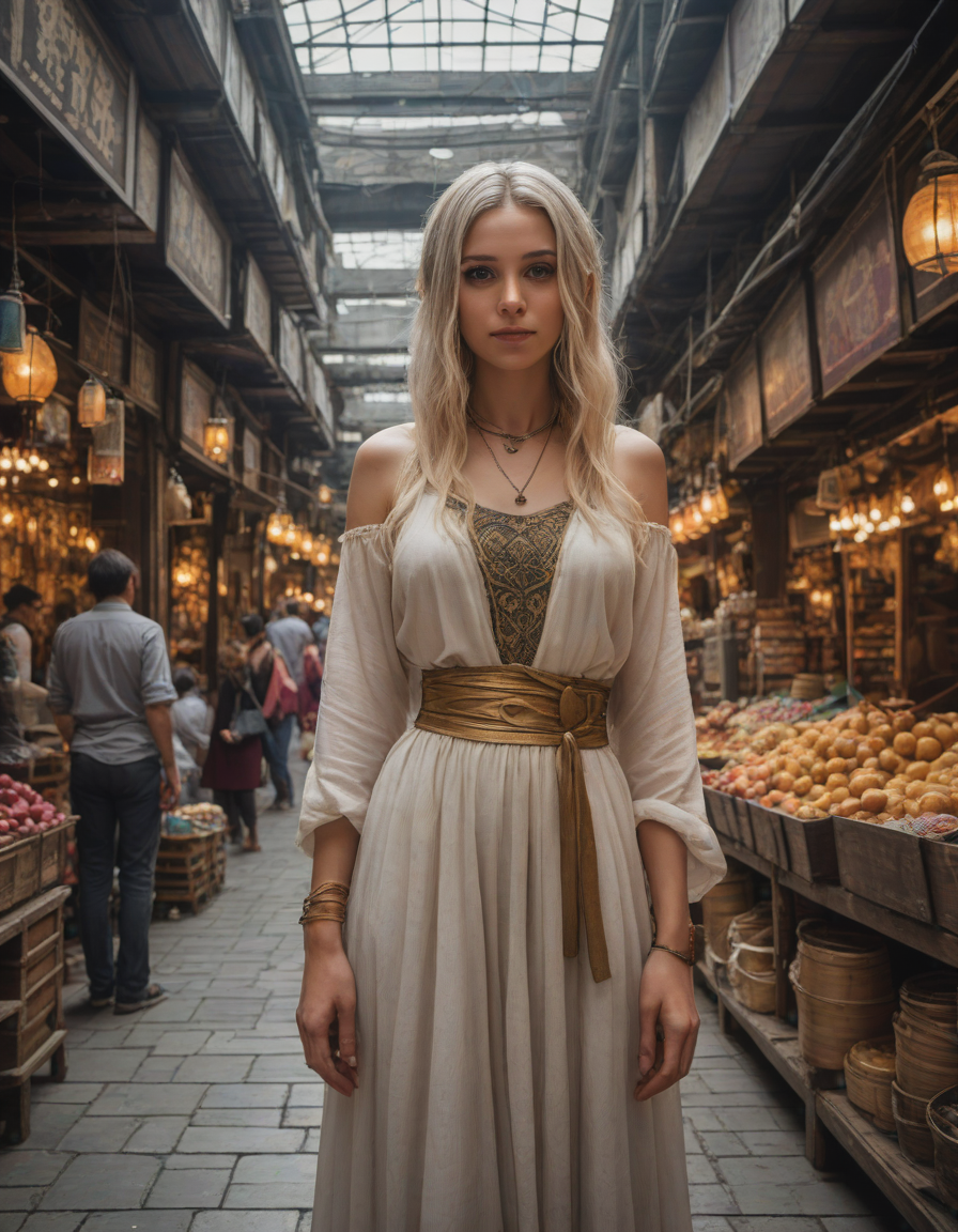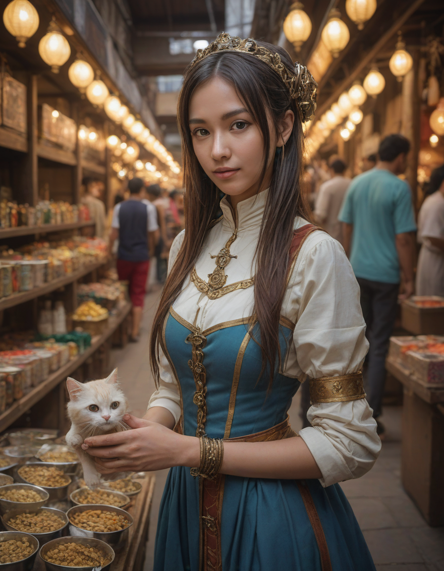 Serene complexity in subjects portrayed, wearing cosplay outfit, strolling through a bazaar, Glistening in the light of a thousand candles