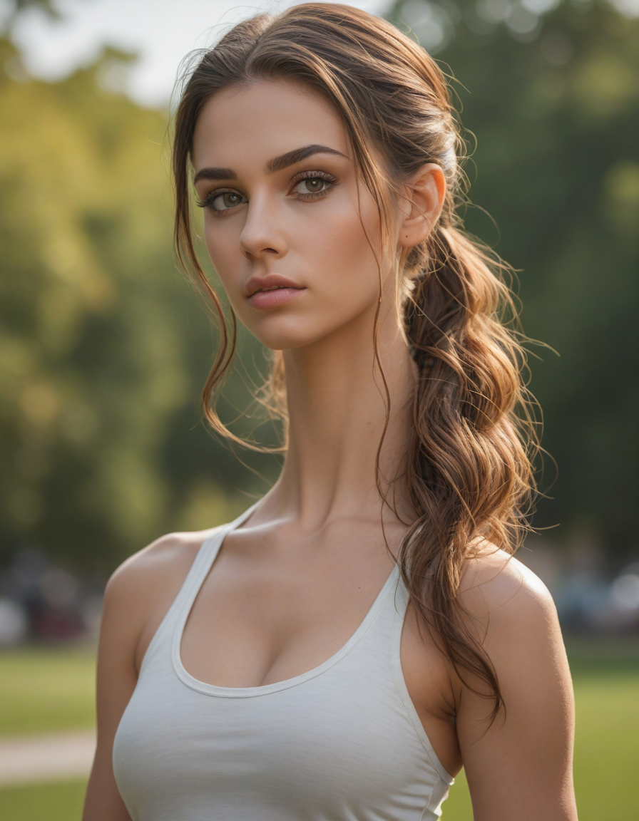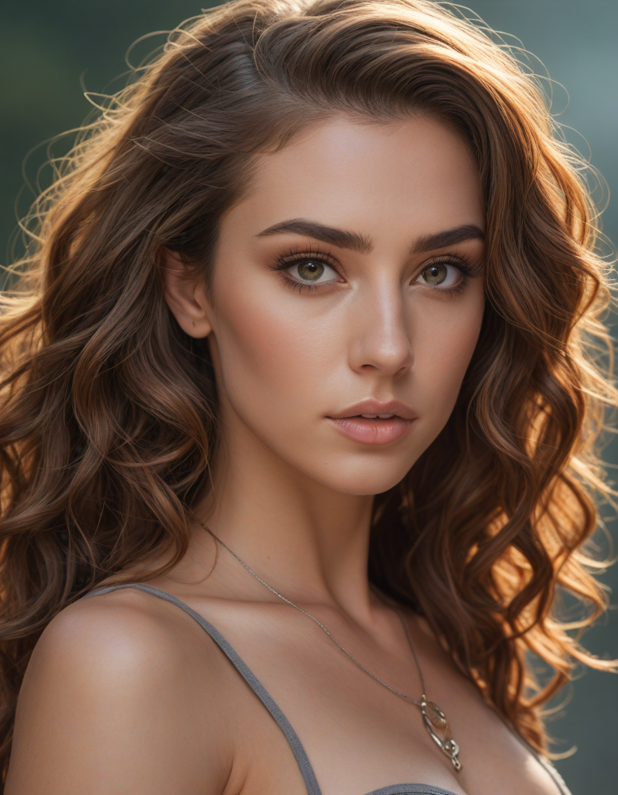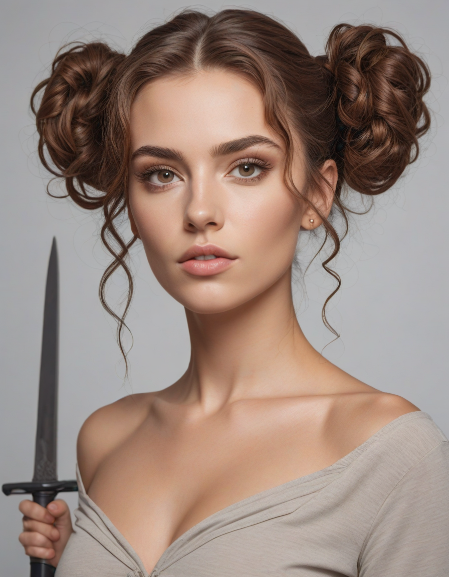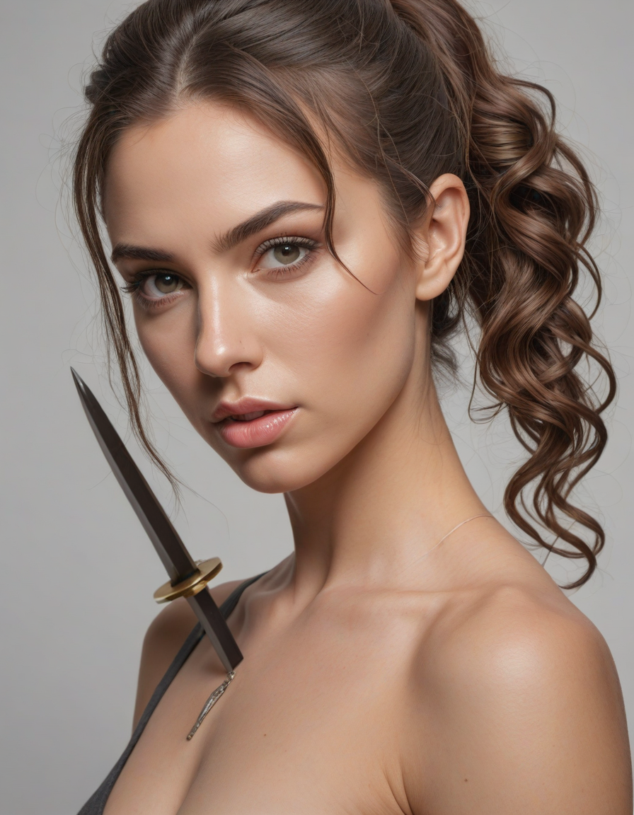 Grizzly bear, voluminous, curly locks, 2000s indie art style, muscles flexing, Holding a sword in both hands in a confident pose, detailed grip, detailed fuller, detailed pommel, detailed blade, detailed edge, , with a ponytail, extremely detailed, High-arched eyebrows, pronounced cheekbones, very thick full lips, thick full lips, lip fillers, narrow facial structure, small chin, pointed nose tip, deep-set eyes with visible upper eyelid space, prominent jawline, smooth forehead, elongated face shape, subtle eye creases, thin nose bridge, voluminous cheek appearance, defined lip contour, sculpted facial silhouette, soft nasolabial folds, high forehead, delicate ear shape, refined jaw angle, sleek facial contour, radiant skin texture, luminous eye reflection, sculpted eyebrow tail, accentuated cupid's bow, pronounced chin dimple, light-catching cheek highlight, defined eyelid crease, long eyelashes, symmetrical face balance, graceful neck line, airy eyebrow density, contoured cheek shading, polished skin finish, captivating gaze, structured nose profile, gleaming skin surface., lash extensions batting eyes, brunette