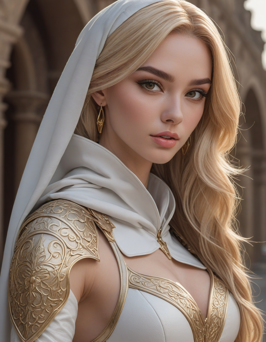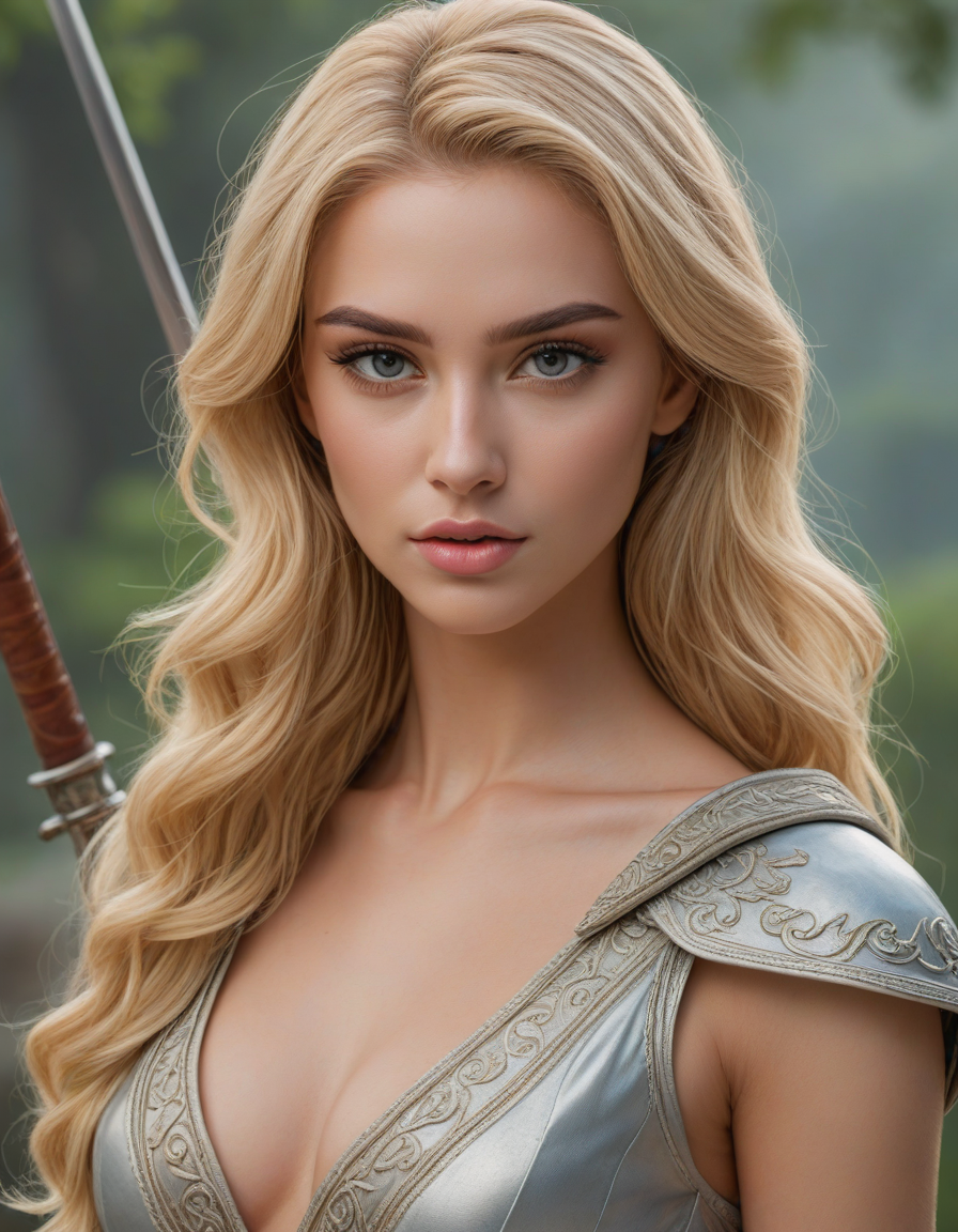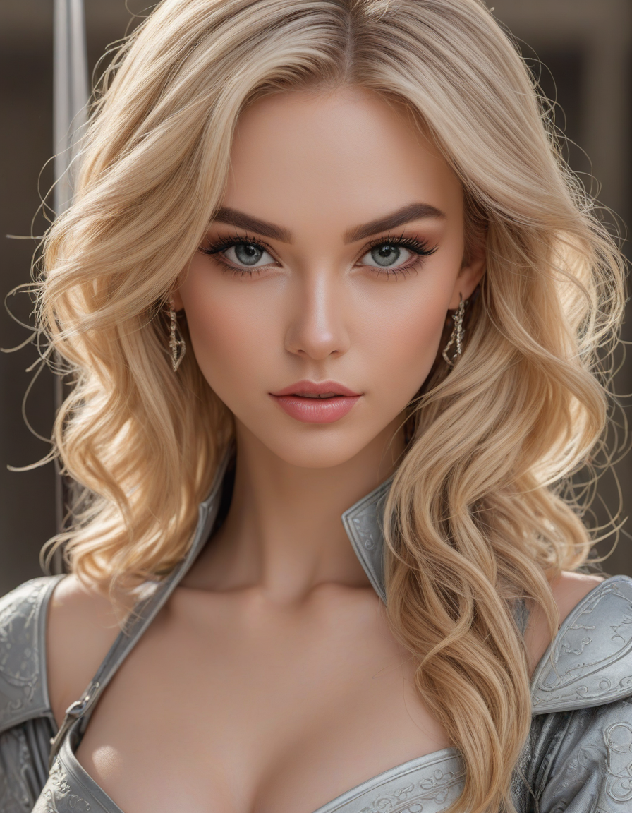 elegant, high waist tight overknee stiletto boots, looking at viewer, Wielding a one-handed weapon in both hands, one-handed weapon, weapon, , oval face shape, almond-shaped eyes, voluminous lashes, slightly arched eyebrows, narrow nasal bridge, rounded nose tip, symmetrical nostrils, full lips, pronounced cupid's bow, slightly fuller lower lip, defined cheekbones, rounded chin, smooth complexion, softly contoured jawline, balanced facial proportions, symmetrical features, gently curved eyelids, soft brow ridge, harmonious cheek to jawline transition, subtle philtrum, delicate ear lobes, straight blonde hair, clear skin, hooded eyelids, light pink lip color, slightly pouty expression, casual pose with hand on face, slight head tilt, indoor lighting, Light blue irises, Medium-thickness eyebrows, Softly angled eyebrows, A hint of freckles across the nose and cheeks, Natural makeup, Gentle frown lines between the eyebrows, Soft nasolabial folds, Smooth forehead, Subtle dimple on the chin, Clear facial contour without distinct shadows, Even skin tone with a hint of natural pink undertones, Slightly rosy cheeks, Tapered jawline, Fine hair texture with gentle waves, Youthful appearance with soft facial features, Holding a sword in both hands in a confident pose, detailed grip, detailed fuller, detailed pommel, detailed blade, detailed edge,