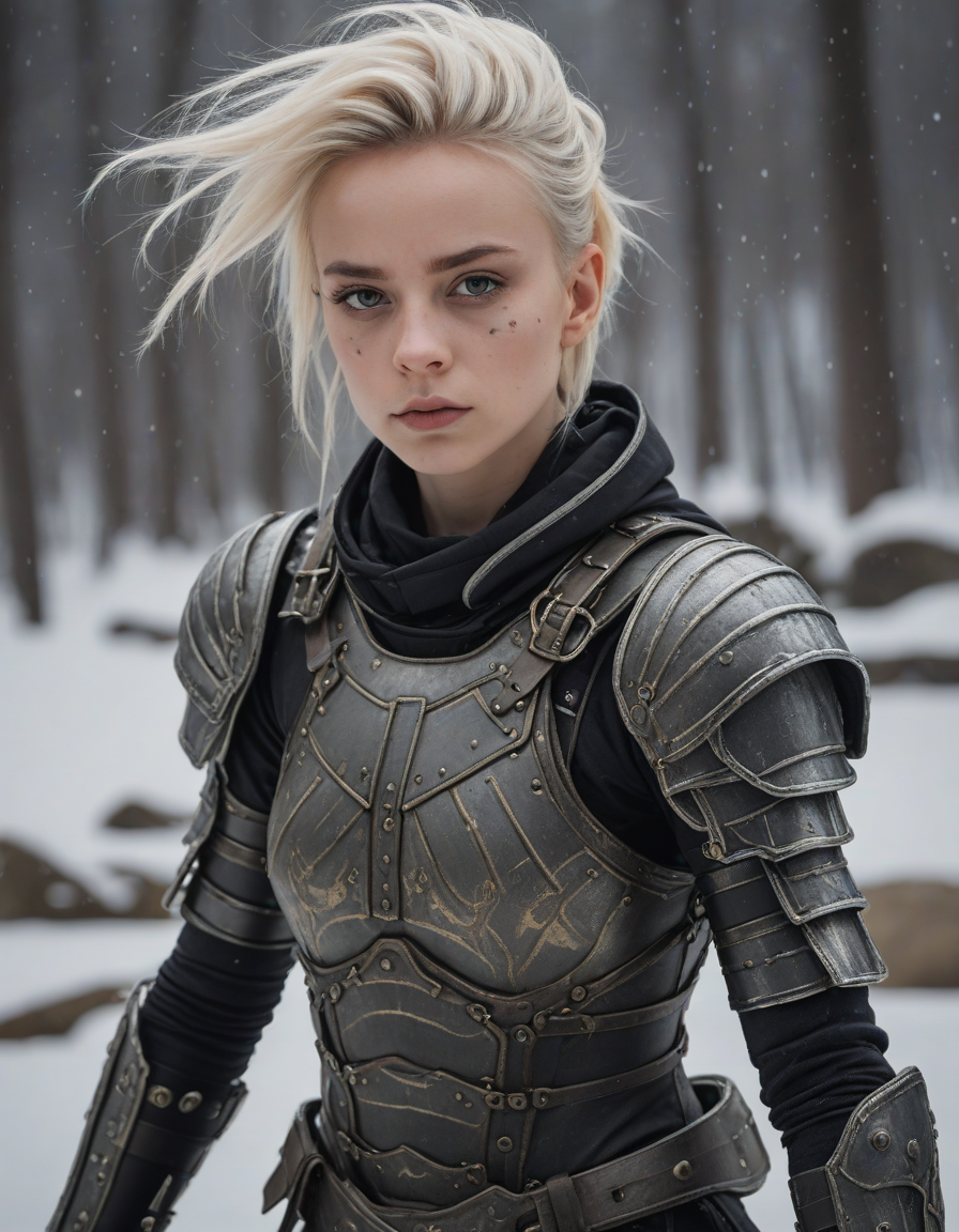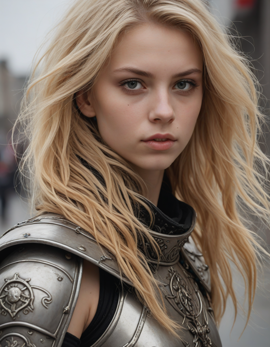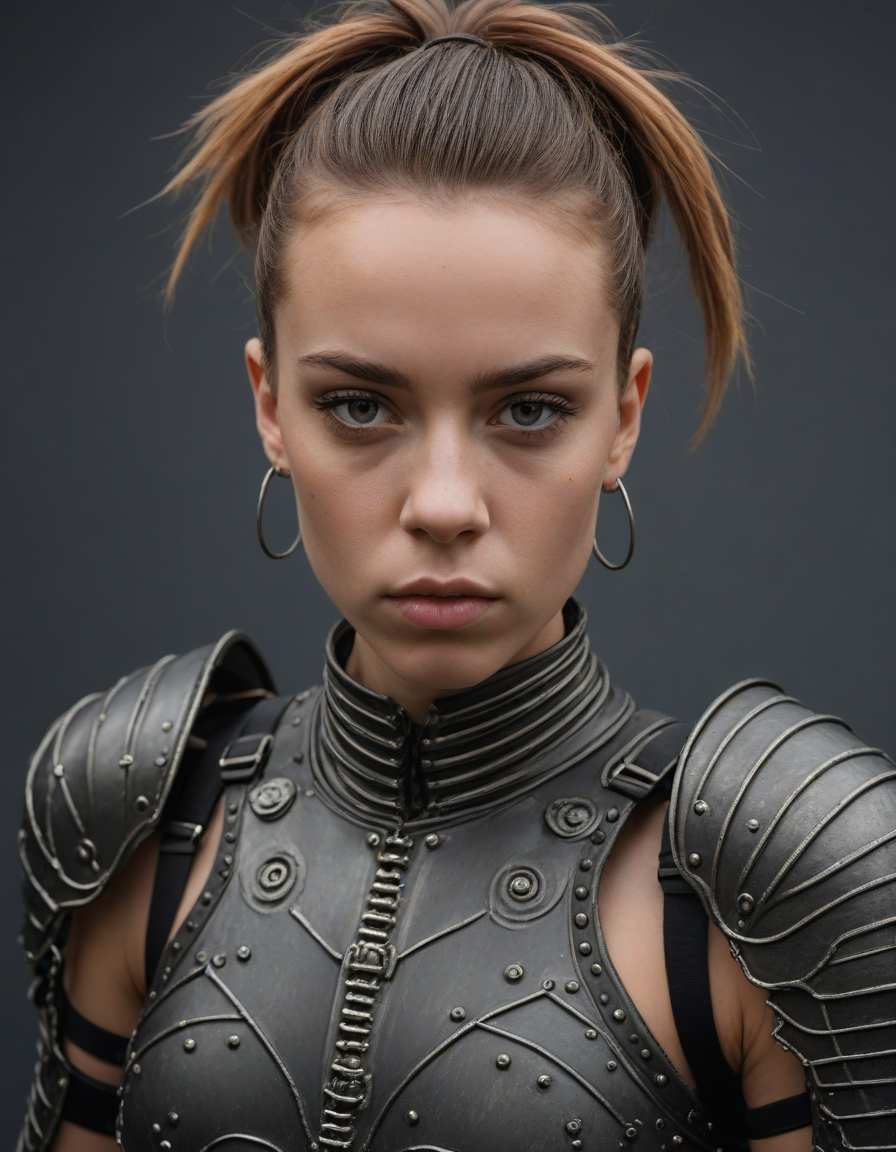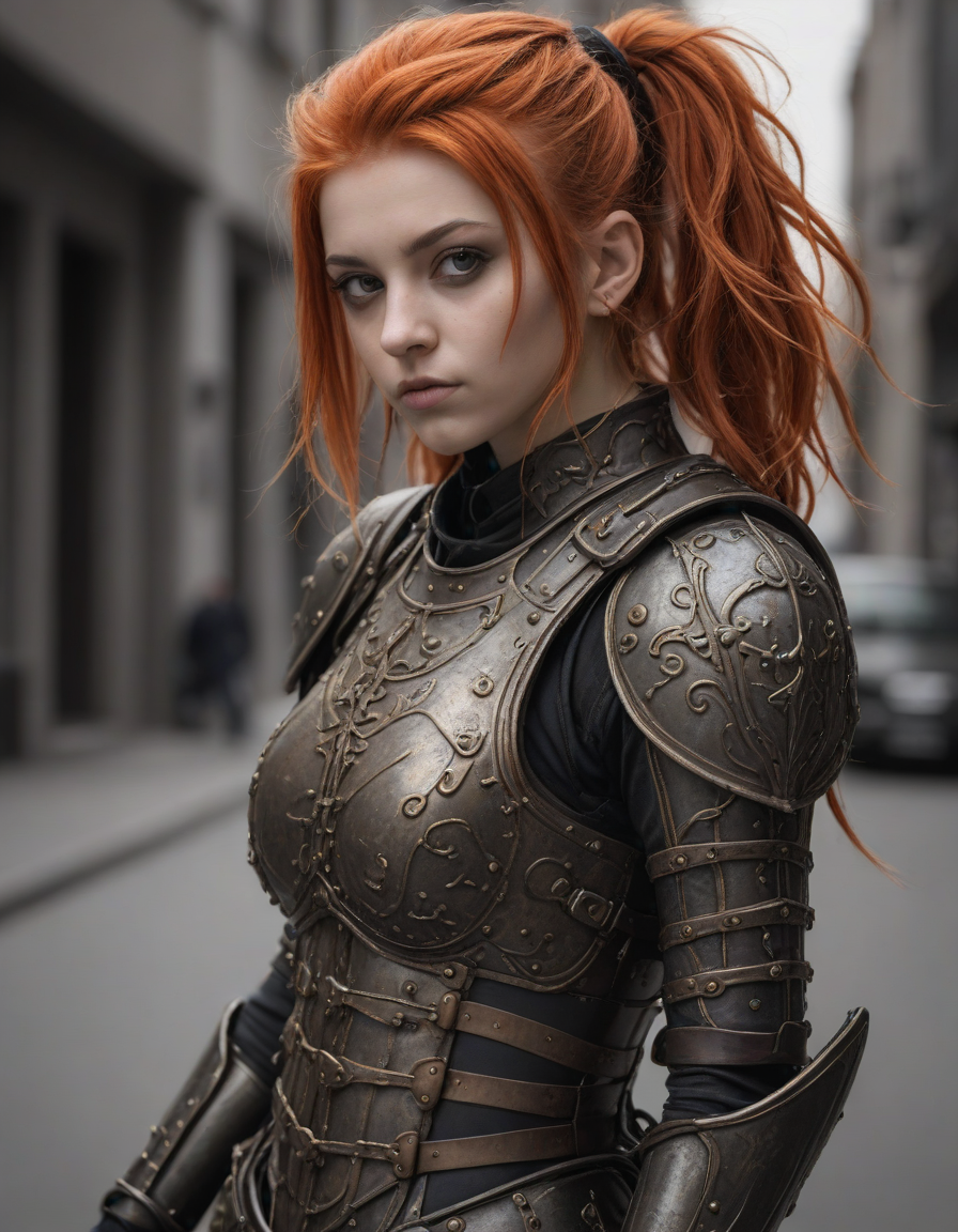 a startling contrast, wearing heavy armor, A coy glance from beneath long lashes, skater punk
