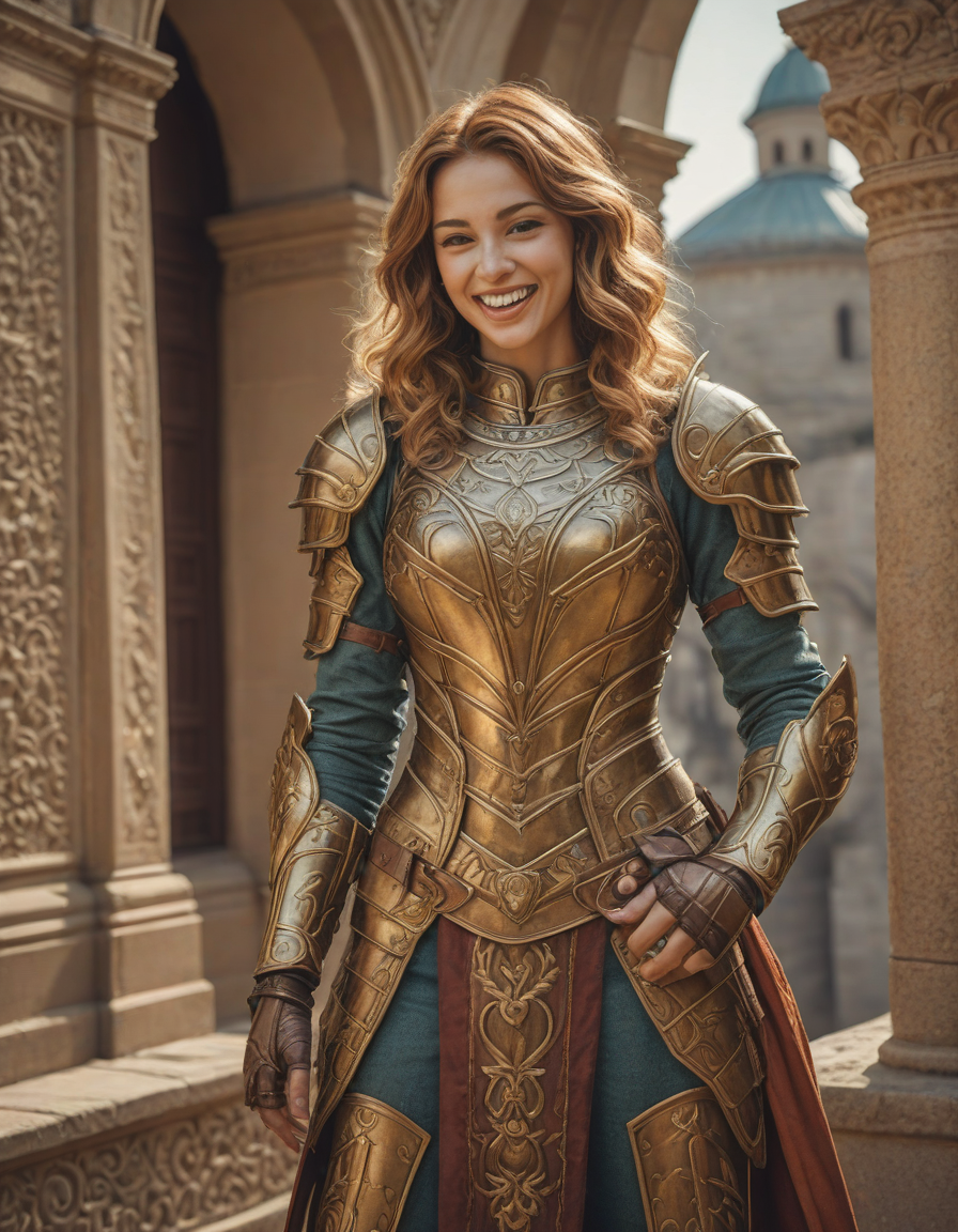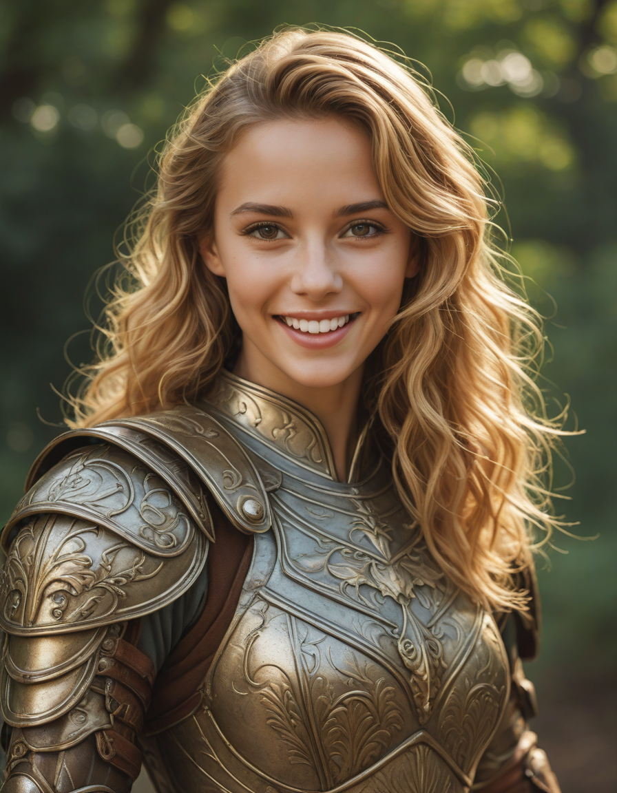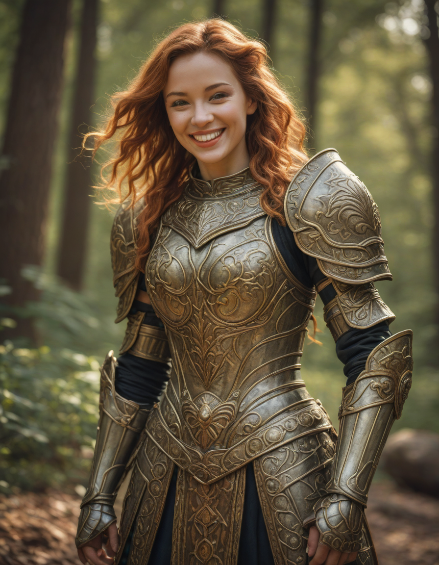 joyful laughing expression, eyes crinkled with mirth, action, highly detailed texture, curious, engaged, eager expression, smooth brushstrokes, art nouveau, elegant curved lines, nature-inspired motifs, 1980s retro aesthetic, vintage filters, bold graphic designs, wearing complete set of armor, wearing full armor, Wearing chest armor, wearing leg armor, wearing feet armor, wearing bracer, wearing pauldrons,