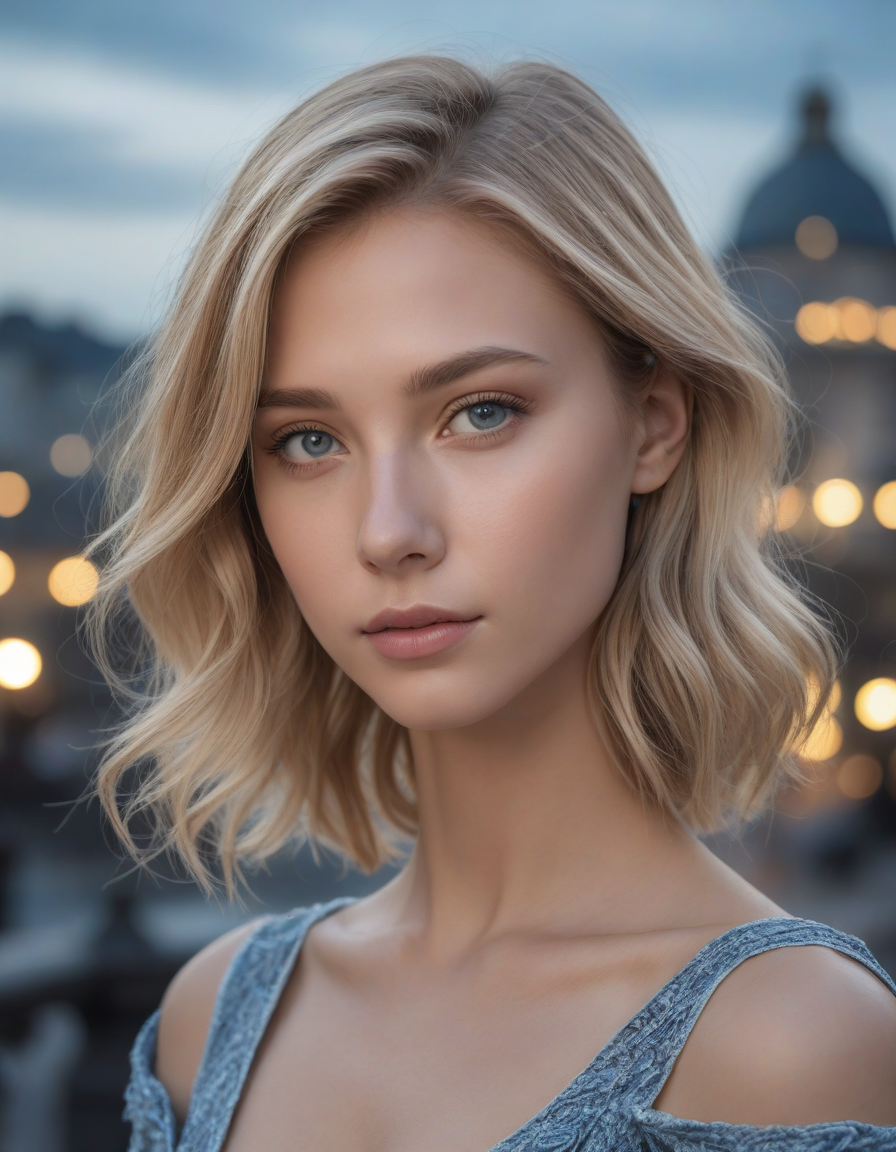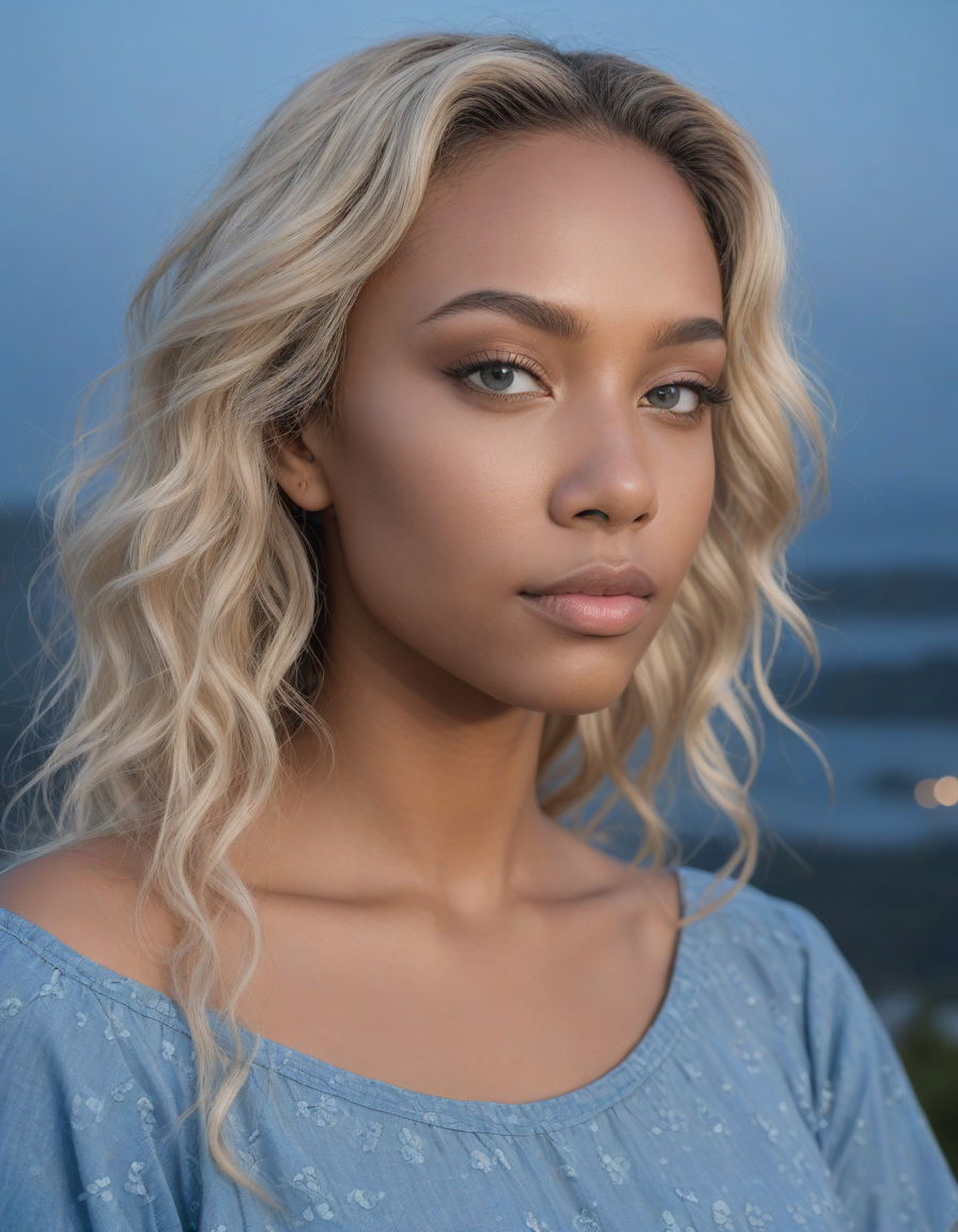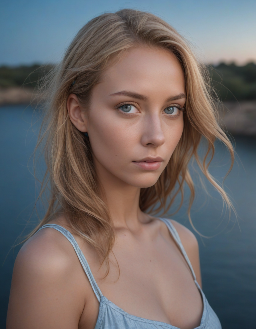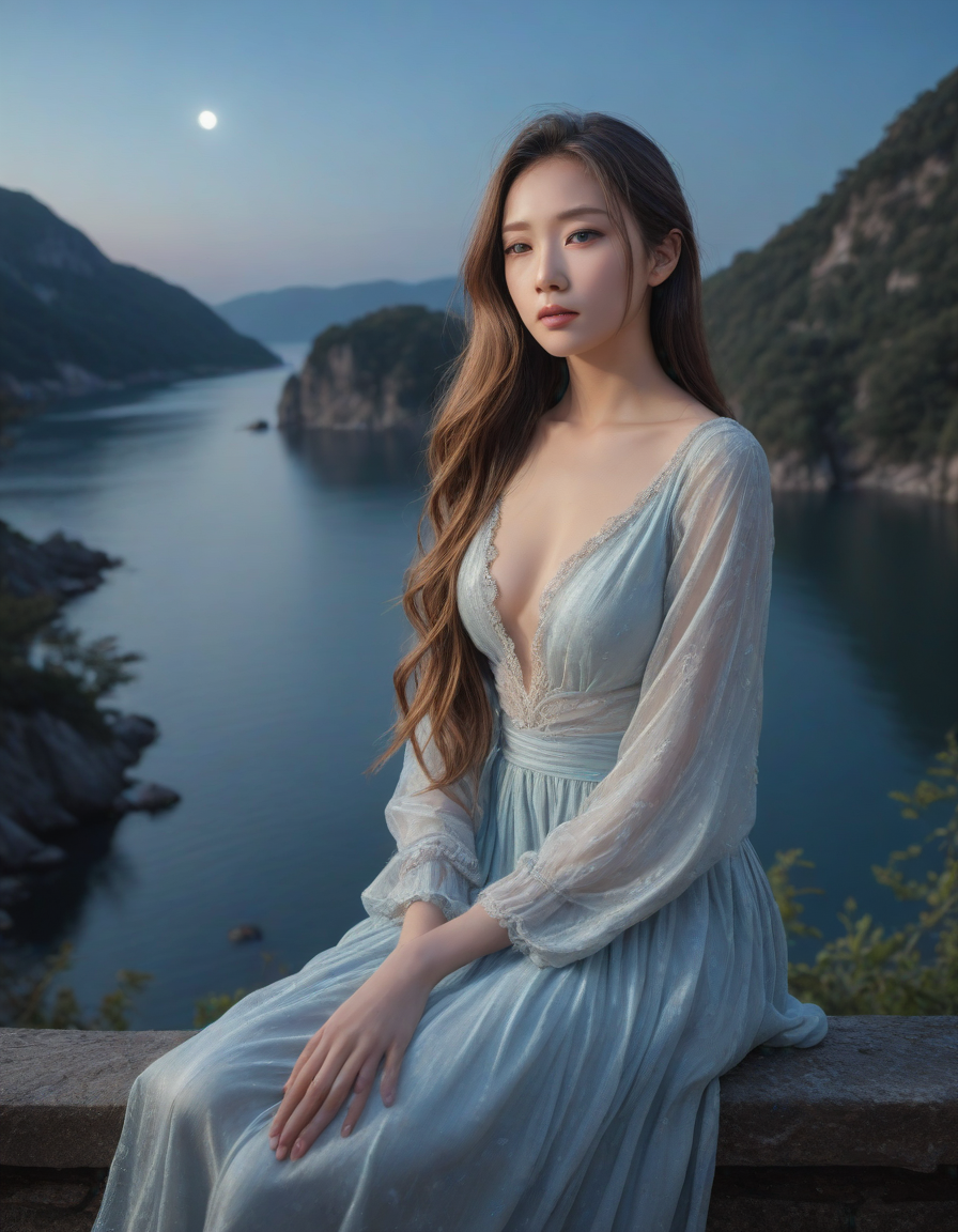 Glistening in moonlight, flawless beauty, light blue colored iris pigment, light blue colored eyes, blue-iris-color, blue-eye-color,, enjoying a scenic view, lost in thought