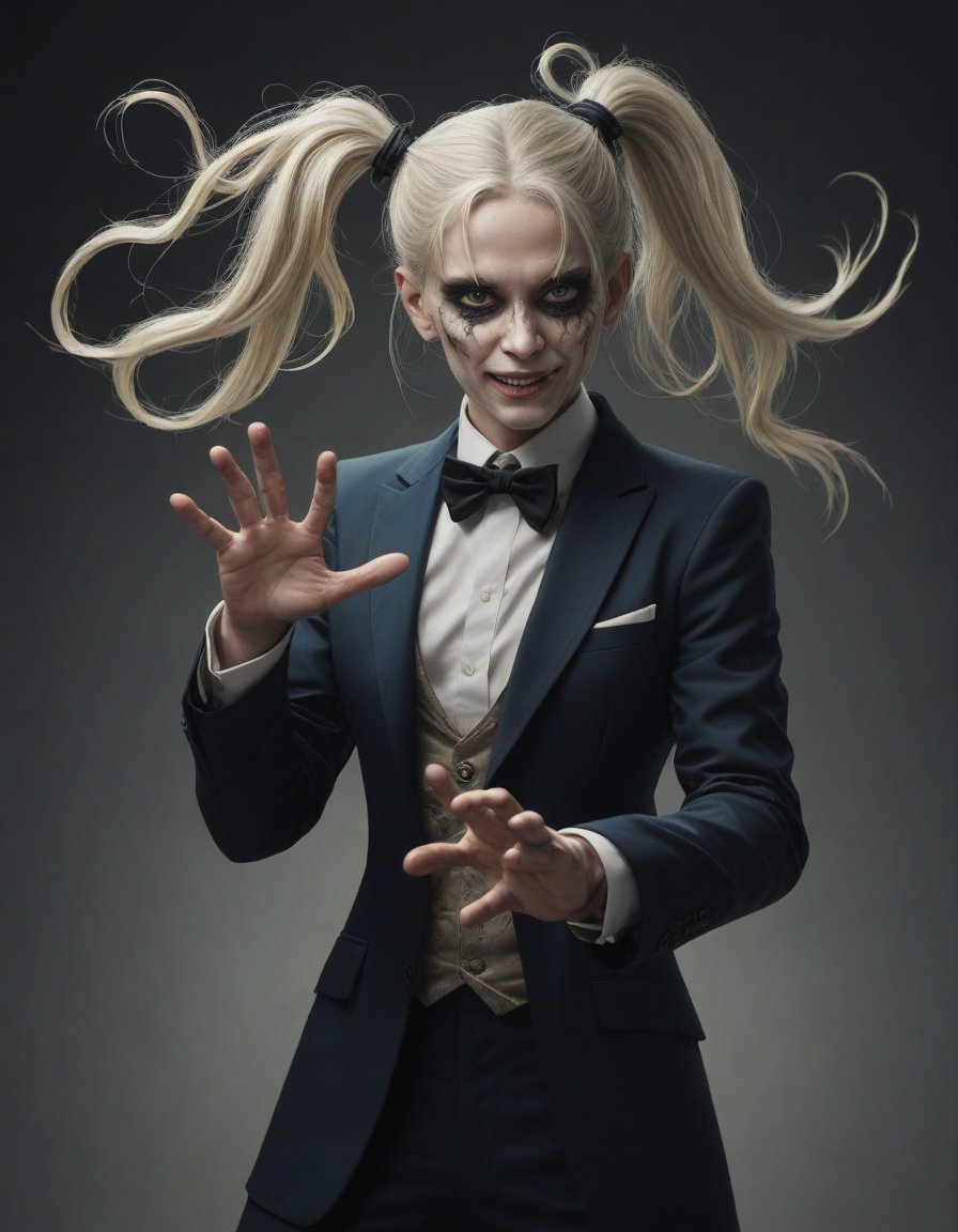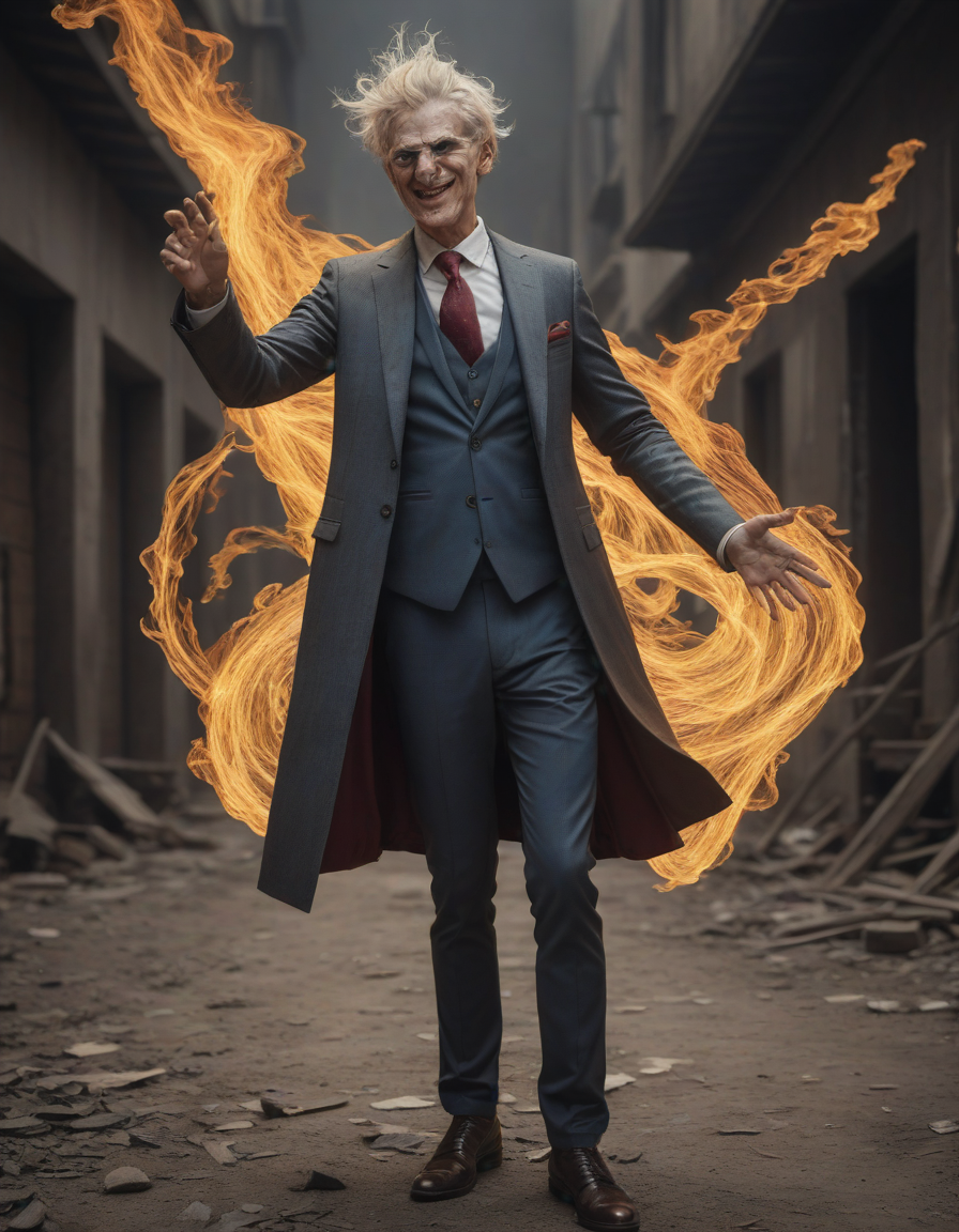 superhero, trollface, outstretched hand, wrapped in silk, Gloating triumphantly, casting a spell, wearing a sharp, tailored suit, Distorted, scorched earth, aesthetic