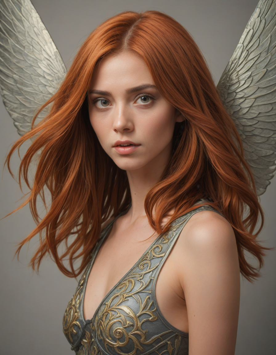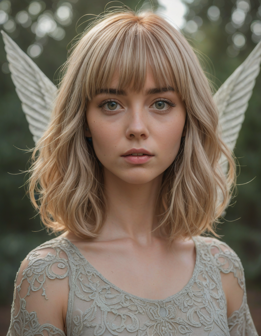 , eyes wide open, gripped by an emotion, vaporous swirls, Mystical being with iridescent wings, symetrical