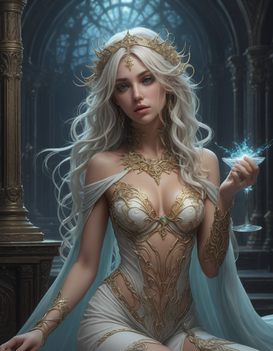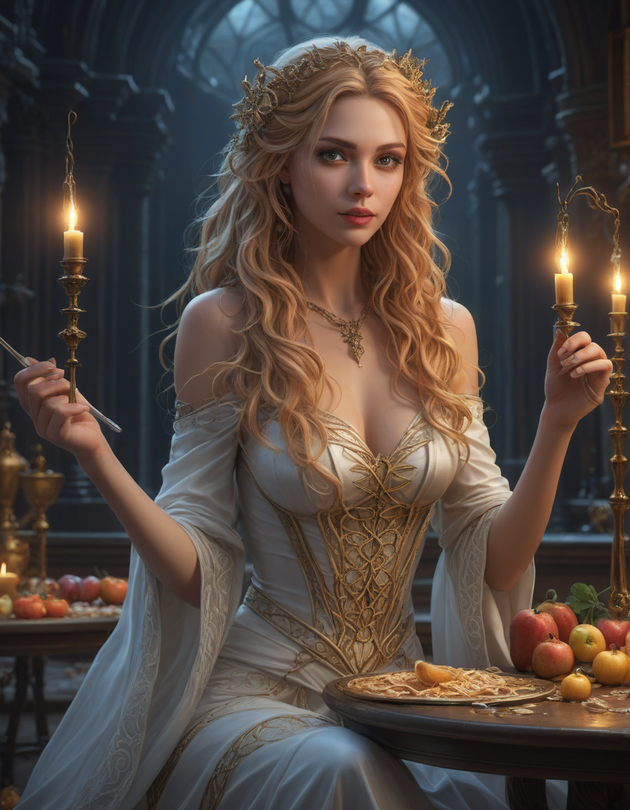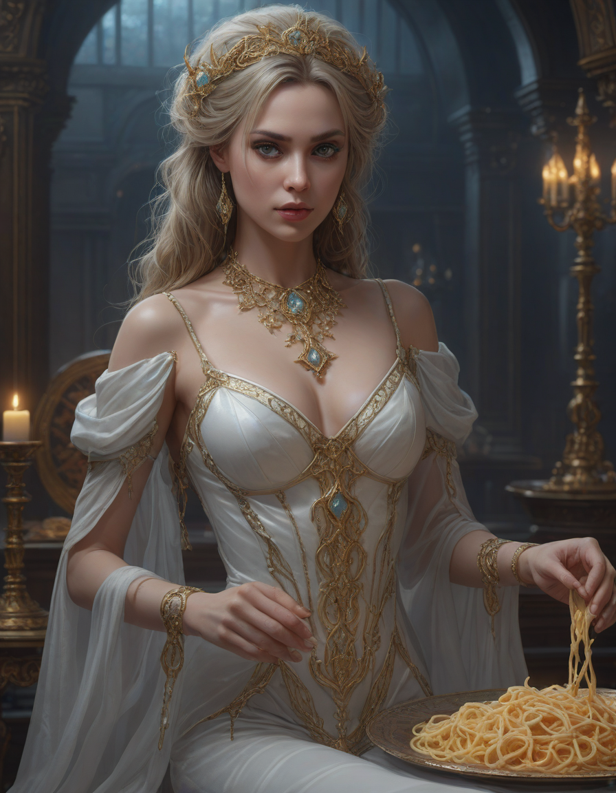 ethereal fantasy concept art, Highly Detailed, Extremely High Quality, Drawing, Digital Art, by Brom, Larry Elmore, Keith Parkinson, Sakimichan, Artgerm, Brom fantasy art, Elmore's epic art, Parkinson's art Sakimichan's ethereal art, Artgerm's dynamic figures, vivid color use, dreamlike textures, digital brush sophistication, mythical themes, energy vibrance, fantasy immersion, intricate, high detail, digital artwork, illustrative, painterly, matte painting, highly detailed, magnificent, celestial, ethereal, painterly, epic, majestic, magical, fantasy art, cover art, dreamy, ethereal fantasy concept art, glow effects, godrays, Hand drawn, render, 8k, octane render, cinema 4d, blender, dark, atmospheric 4k ultra detailed, cinematic, Sharp focus, big depth of field, Masterpiece, colors, 3d octane render, 4k, surreal worlds, mystical lighting, rich backgrounds, world-building excellence, expressive faces, action dynamics, magical realism, atmospheric mood, visual storytelling, fantasy architecture, motion fluidity, character depth, otherworldly beauty, magic elements, lush landscapes, color contrasts, concept art, trending on artstation, hyperrealistic, Vivid colors, extremely detailed CG unity 8k wallpaper, trending on CGSociety, Intricate, High Detail, dramatic, artist Brom, Gerald Brom, Larry Elmore Art, Keith Parkinson Art, detailed anatomy, , evil bride, eating spaghetti, dressed impeccably, sipping fine wine in a chic lounge, magical, enchanted, sparkling snowflakes, electrifying aether spiraling about