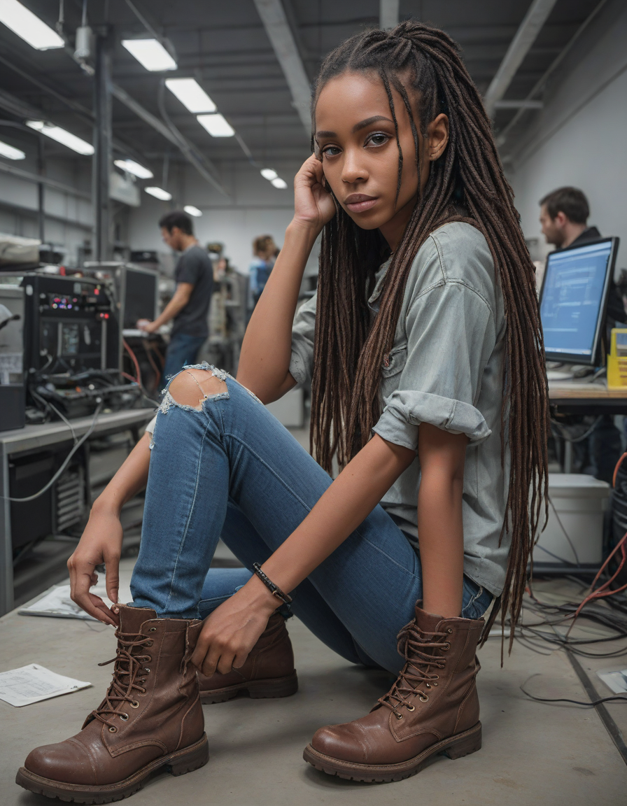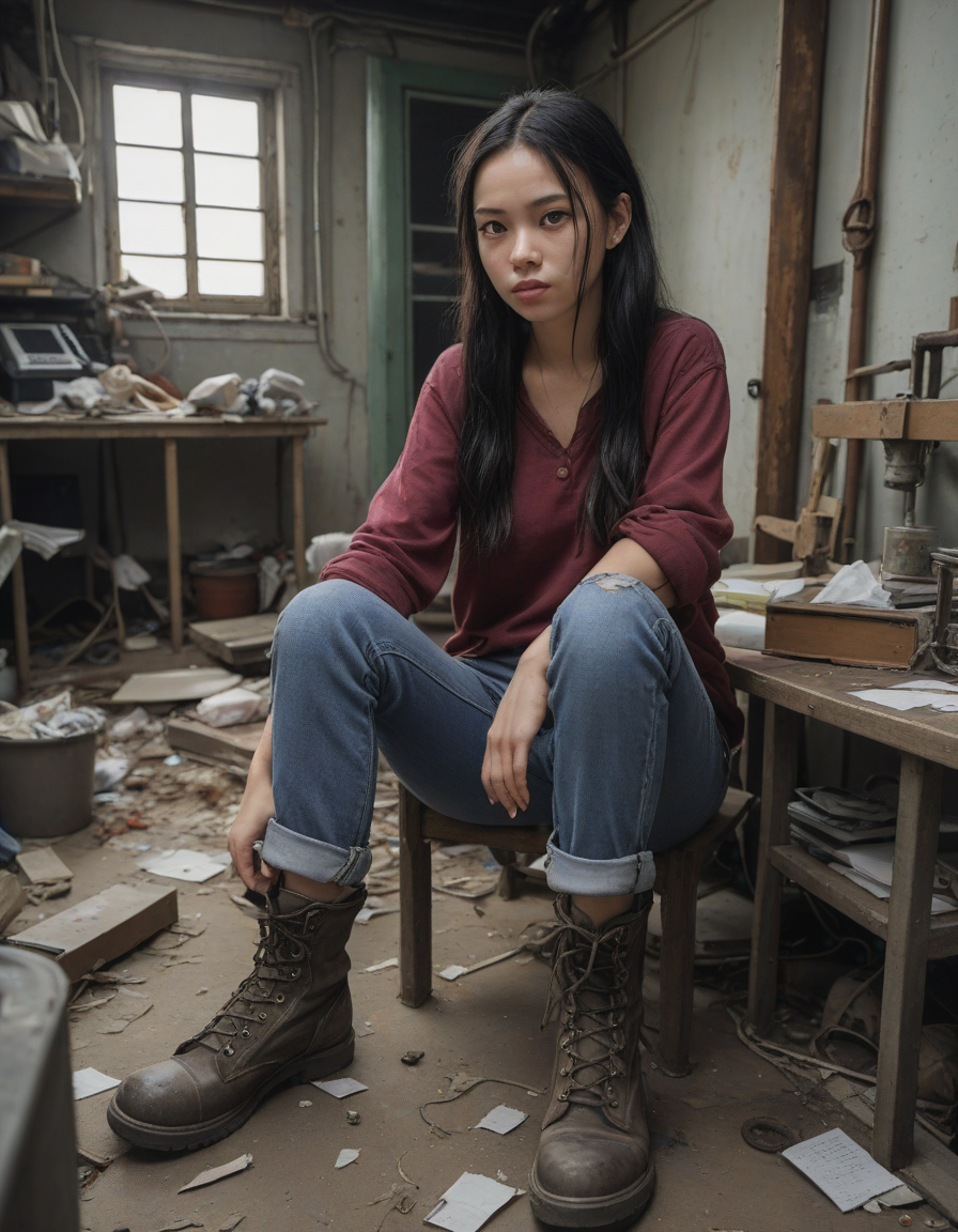 torn jeans and combat boots, Enigmatic, crimson-flecked eyes